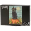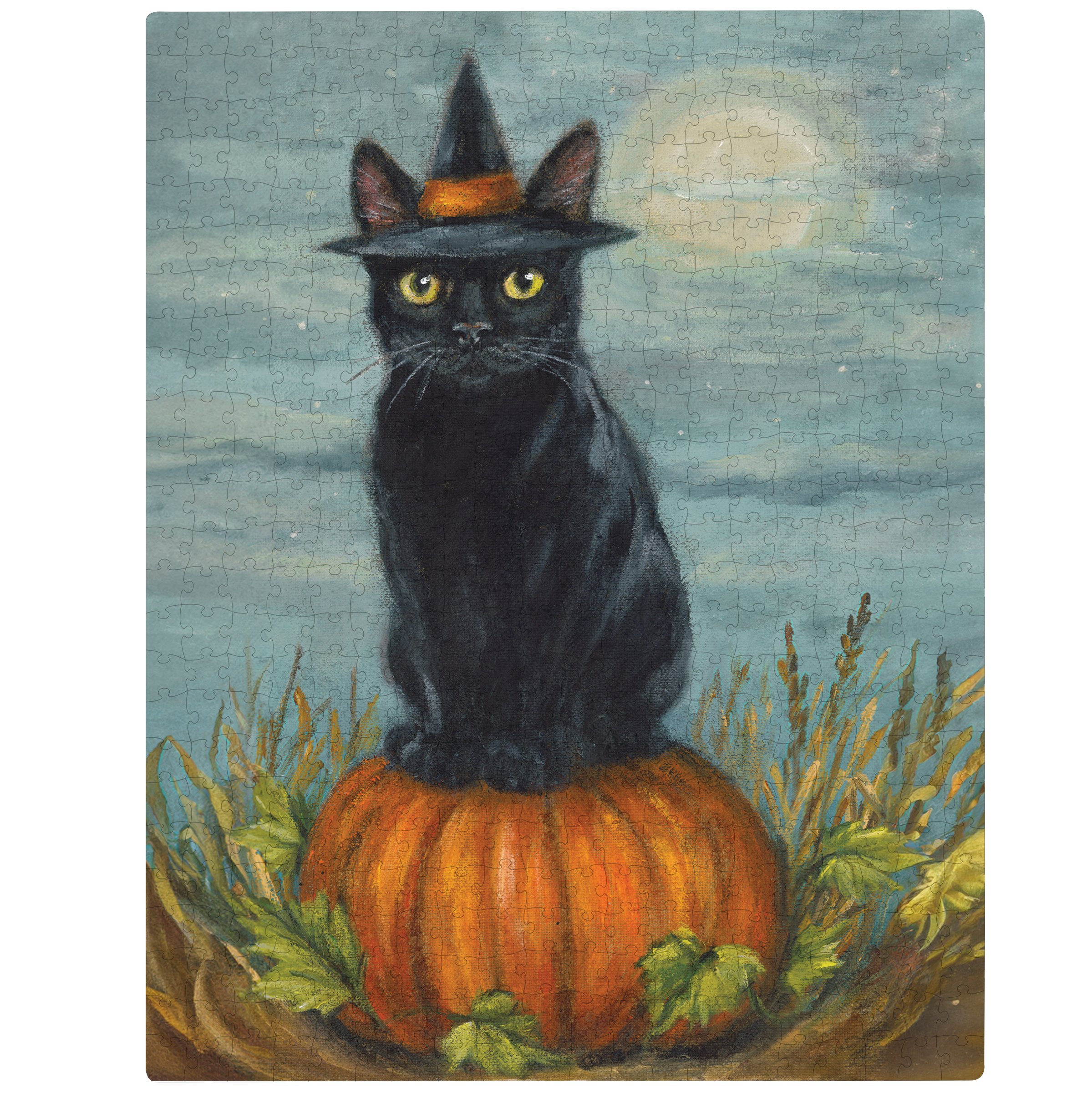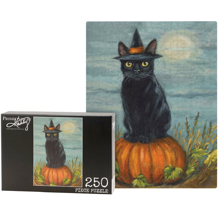 A 250 piece puzzle from our Halloween Collection displaying a charming scene of a black cat wearing a witch hat sitting on a pumpkin. Halloween black cat design is replicated from original artwork painted onto burlap canvas, giving the art a unique depth and texture. Puzzle pieces are packaged in a polybag and enclosed in a sturdy box with the full puzzle design displayed. Our Black Cat Witch 250 piece puzzle includes a print of full puzzle image for reference. Contains small parts; this is not a toy. A fun pet-themed Halloween puzzle great for gifting.
