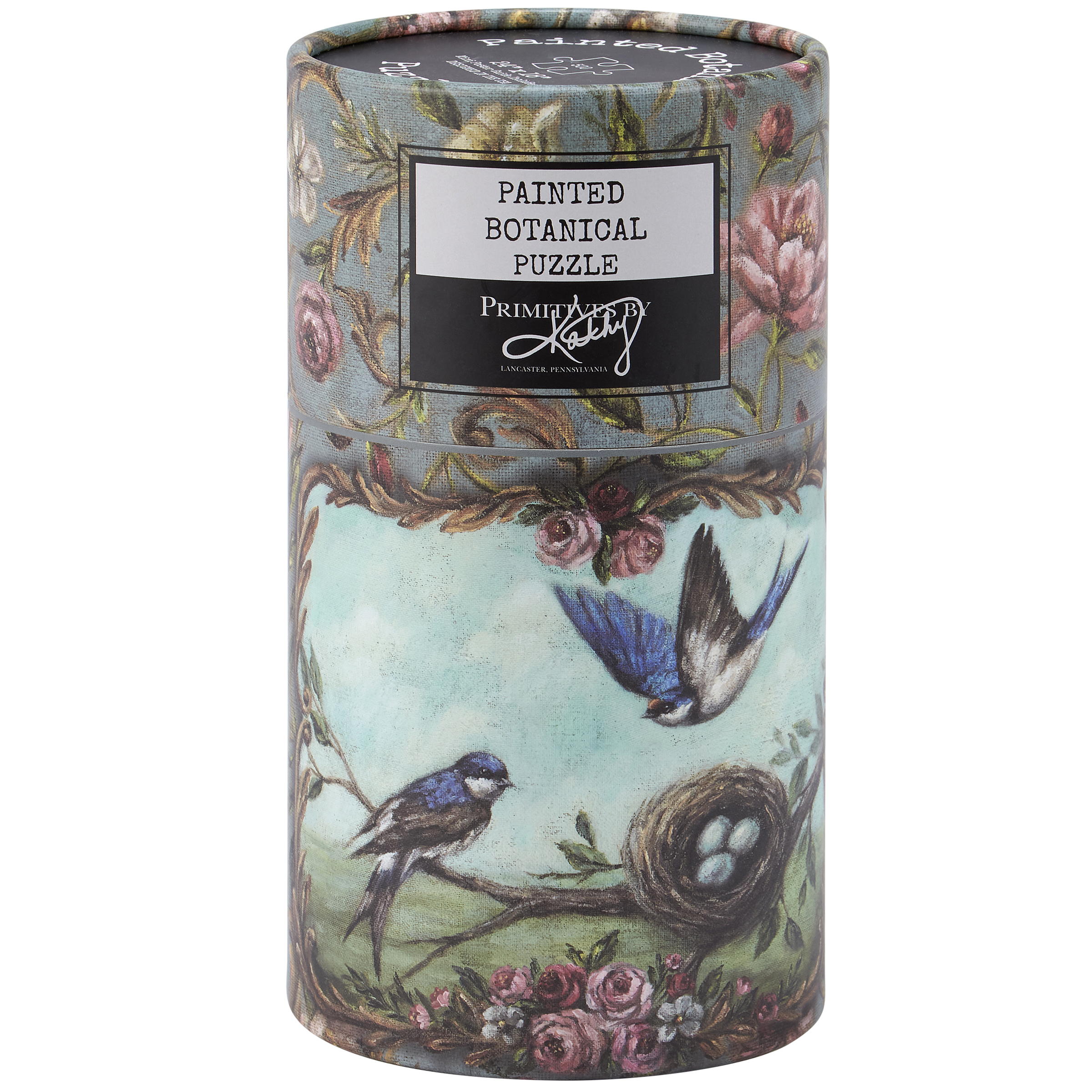 A 500 piece puzzle from our Art Nouveau Collection displaying an art nouveau inspired scene of blue swallows with a floral border. Nouveau design is replicated from original artwork painted onto burlap canvas, giving the art a unique depth and texture. Puzzle pieces are packaged in a resealable plastic bag and enclosed in a cylindrical box with the design displayed around outside and a descriptive "Painted Botanical Puzzle" sentiment on lid. Our Blue Swallows 500 piece puzzle includes a printout of full puzzle image for reference. Contains small parts; this is not a toy. A vintage-themed puzzle great for gifting.