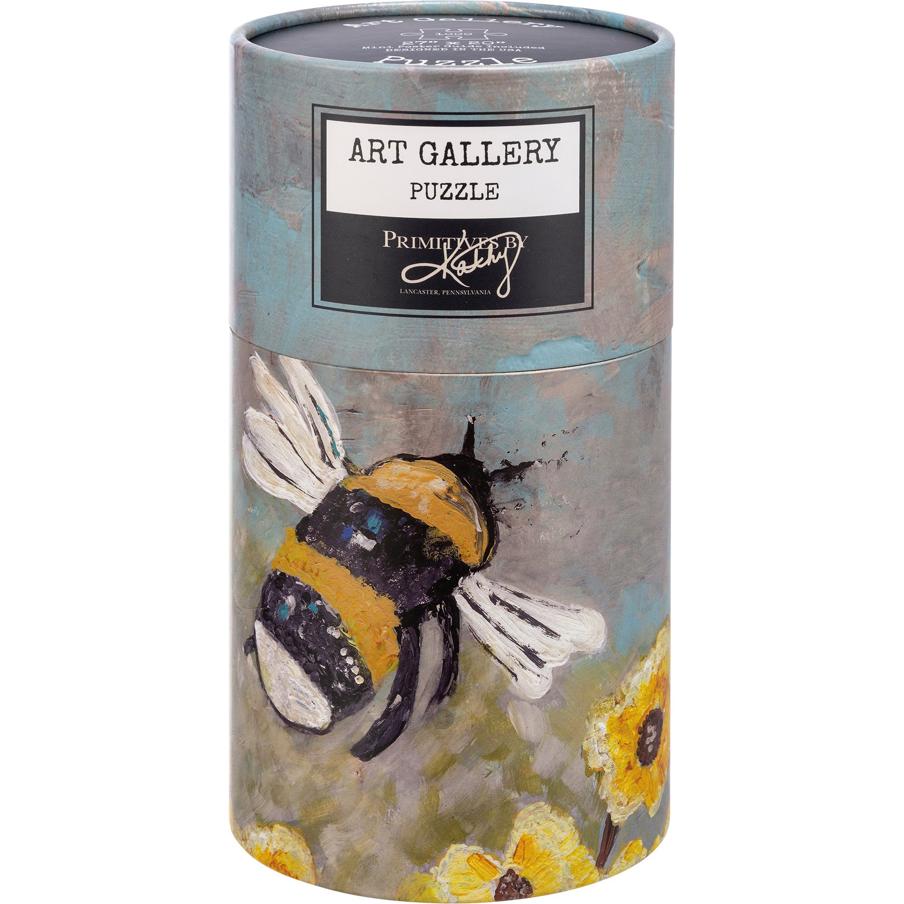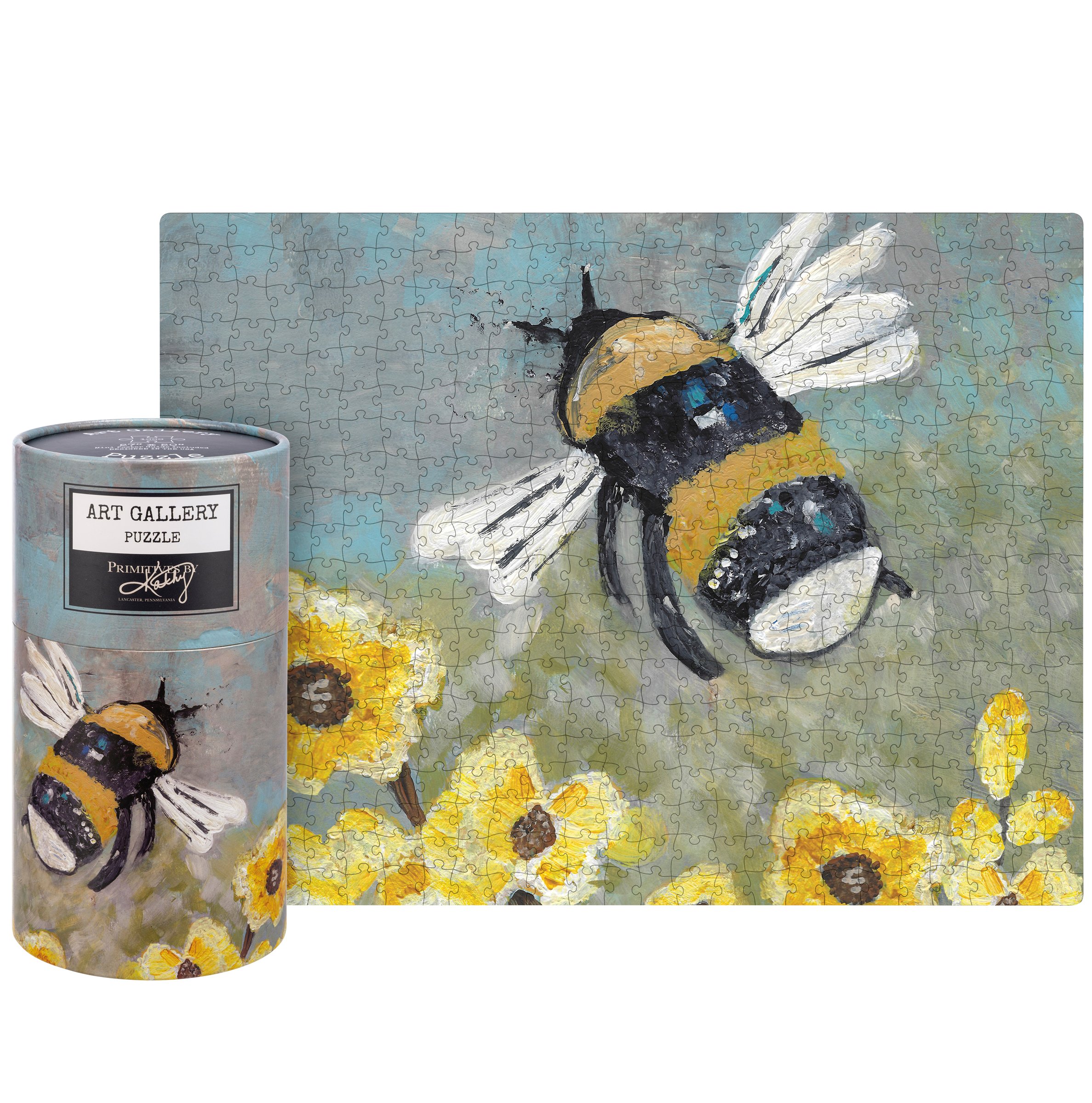 A 1,000 piece puzzle featuring bumblebee and sunflower designs. Design is replicated from original art created at the Friendship Heart Gallery in downtown Lancaster, PA by artists with intellectual disabilities and autism. Puzzle pieces are packaged in a resealable plastic bag and enclosed in a cylindrical box with a full wrap-around design and a descriptive "Art Gallery Puzzle" sentiment on lid. Our Bumblebee puzzle includes a 10" x 8" printout of full puzzle image for reference.