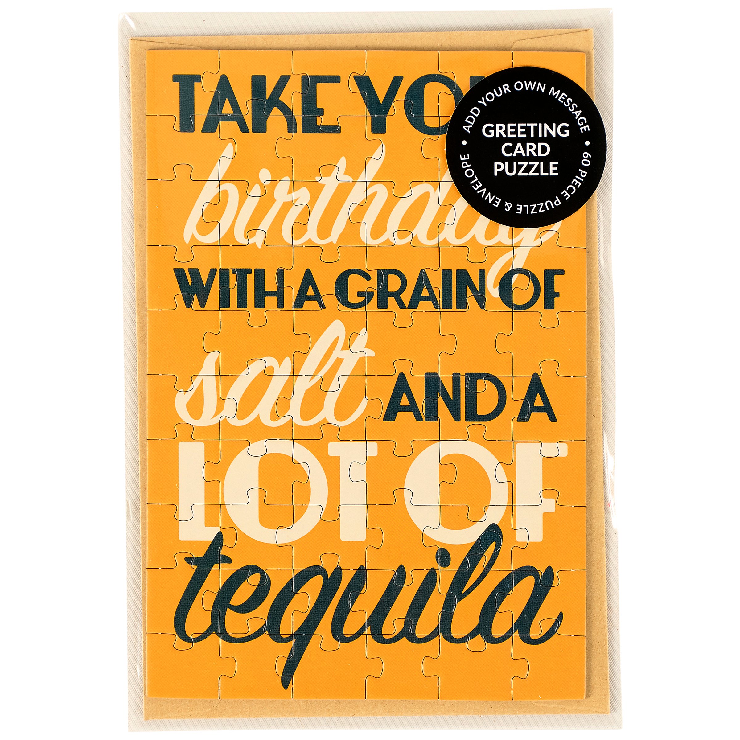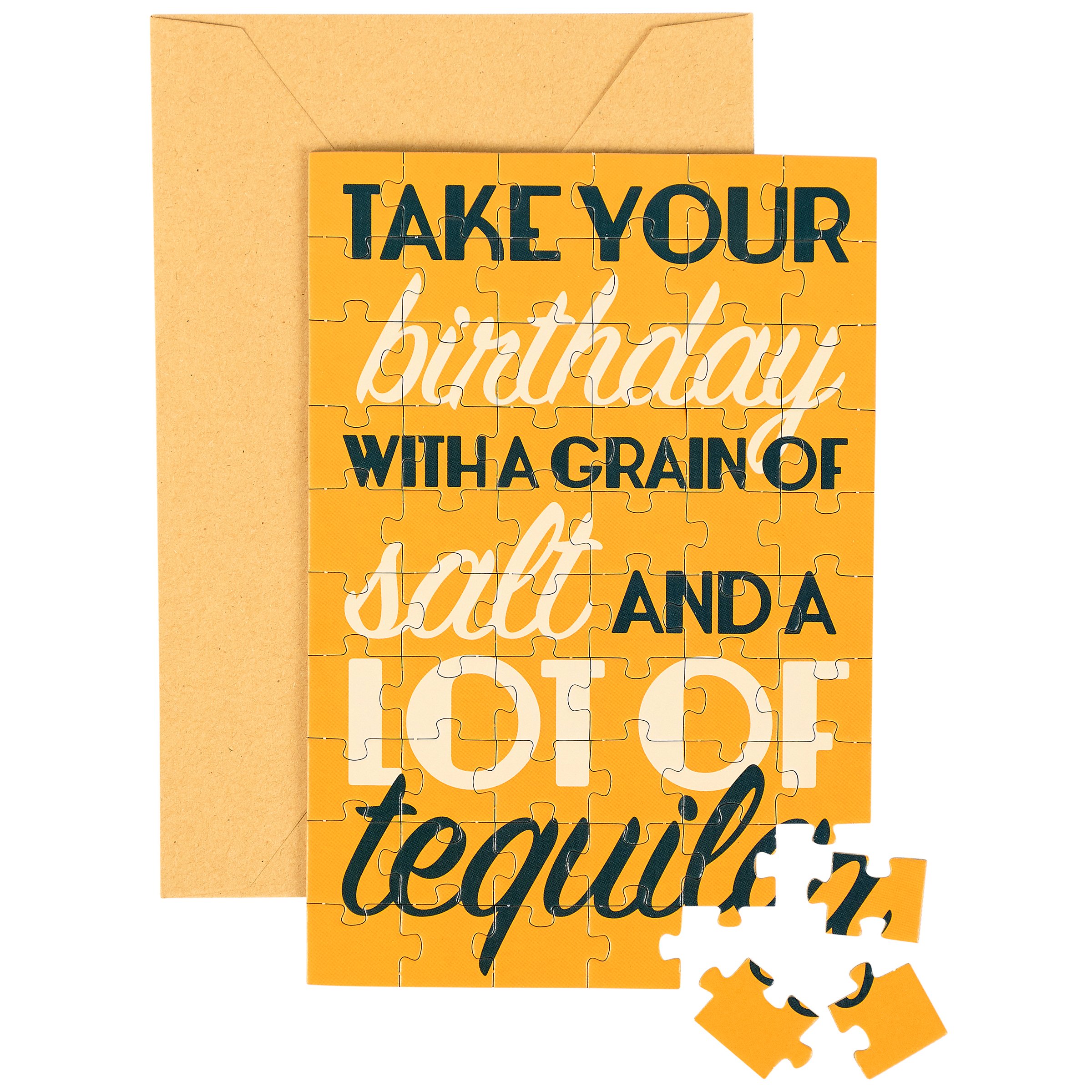 Don't just give your feelings away, make 'em work for it. This relatable greeting card puzzle combines the feels of receiving a birthday card with the satisfaction of completing a puzzle! Questionables puzzle cards include a blank space on the back to write a personal message or express creativity in any way you want before breaking up the puzzle for someone special to piece together the fun inside! We get you started with a funny birthday sentiment in a bold style on the front that reads "Take Your Birthday With A Grain Of Salt And A Lot Of Tequila." Do your thing on the back, punch out the 60 pieces, and place them in the included envelope. Everything is packaged in a polybag with an insert displaying easy-to-follow instructions. Due to the shape and weight, extra postage is required when mailing puzzle cards. Our A Grain Of Salt puzzle card offers a fun relatable way to wish family or friends a happy birthday letting them know that everyday life can be hard, but we got this.