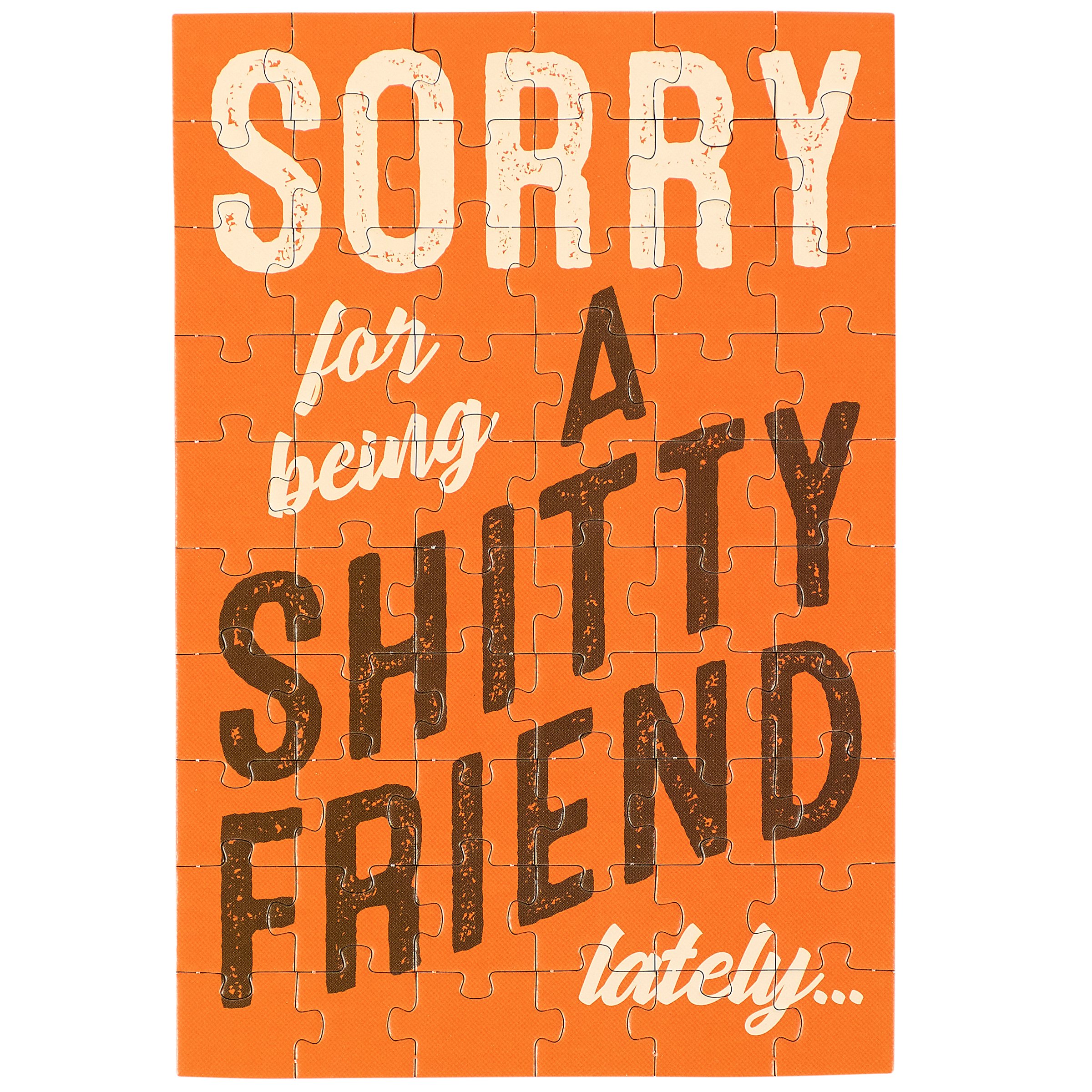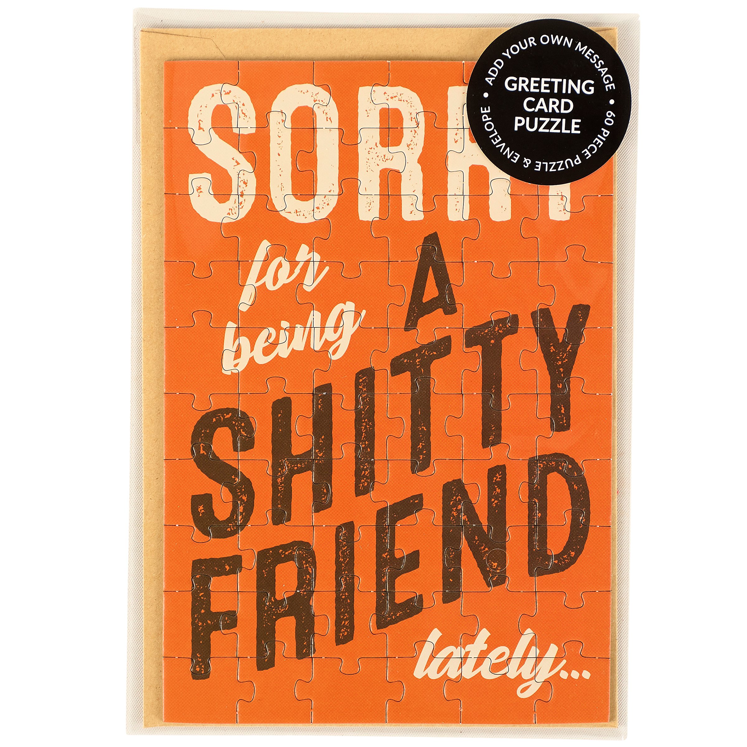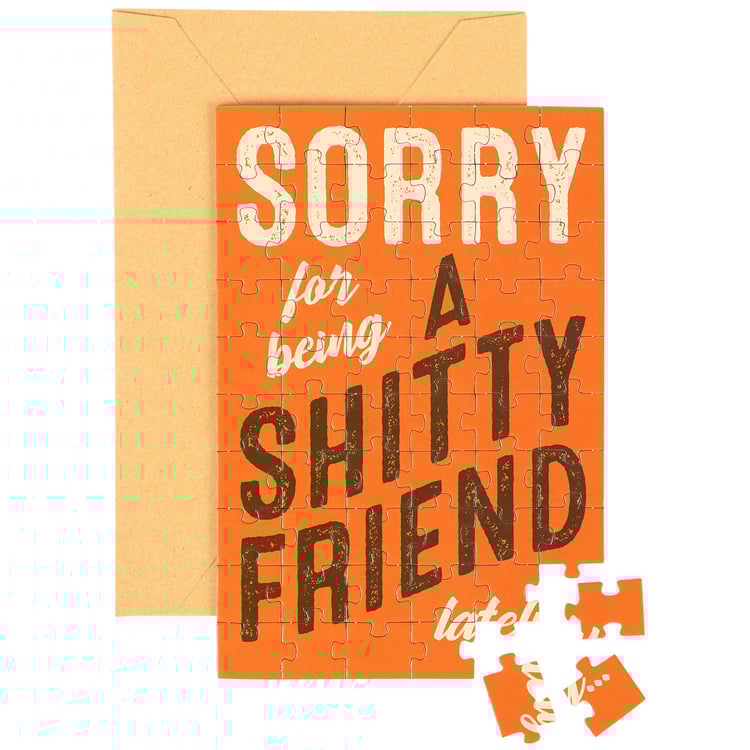 Don't just give your feelings away, make 'em work for it. This relatable greeting card puzzle combines the feels of receiving a card with the satisfaction of completing a puzzle! Questionables puzzle cards include a blank space on the back to write a personal message or express creativity in any way you want before breaking up the puzzle for someone special to piece together the fun inside! We get you started with a relatable apologetic sentiment on the front that reads "Sorry For Being A Shitty Friend Lately..." Do your thing on the back, punch out the 60 pieces, and place them in the included envelope. Everything is packaged in a polybag with an insert displaying easy-to-follow instructions. Due to the shape and weight, extra postage is required when mailing puzzle cards. There's no need to wait for a special occasion or a specific holiday, this everyday puzzle card is perfect for any moment you want to send a personal message. Our Being A Friend puzzle card offers a down-to-earth way to reach out to friends and family.