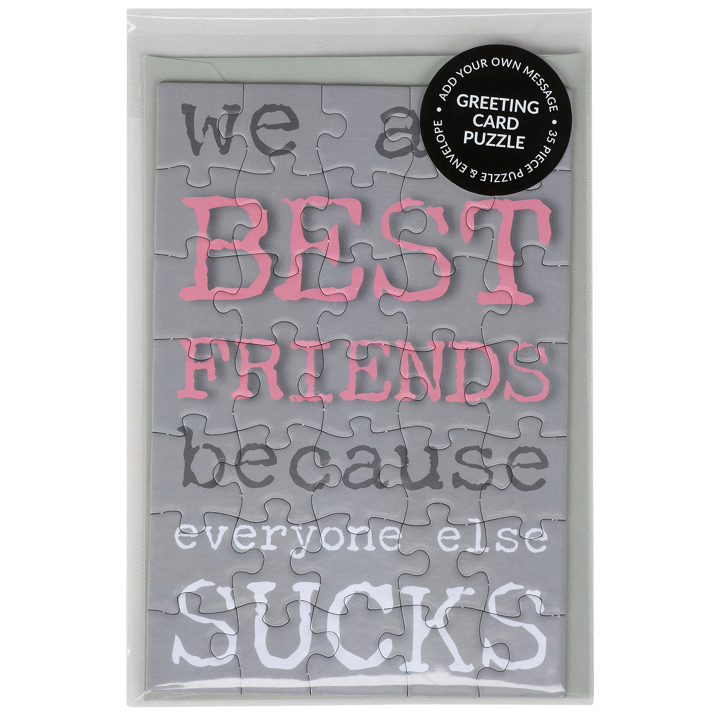 A greeting card puzzle from our Trash Talk By Annie Collection combining the excitement of receiving a greeting card with the joy of completing a puzzle. Our sassy puzzle cards include a blank space on the back to write a personal message, or express creativity in any way, before breaking up the puzzle for someone special to piece together the fun inside! We get them started with a sassy friendship themed sentiment on the front in a fun retro style that reads "We Are Best Friends Because Everyone Else Sucks." After personalizing the back, they break up the 35 piece puzzle and place the pieces in the included gray envelope. The puzzle card and envelope are packaged in a polybag with an insert displaying easy-to-follow instructions. Due to the shape and weight, extra postage is required when mailing puzzle cards. There's no need to wait for a special occasion or a specific holiday, our Best Friends Because puzzle card is perfect for any moment they want to reach out to friends and family.