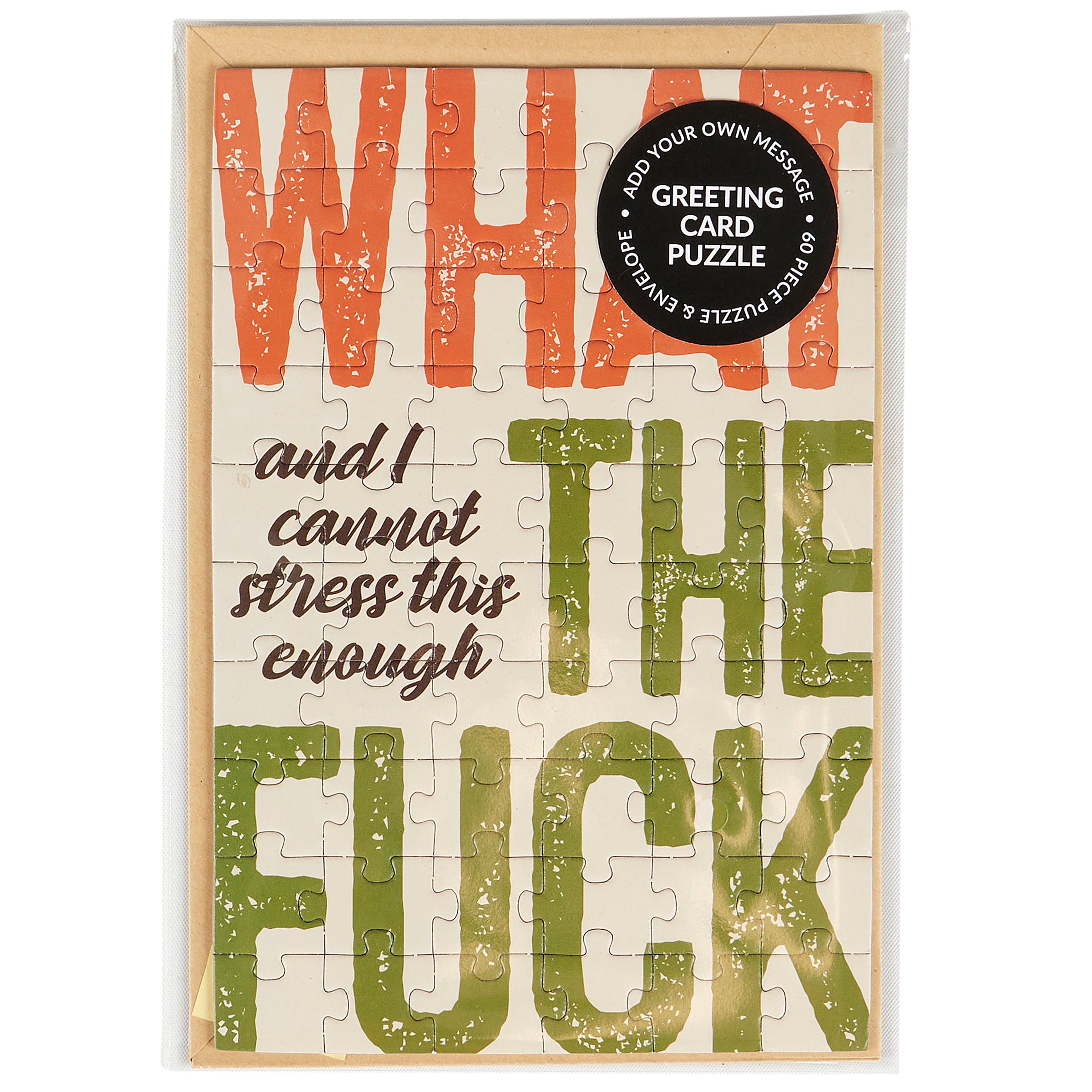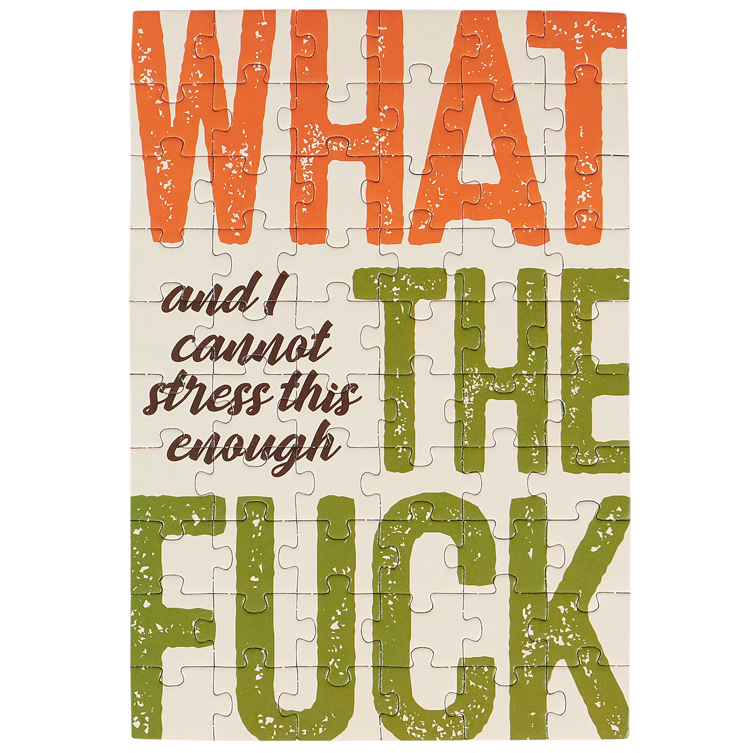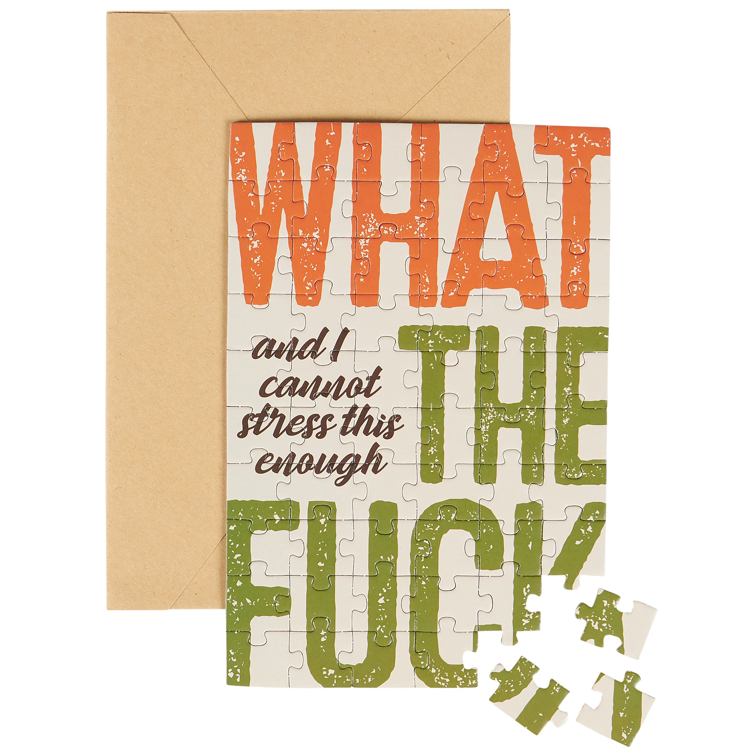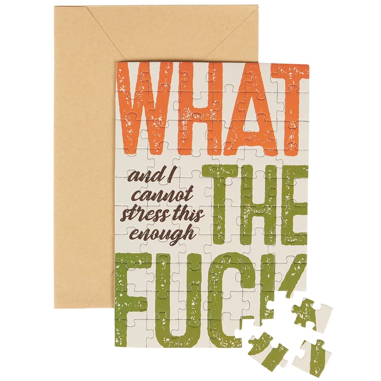 Don't just give your feelings away, make 'em work for it. This relatable greeting card puzzle combines the feels of a greeting card with the personal pride of completing a puzzle. Questionables puzzle cards include a blank space on the back to write a personal message or express creativity in any way they want before breaking up the puzzle for someone special to piece together the fun inside! We get them started with a relatable sentiment on the front that reads "What – And I Cannot Stress This Enough – The Fuck." They do their thing on the back, punch out the pieces, and place them in the included craft envelope. Everything is packaged in a polybag with an insert displaying easy instructions. Due to the shape and weight, extra postage is required when mailing puzzle cards. There's no need to wait for a special occasion or a specific holiday, this everyday puzzle card is perfect for any moment a customer wants to present a personal message. Our Cannot Stress puzzle card offers a more relatable way to reach out to friends and family.
