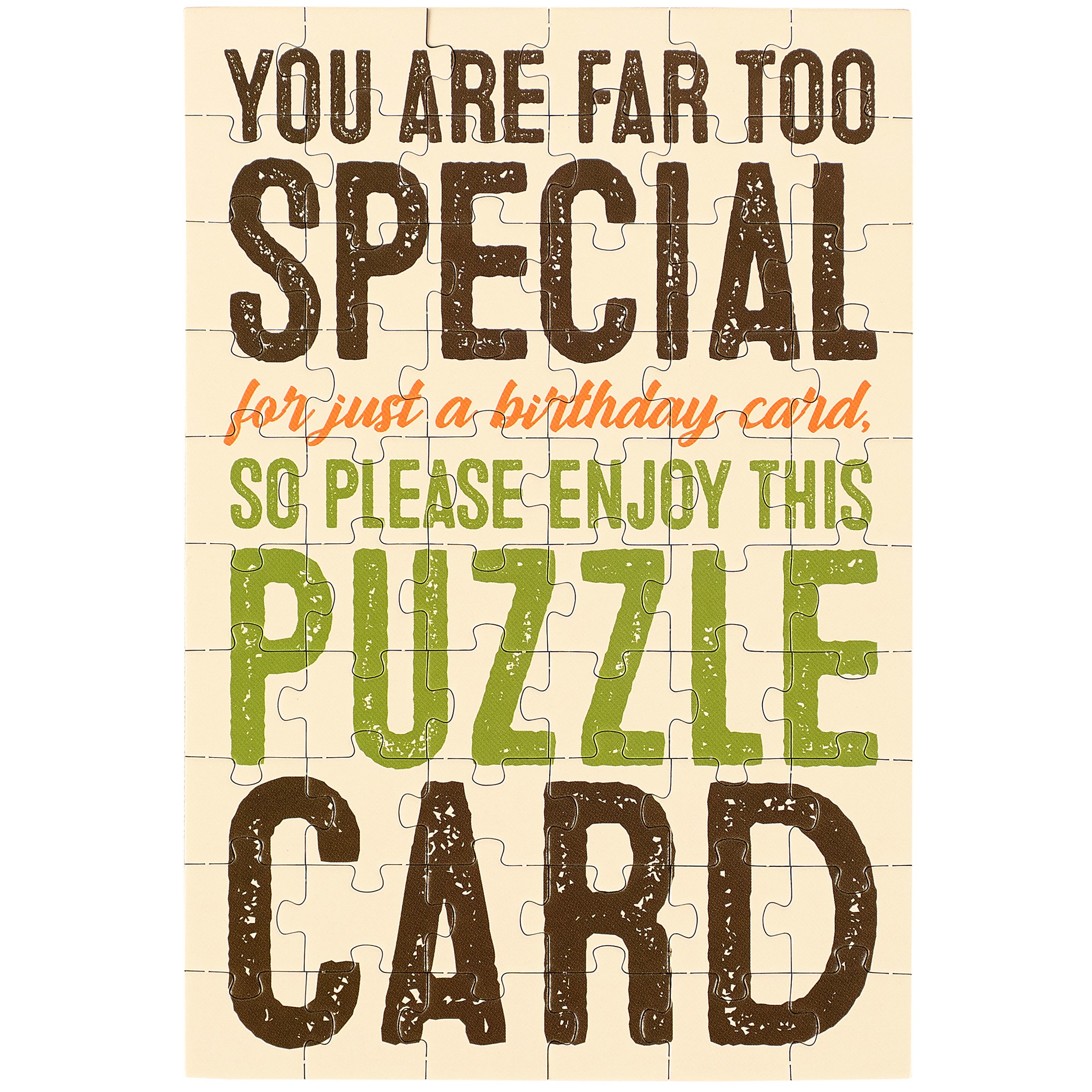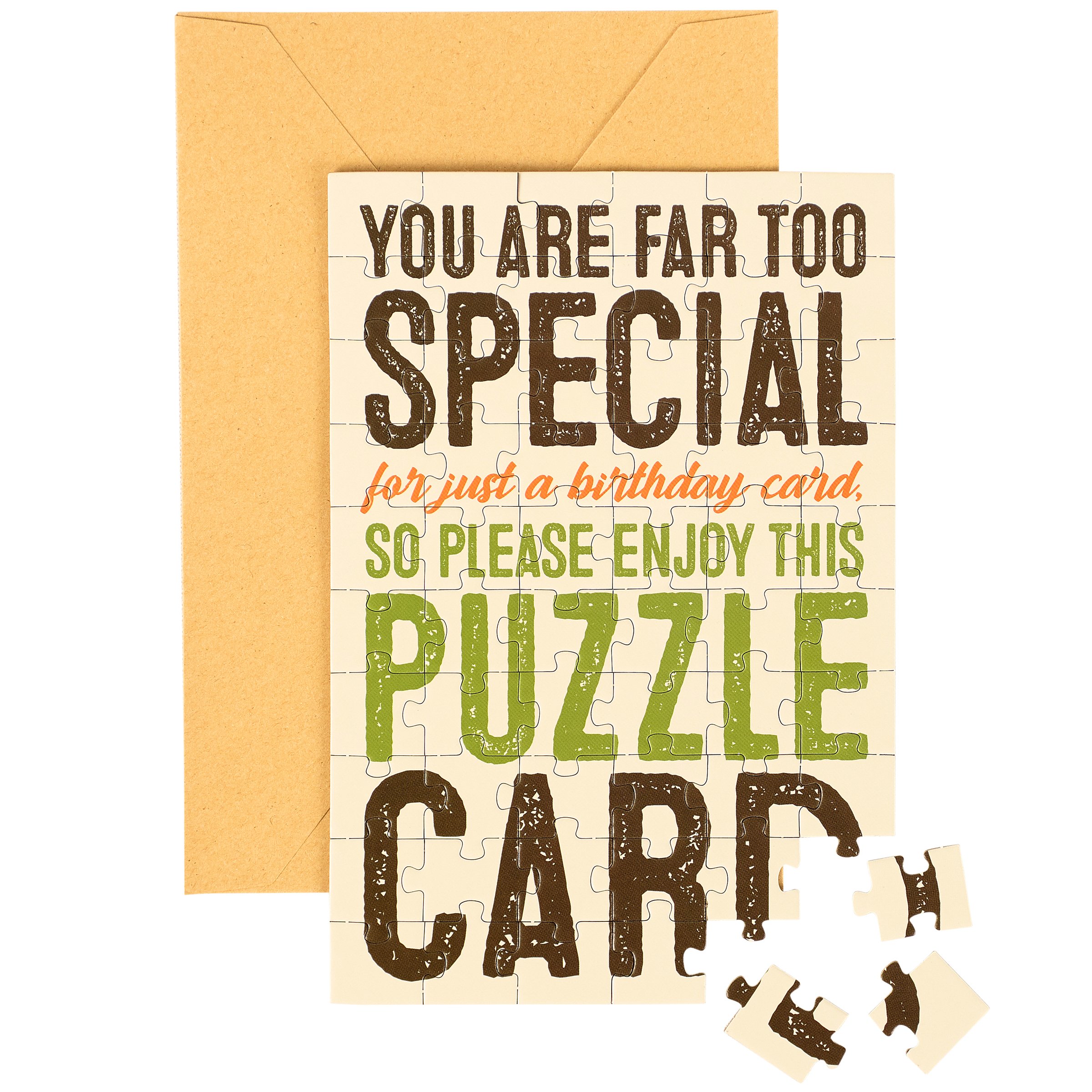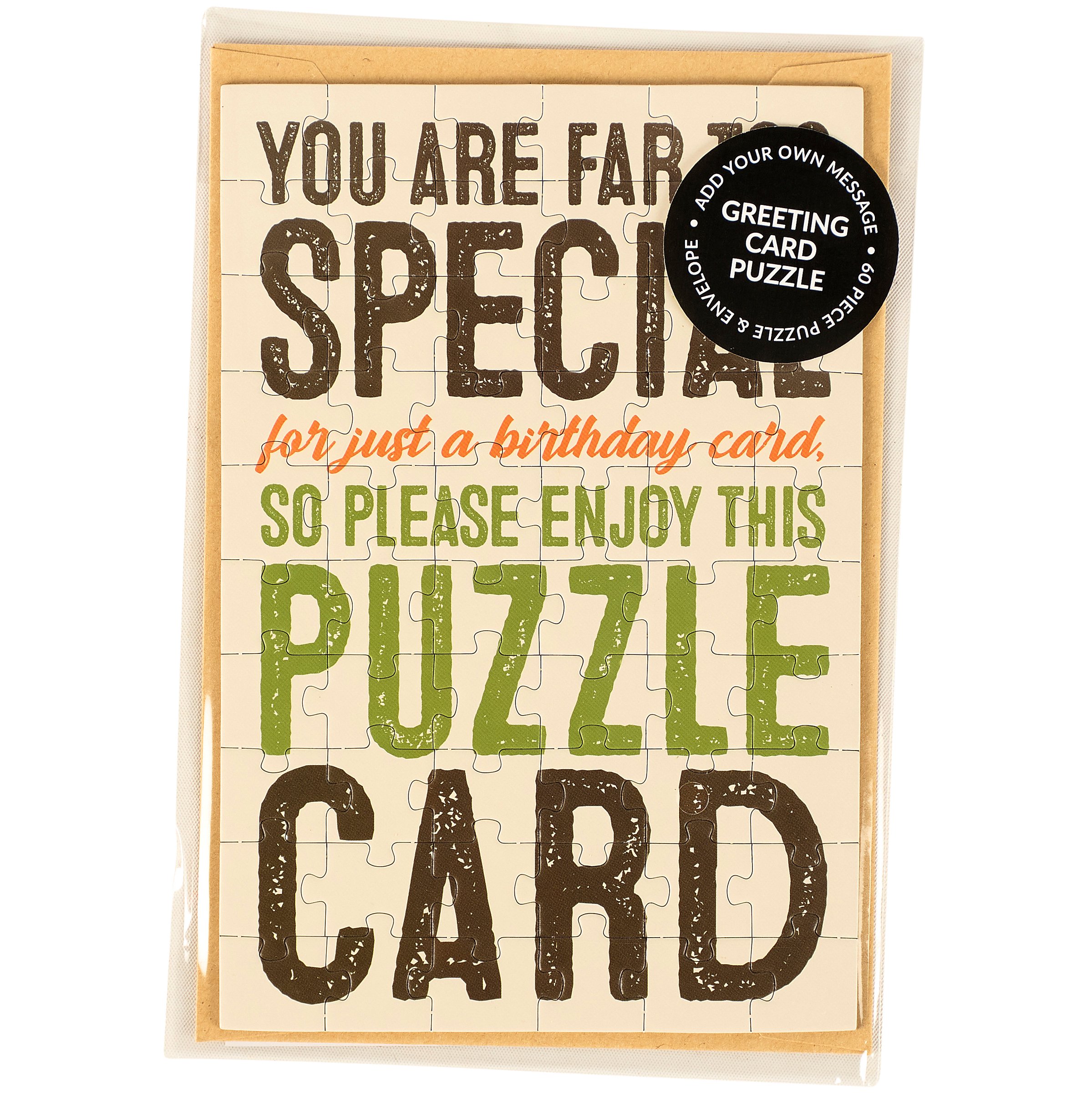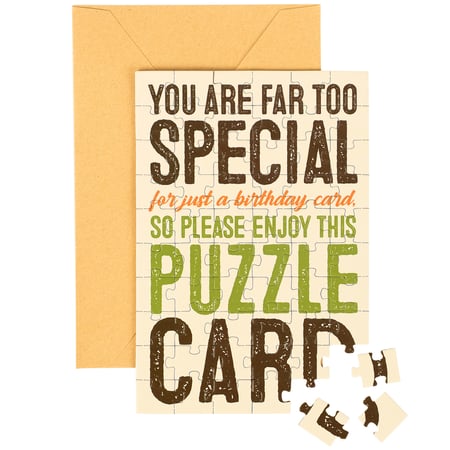 Don't just give your feelings away, make 'em work for it. This relatable greeting card puzzle combines the feels of receiving a birthday card with the satisfaction of completing a puzzle! Questionables puzzle cards include a blank space on the back to write a personal message or express creativity in any way you want before breaking up the puzzle for someone special to piece together the fun inside! We get you started with a fun birthday sentiment on the front that reads "You Are Far Too Special For Just A Birthday Card, So Please Enjoy This Puzzle Card." Do your thing on the back, punch out the 60 pieces, and place them in the included envelope. Everything is packaged in a polybag with an insert displaying easy-to-follow instructions. Due to the shape and weight, extra postage is required when mailing puzzle cards. Our Far Too Special puzzle card offers a down-to-earth way to wish family or friends a happy birthday.