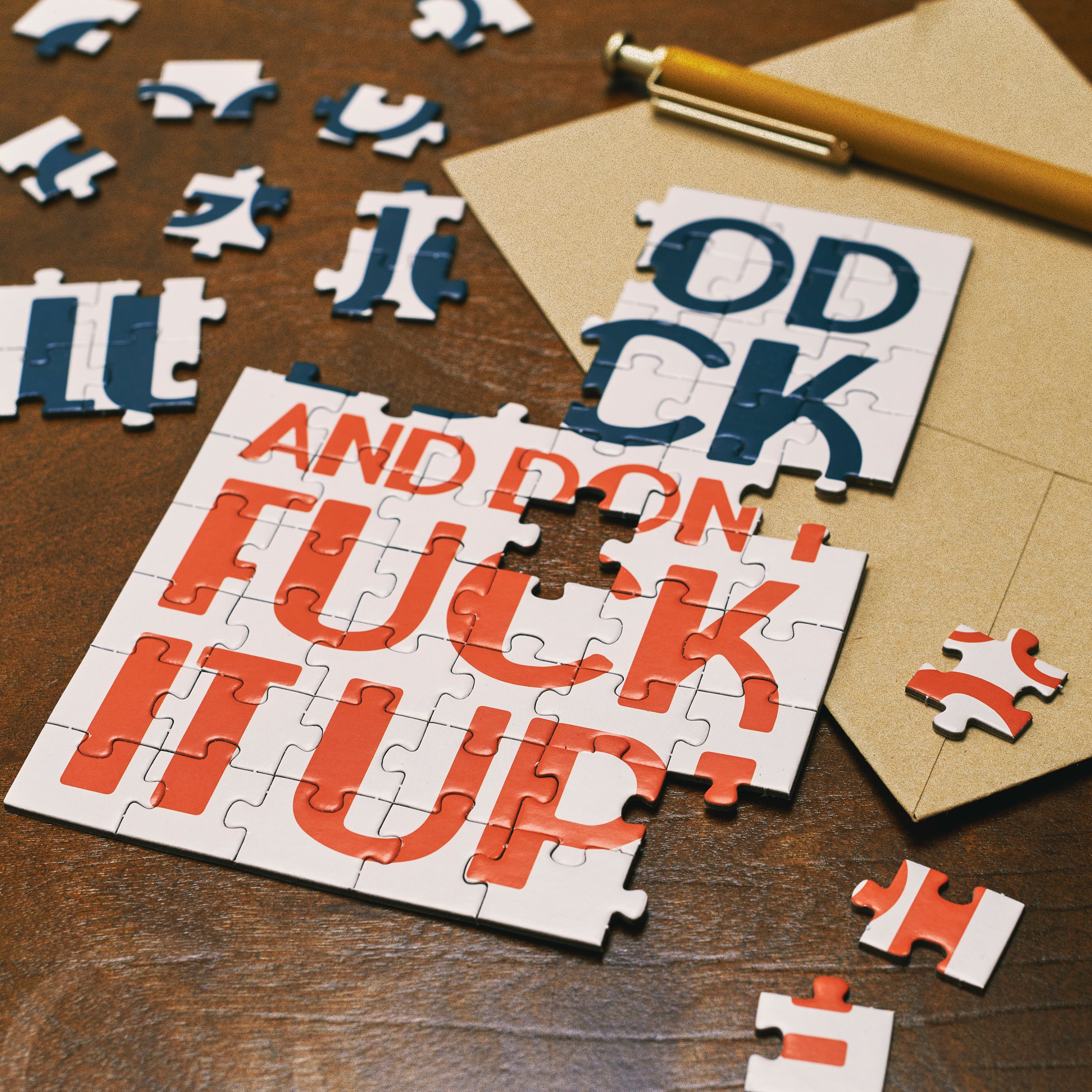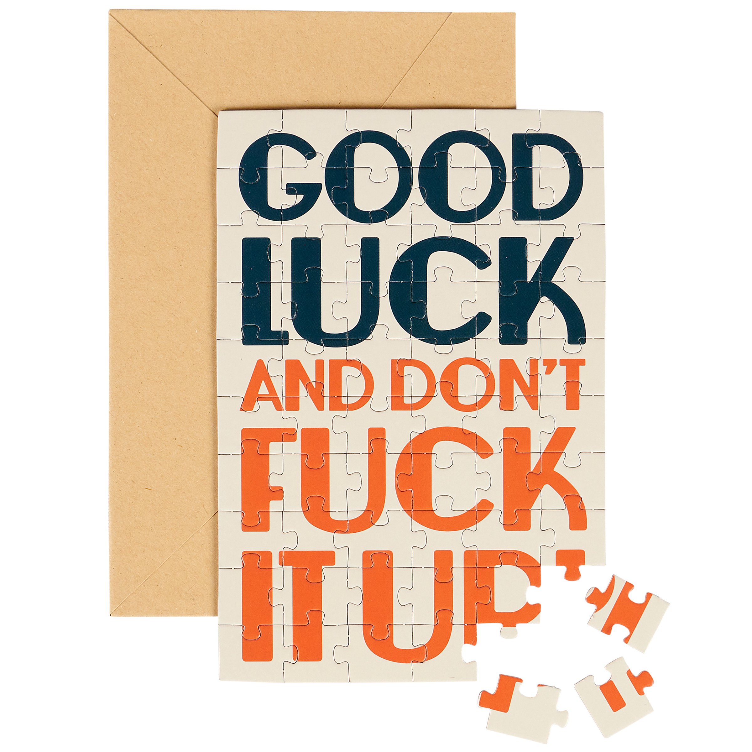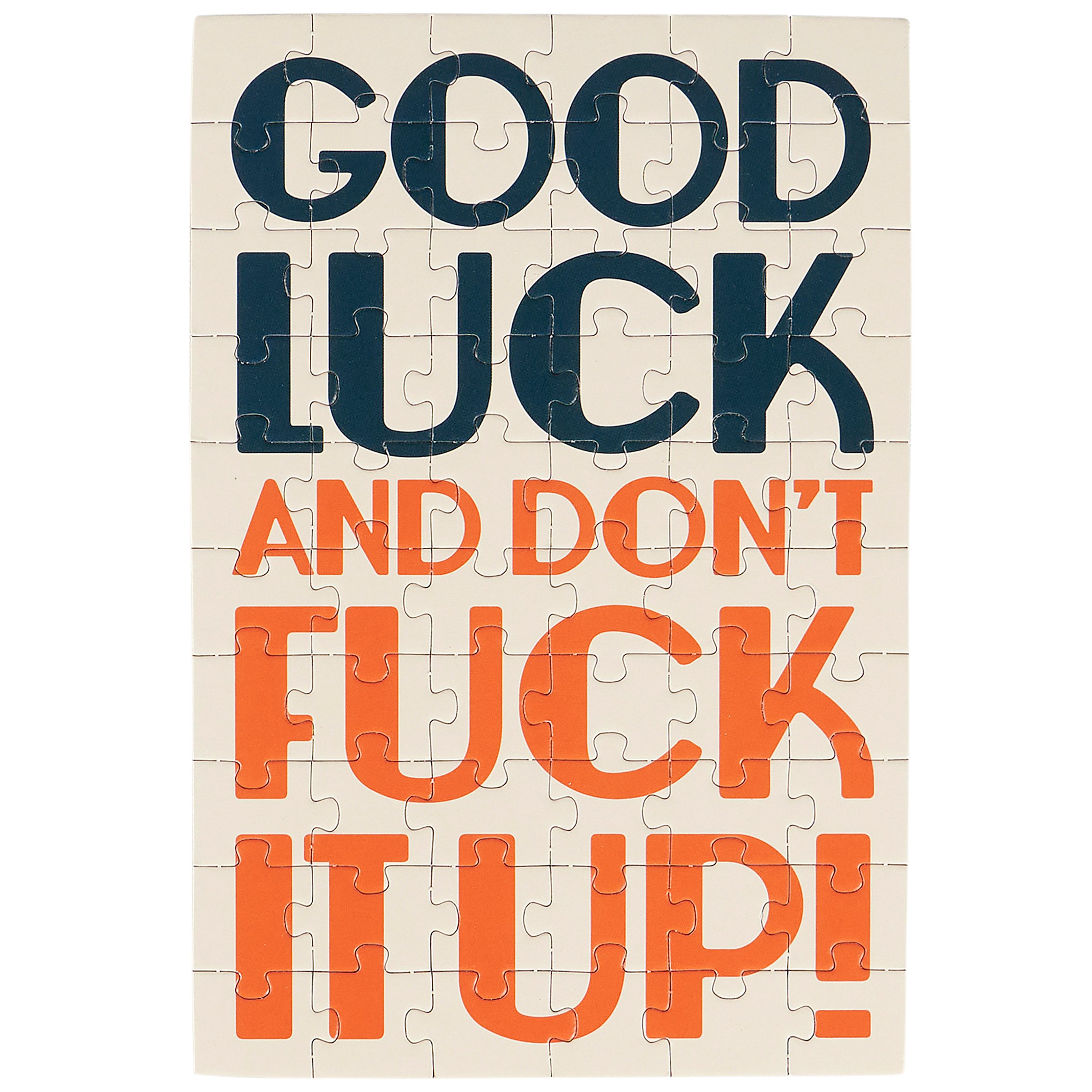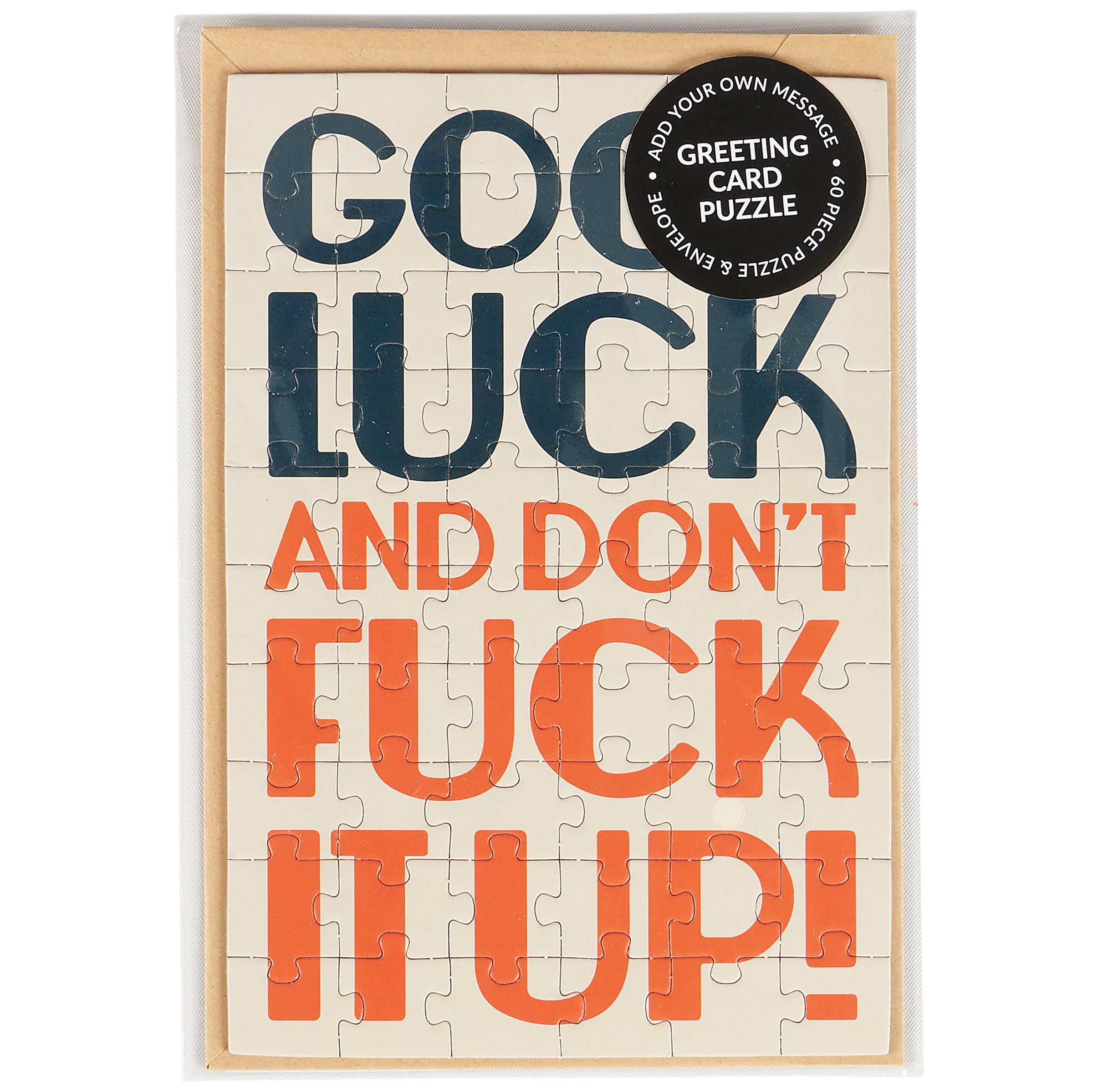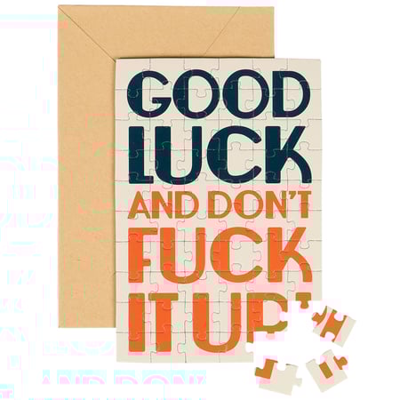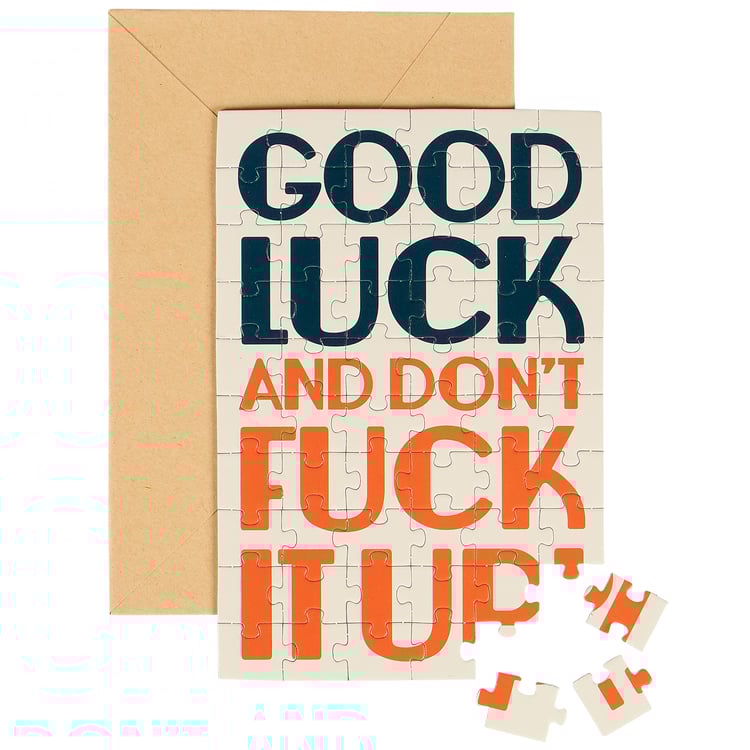 Don't just give your feelings away, make 'em work for it. This sassy greeting card puzzle combines the feels of a greeting card with the personal pride of completing a puzzle. Questionables puzzle cards include a blank space on the back to write a personal message or express creativity in any way they want before breaking up the puzzle for someone special to piece together the fun inside! We get them started with a sassy sentiment on the front that reads "Good Luck And Don't Fuck It Up!" They do their thing on the back, punch out the pieces, and place them in the included craft envelope. Everything is packaged in a polybag with an insert displaying easy instructions. Due to the shape and weight, extra postage is required when mailing puzzle cards. There's no need to wait for a special occasion or a specific holiday, our Good Luck puzzle card is perfect for any moment a customer wants to present a personal message to friends and family letting them know that everyday life can be hard, but they got this.