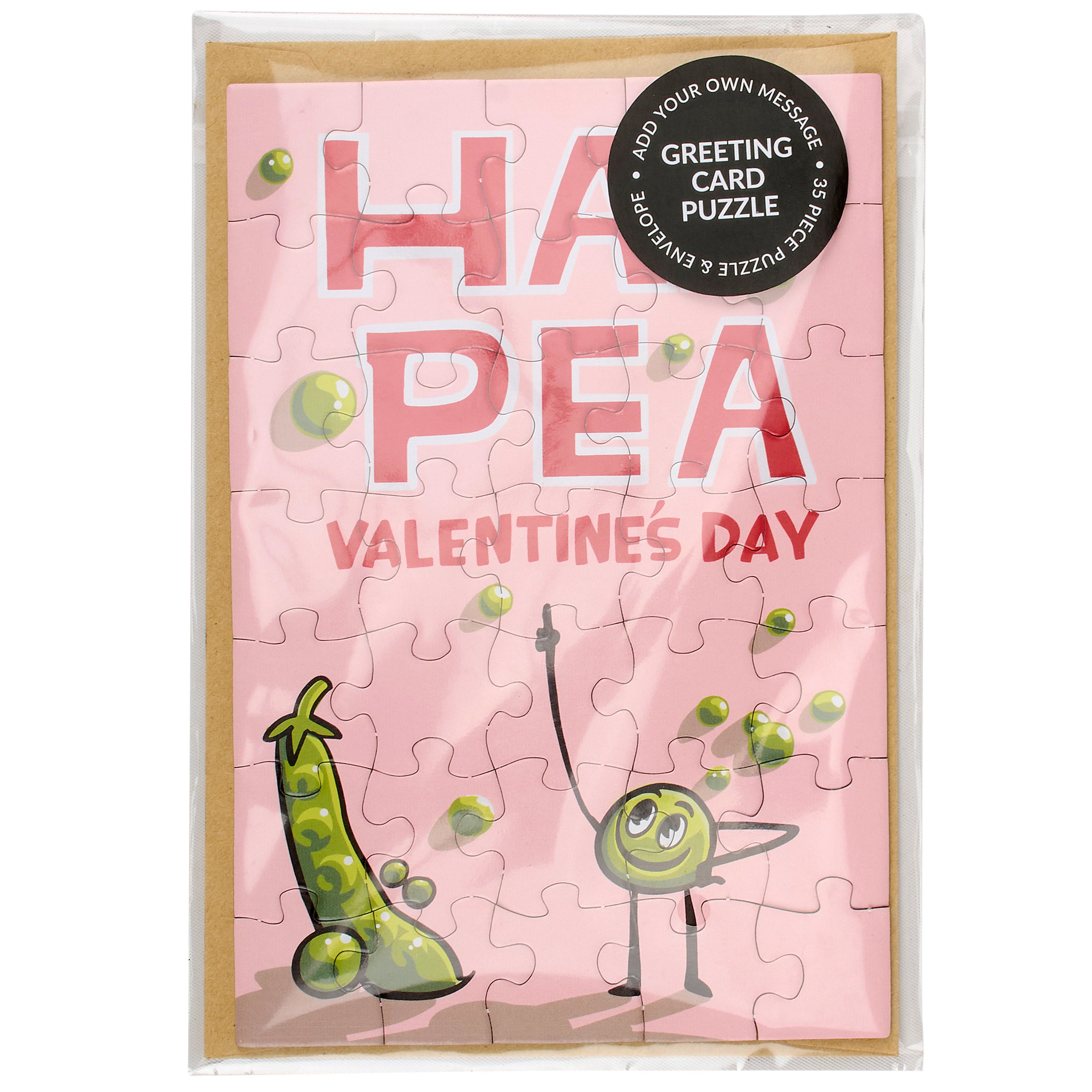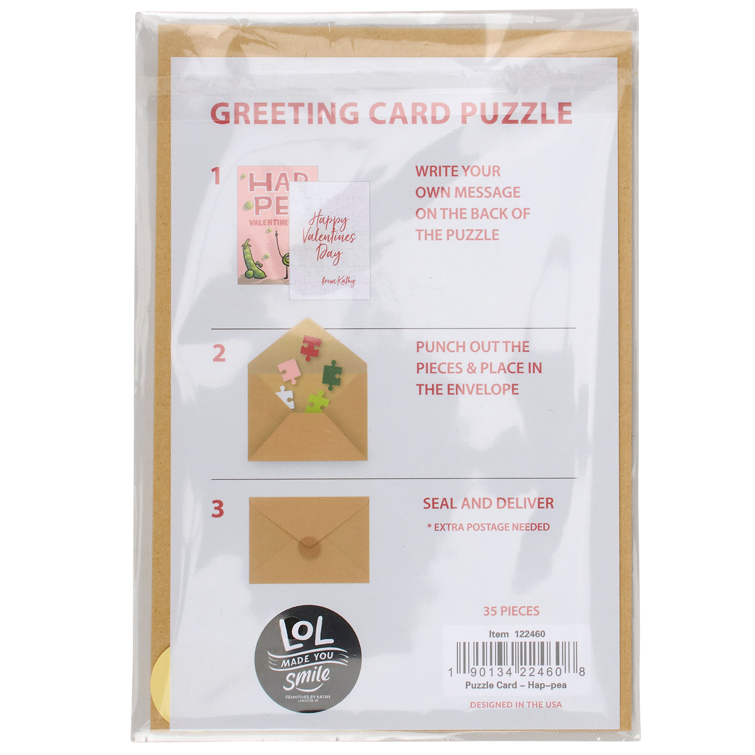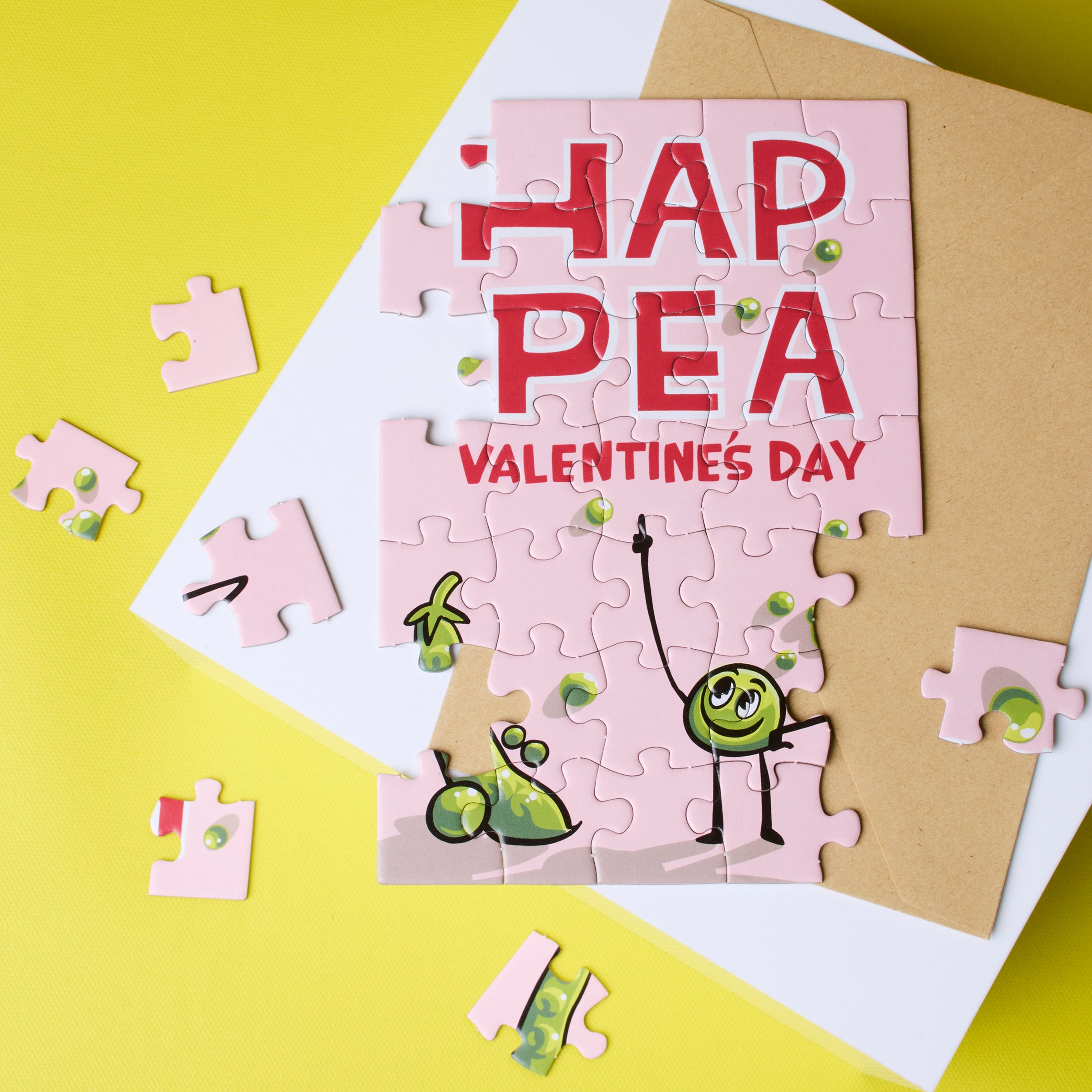 A greeting card puzzle from our Valentine's Day Collection combining the excitement of receiving a greeting card with the joy of completing a puzzle. This Valentine's Day puzzle card includes a blank space on the back to write a personal message, or express creativity in any way, before breaking up the puzzle for someone special to piece together the fun inside! We get them started with a fun Valentine's Day inspired design on the front featuring a hand illustrated pea character with a food-themed sentiment that reads "Hap-pea Valentine's Day." After personalizing the back, break up the 35 piece puzzle and place the pieces in the included kraft envelope. Our Hap-pea Valentine's Day puzzle card and envelope is packaged in a polybag with an insert displaying easy-to-follow instructions. Due to the shape and weight, extra postage is required when mailing puzzle cards. A food-themed greeting card that offers a fun alternative for Valentine's Day gifting to both friends and partners.
