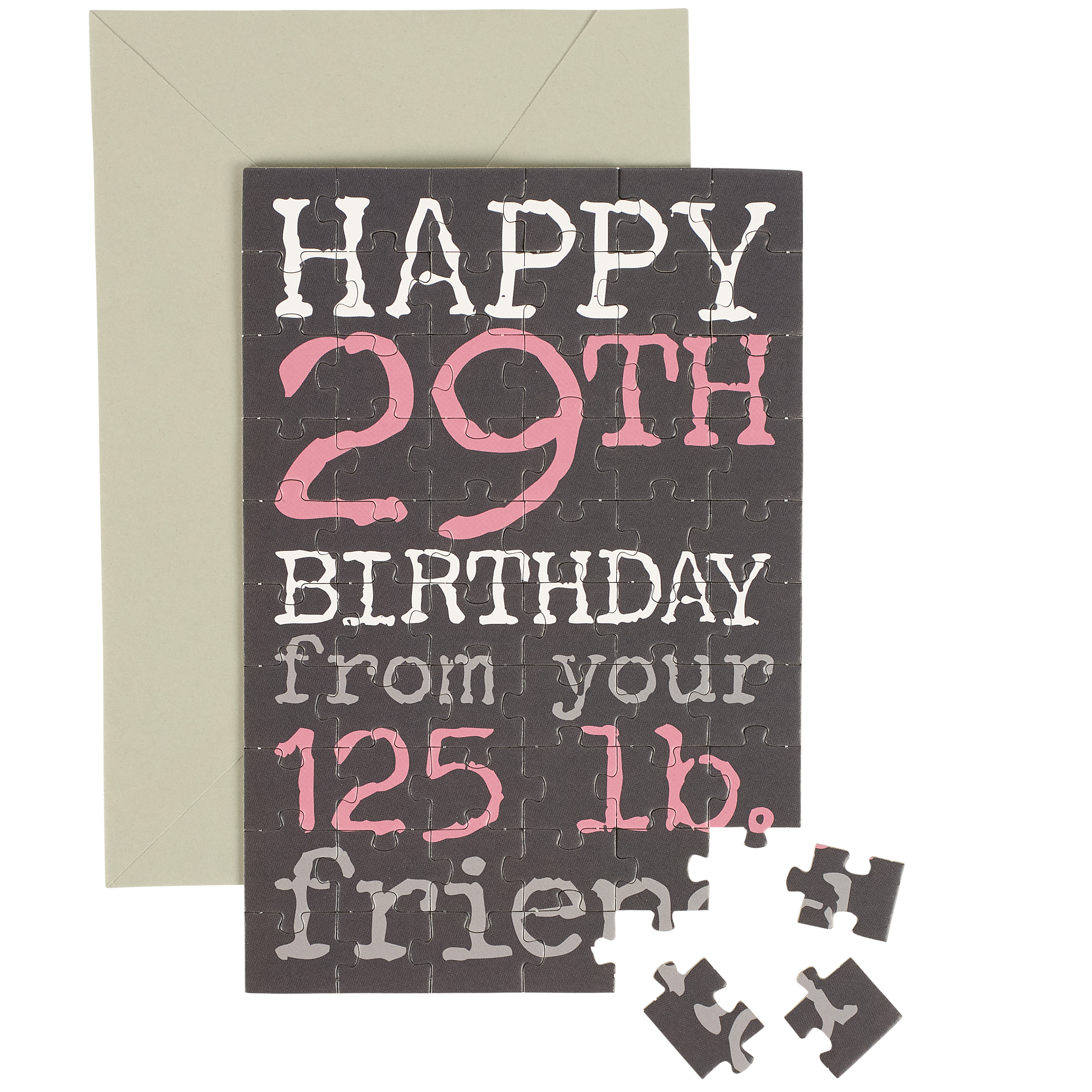 A greeting card puzzle from our Trash Talk By Annie Collection combining the excitement of receiving a greeting card with the joy of completing a puzzle. Our funny puzzle cards include a blank space on the back to write a personal message, or express creativity in any way, before breaking up the puzzle for someone special to piece together the fun inside! We get you started with a humorous birthday-inspired sentiment on the front in a fun retro style that reads "Happy 29th Birthday From Your 125 lb. Friend." After personalizing the back, break up the 60 piece puzzle and place the pieces in the included gray envelope. Everything is packaged in a polybag with an insert displaying easy-to-follow instructions. Due to the shape and weight, extra postage is required when mailing puzzle cards. Our Happy Birthday puzzle card offers a fun and relatable way to wish friends and family a happy birthday.