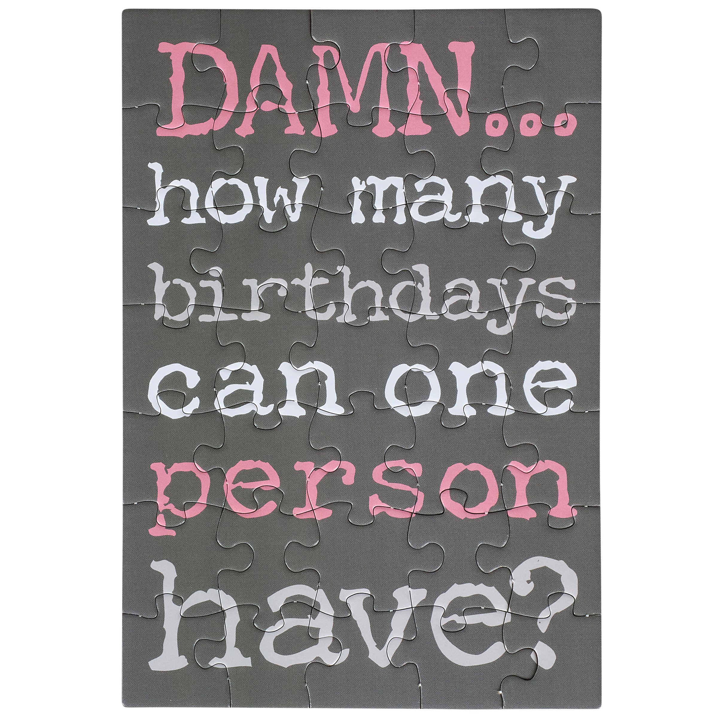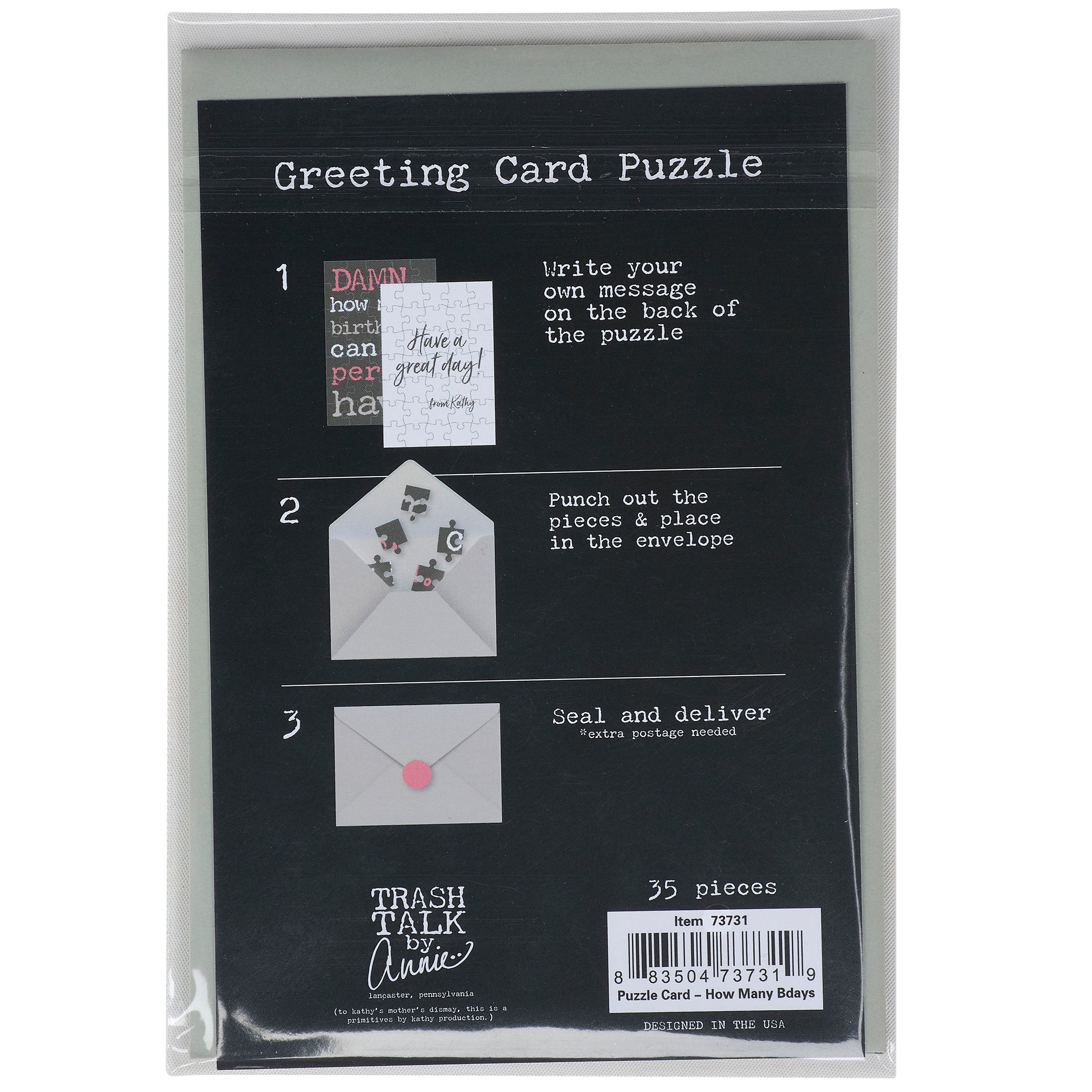 A greeting card puzzle from our Trash Talk By Annie Collection combining the excitement of receiving a birthday card with the joy of completing a puzzle. Our sassy puzzle cards include a blank space on the back to write a personal message, or express creativity in any way, before breaking up the puzzle for someone special to piece together the fun inside! We get them started with a sassy birthday sentiment on the front in a fun retro style that reads "Damn... How Many Birthdays Can One Person Have?" After personalizing the back, they break up the 35 piece puzzle and place the pieces in the included gray envelope. The puzzle card and envelope are packaged in a polybag with an insert displaying easy-to-follow instructions. Due to the shape and weight, extra postage is required when mailing puzzle cards. Our How Many Birthdays puzzle card offers a fun and relatable way to wish friends and family a happy birthday.