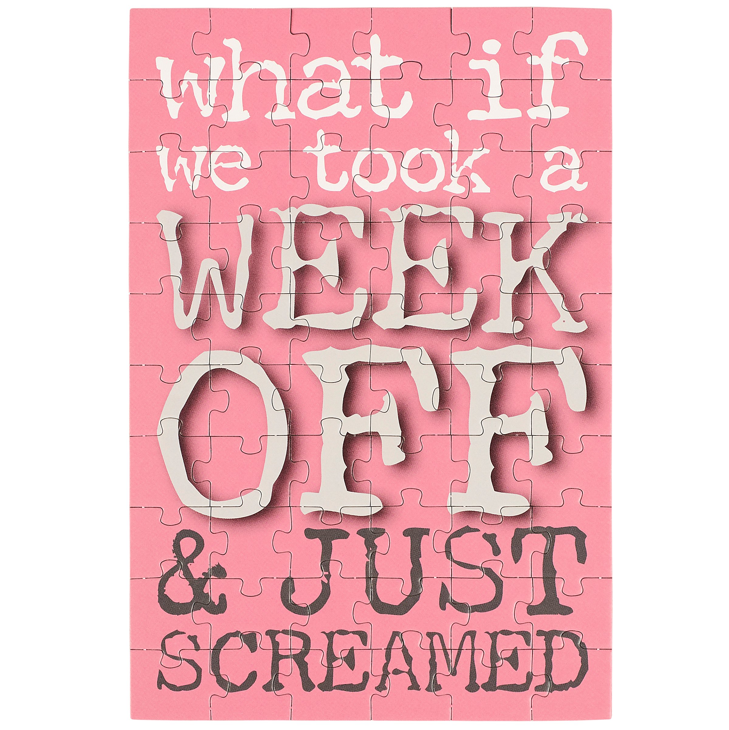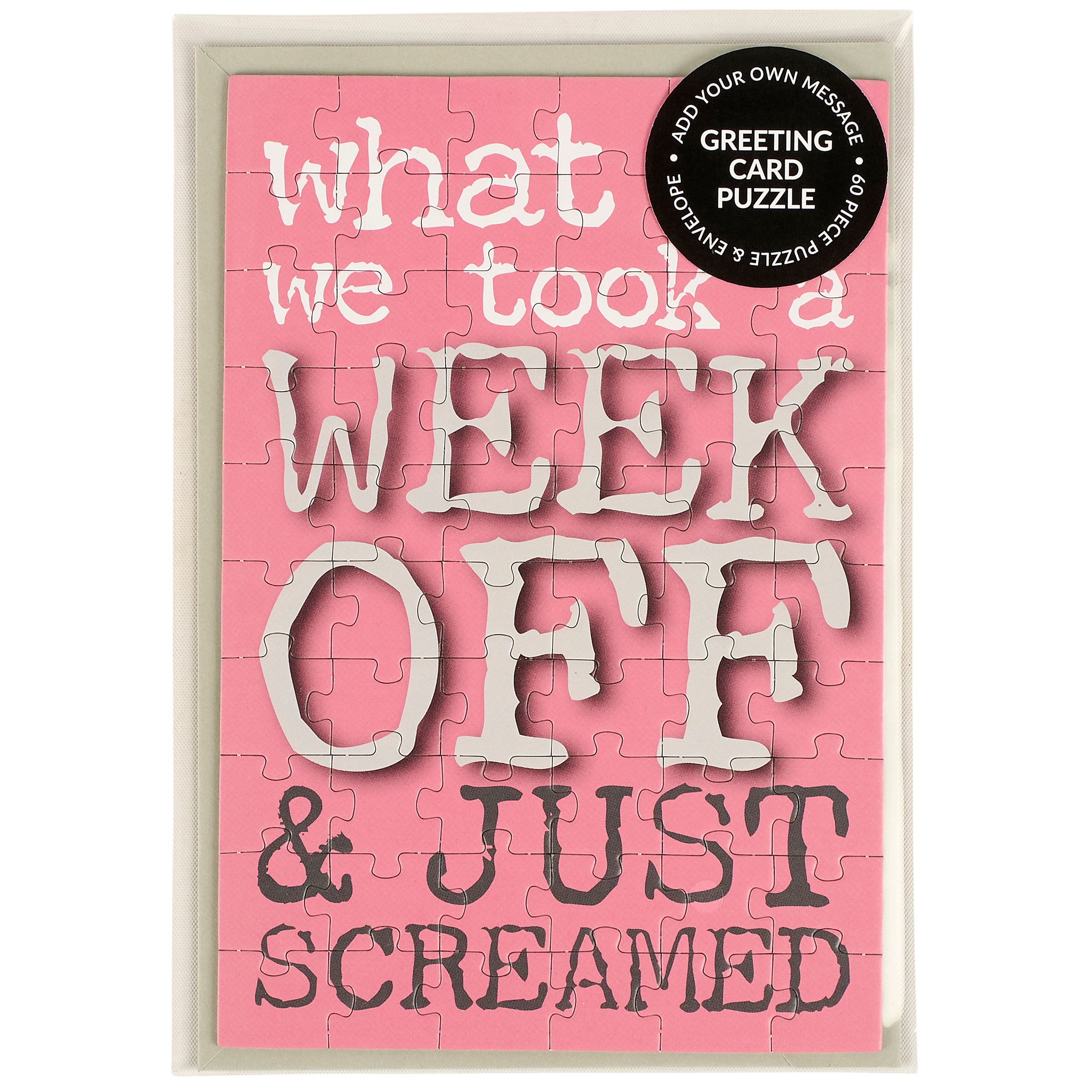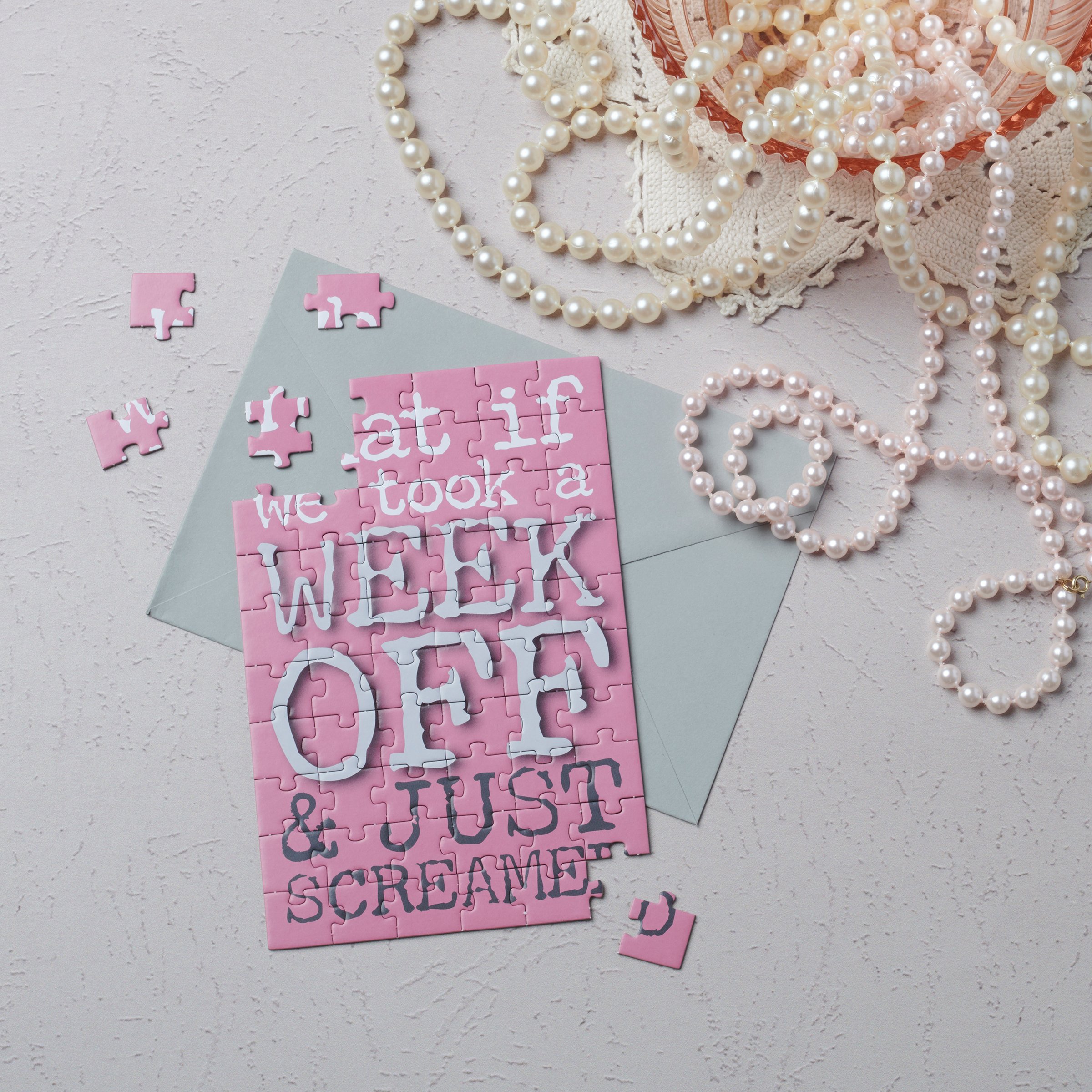 A greeting card puzzle from our Trash Talk By Annie Collection combining the excitement of receiving a greeting card with the joy of completing a puzzle. Our funny puzzle cards include a blank space on the back to write a personal message, or express creativity in any way, before breaking up the puzzle for someone special to piece together the fun inside! We you started with a humorous friendship-themed sentiment on the front in a fun retro style that reads "What If We Took A Week Off & Just Screamed." After personalizing the back, break up the 60 piece puzzle and place the pieces in the included gray envelope. Everything is packaged in a polybag with an insert displaying easy-to-follow instructions. Due to the shape and weight, extra postage is required when mailing puzzle cards. There's no need to wait for a special occasion or a specific holiday, our Just Screamed puzzle card is perfectto reach out to friends and family for any moment.