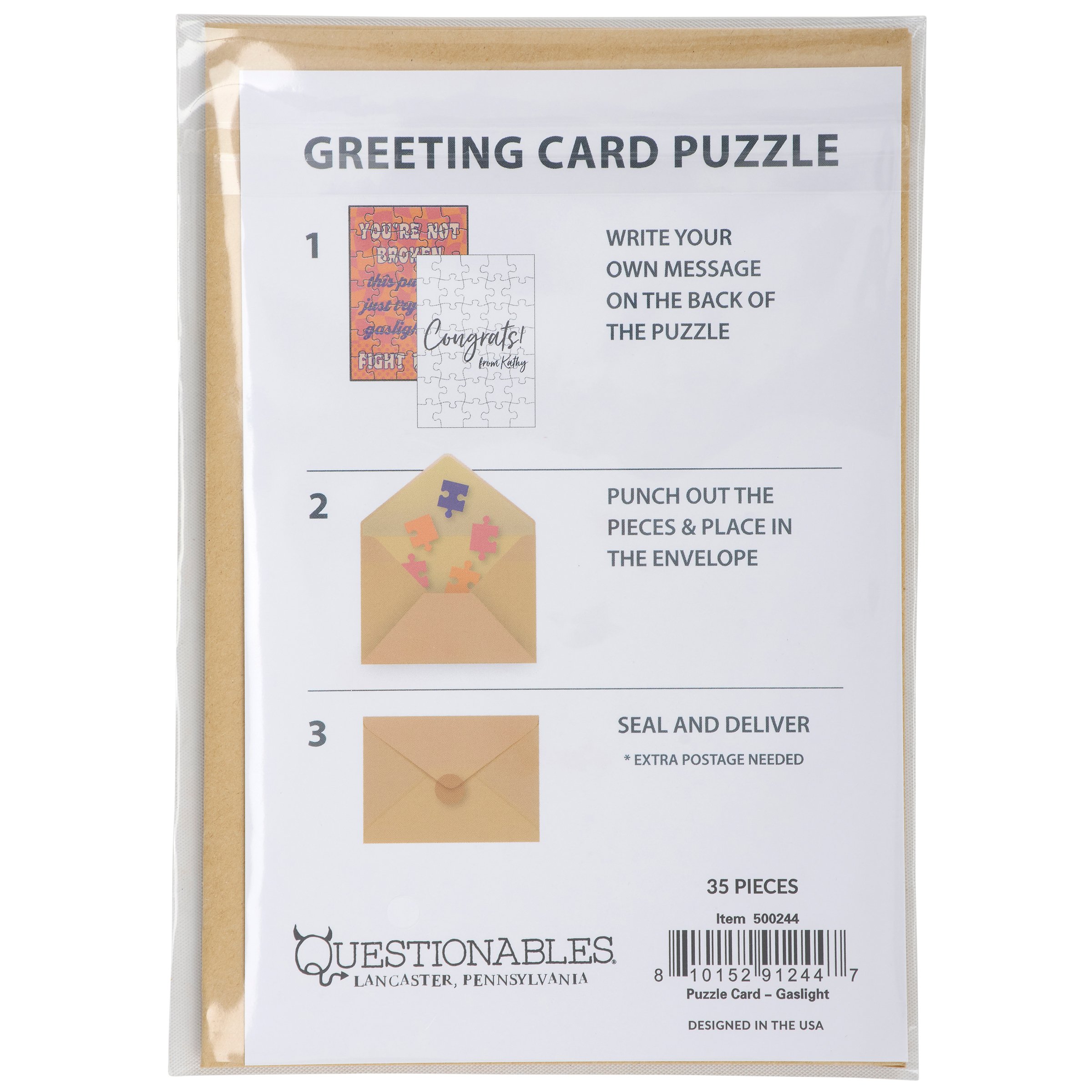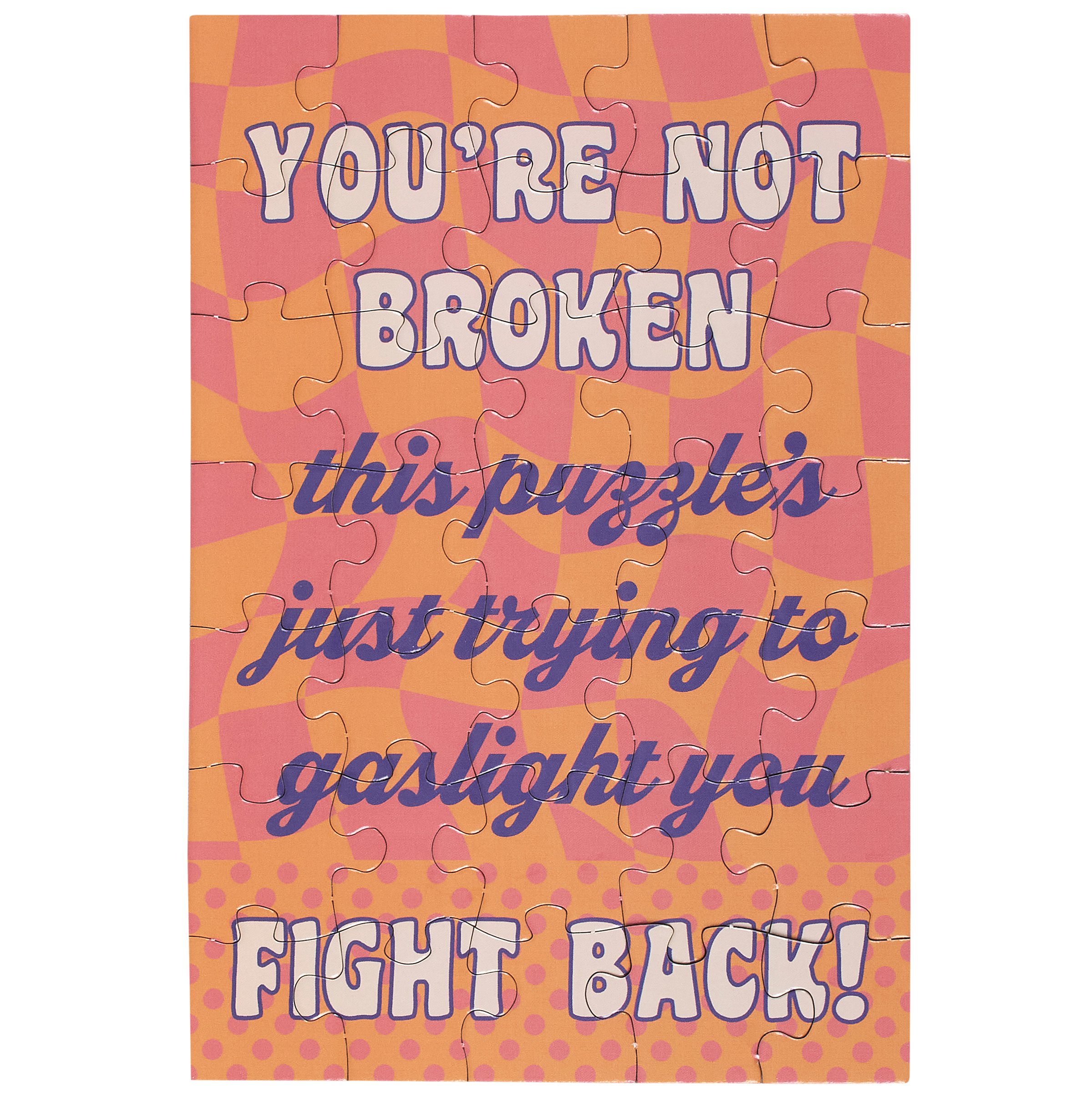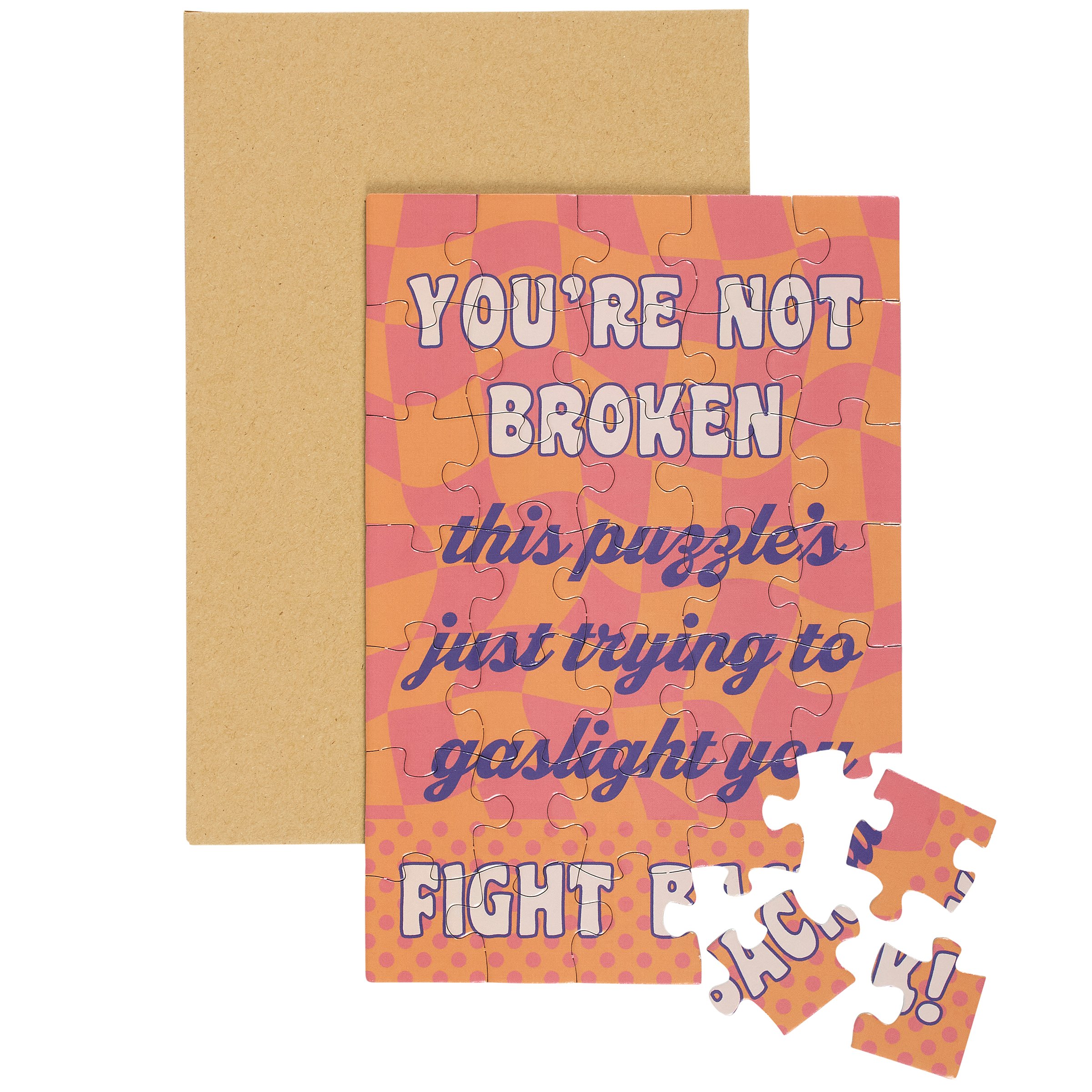 Don't just give your feelings away, make 'em work for it. Our greeting card puzzles combine the feels of receiving a greeting card with the satisfaction of completing a puzzle. This funny puzzle card includes a blank space on the back to write a personal message, or express creativity in any way, before breaking up the puzzle for someone special to piece together the fun inside! We get them started with a funny inspirational sentiment on the front in a fun retro style that reads "You're Not Broken - This Puzzle's Just Trying To Gaslight You. Fight Back!" After personalizing the back, they break up the 35 piece puzzle and place the pieces in the included kraft envelope. The puzzle card and envelope are packaged in a polybag with an insert displaying easy-to-follow instructions. Due to the shape and weight, extra postage is required when mailing puzzle cards. There's no need to wait for a special occasion or a specific holiday, our Trying To Gaslight You puzzle card is perfect for any moment they want to reach out to friends and family.