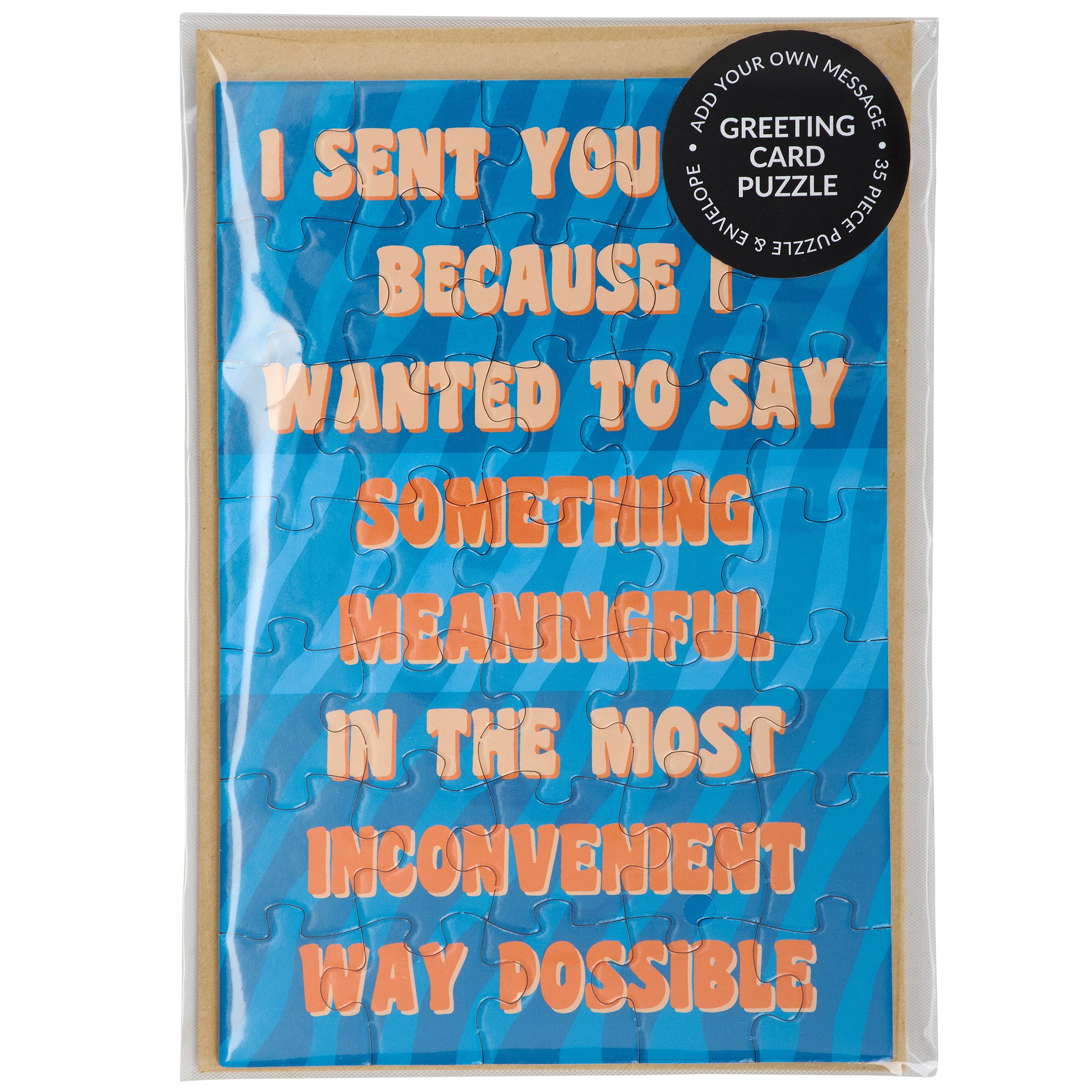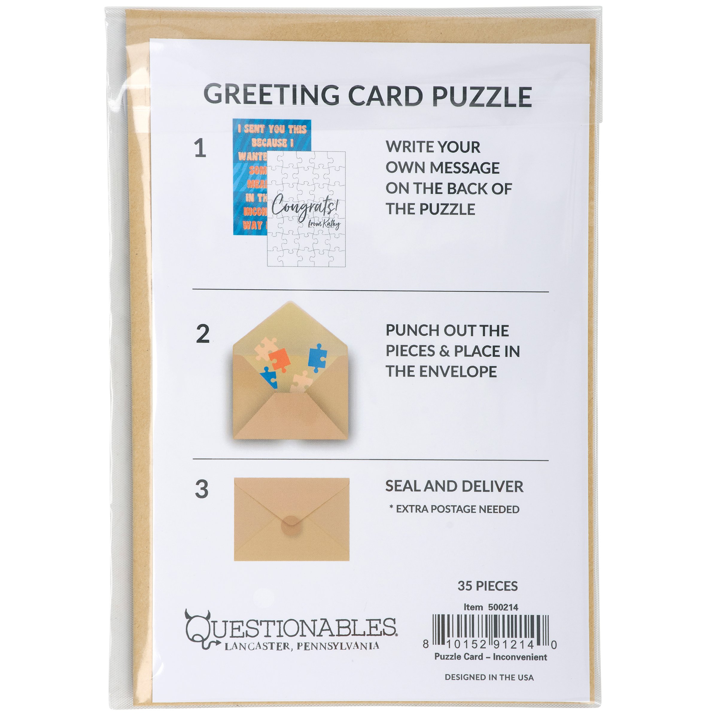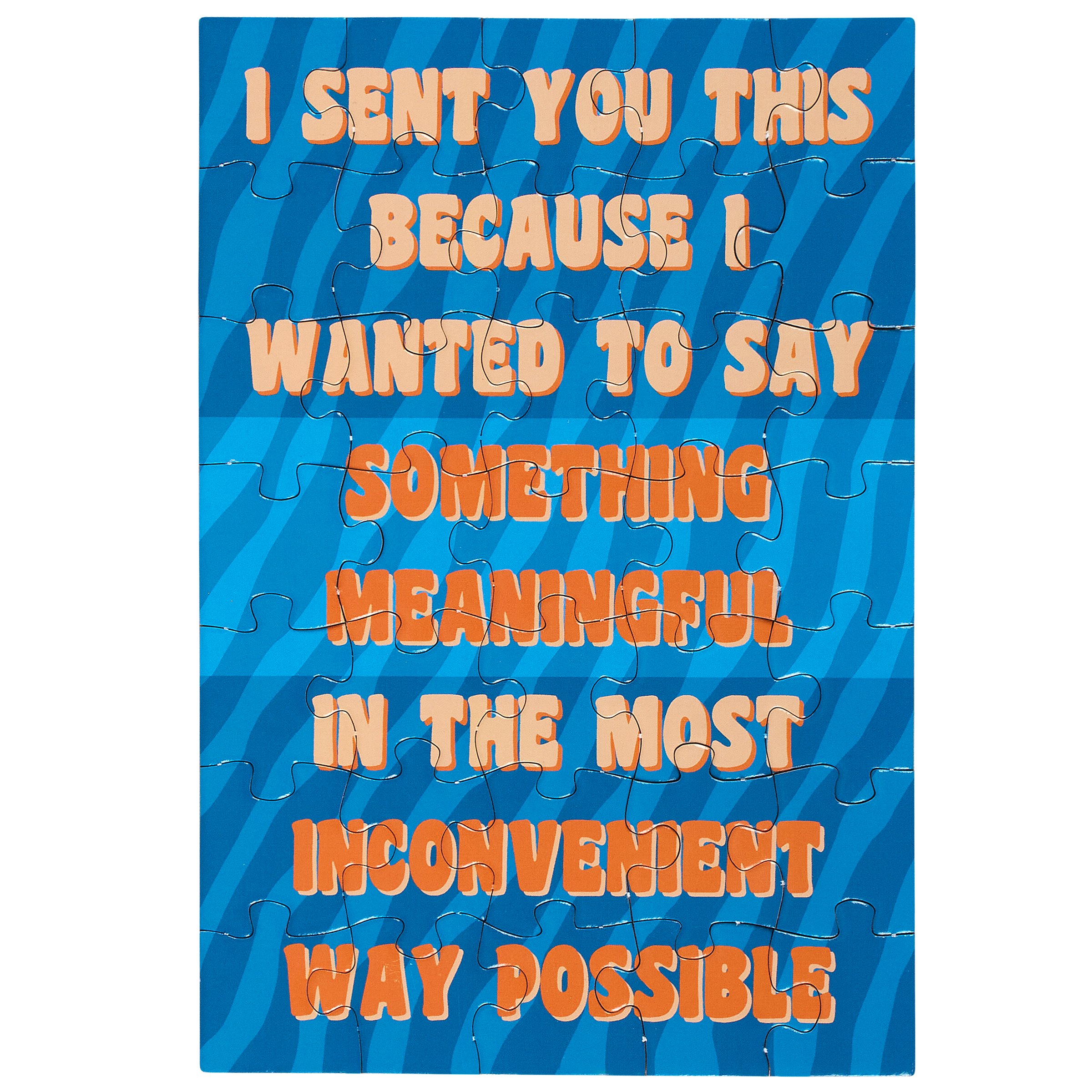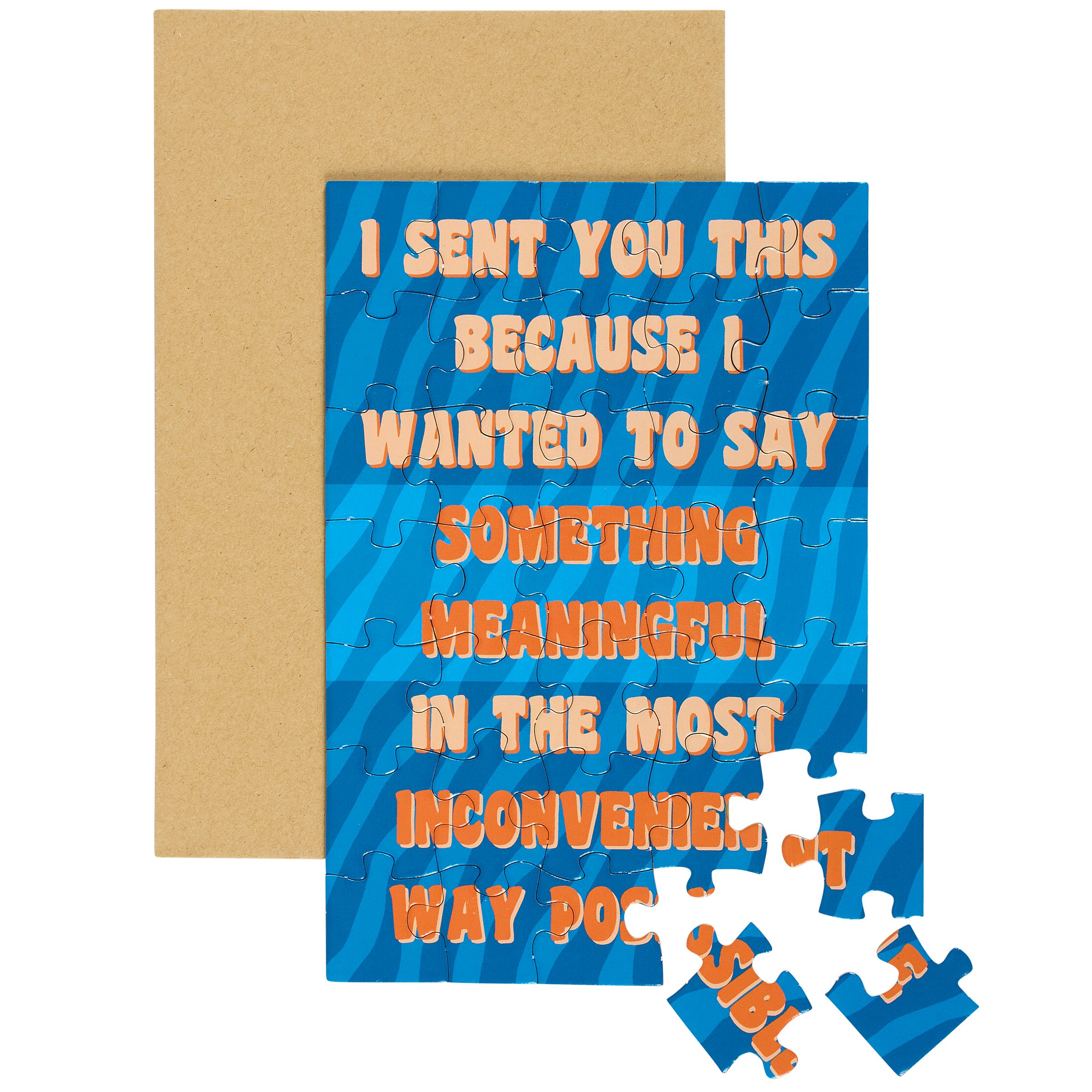 Don't just give your feelings away, make 'em work for it. Our greeting card puzzles combine the feels of receiving a greeting card with the satisfaction of completing a puzzle. This sassy puzzle card includes a blank space on the back to write a personal message, or express creativity in any way, before breaking up the puzzle for someone special to piece together the fun inside! We get them started with a sassy sentiment on the front in a fun retro style that reads "I Sent You This Because I Wanted To Say Something Meaningful In The Most Inconvenient Way Possible." After personalizing the back, they break up the 35 piece puzzle and place the pieces in the included kraft envelope. The puzzle card and envelope are packaged in a polybag with an insert displaying easy-to-follow instructions. Due to the shape and weight, extra postage is required when mailing puzzle cards. There's no need to wait for a special occasion or a specific holiday, our Most Inconvenient Way puzzle card is perfect for any moment they want to reach out to friends and family.