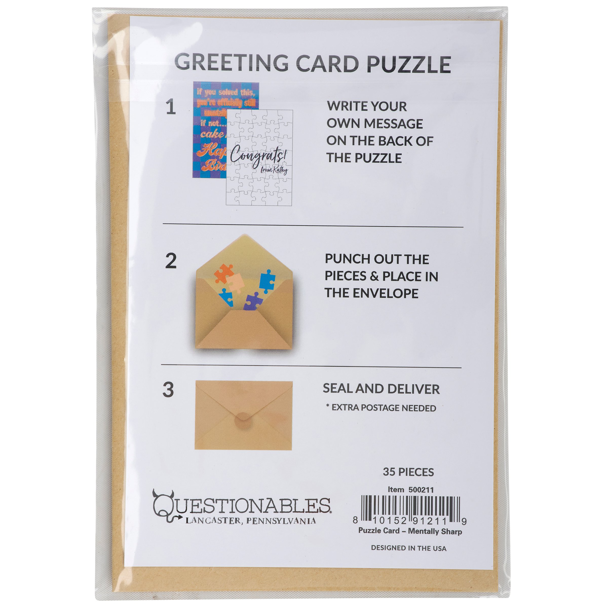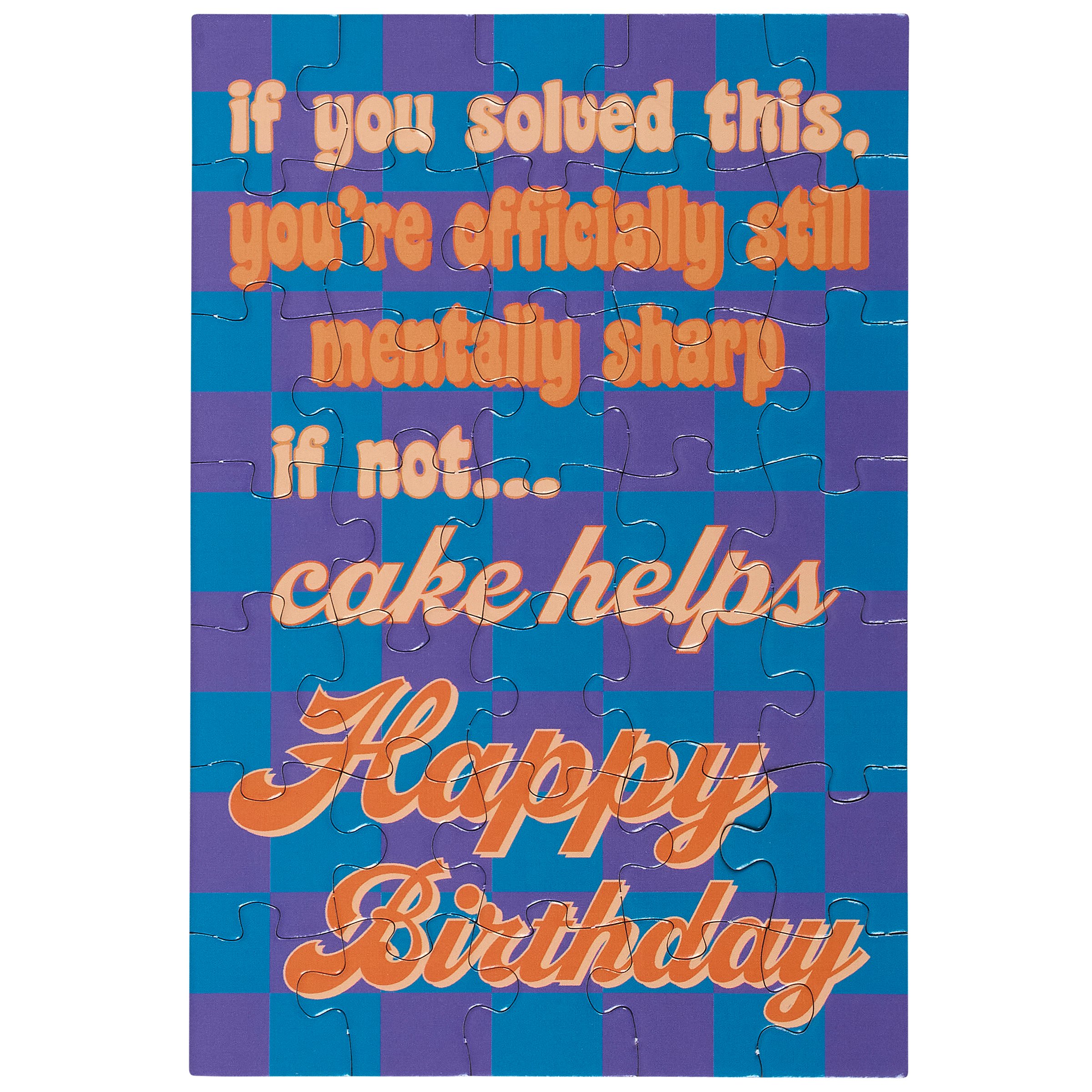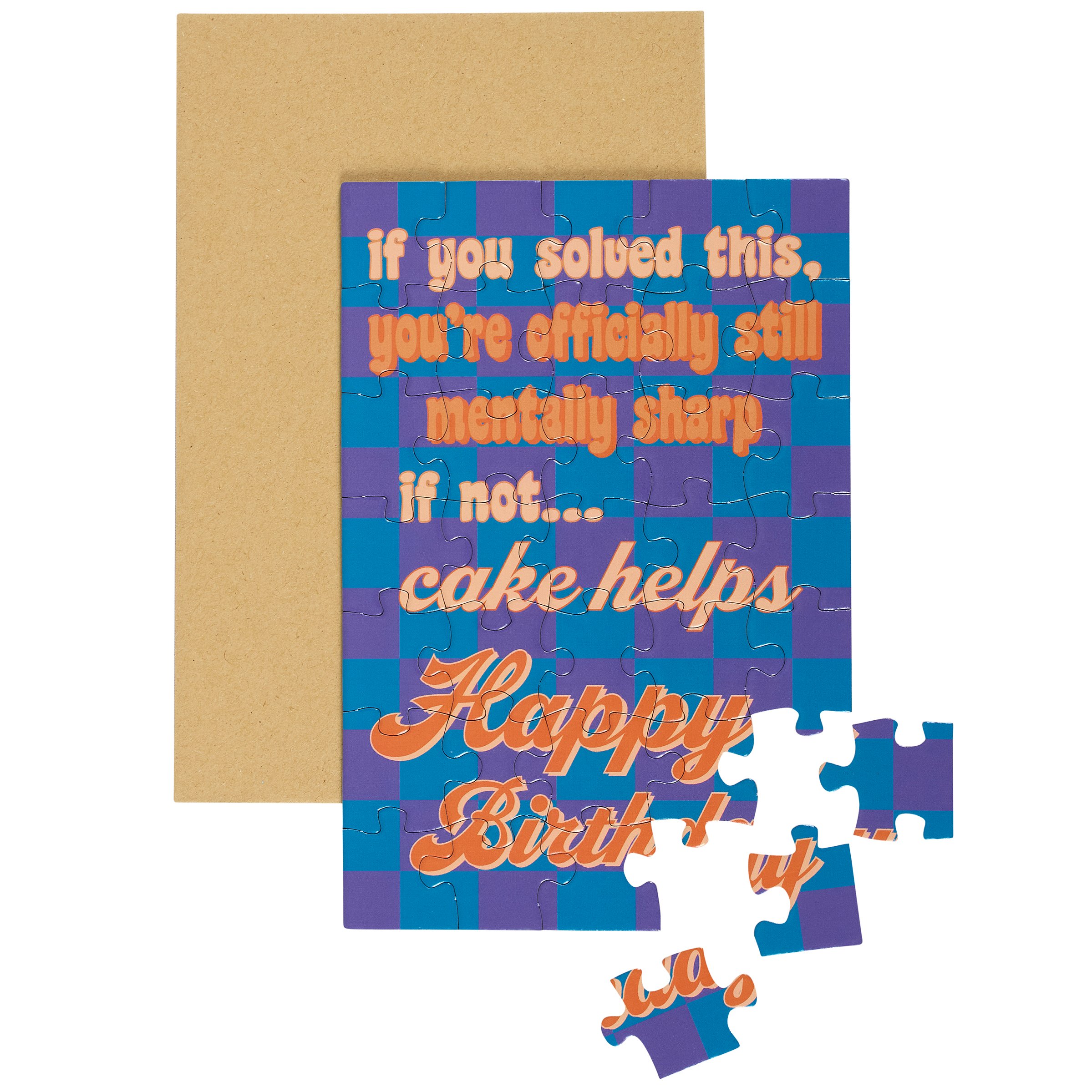 Don't just give your feelings away, make 'em work for it. Our greeting card puzzles combine the feels of receiving a birthday card with the satisfaction of completing a puzzle. This sassy puzzle card includes a blank space on the back to write a personal message, or express creativity in any way, before breaking up the puzzle for someone special to piece together the fun inside! We get them started with a sassy birthday sentiment on the front in a fun retro style that reads "If You Solved This, You're Officially Still Mentally Sharp. If Not... Cake Helps. Happy Birthday." After personalizing the back, they break up the 35 piece puzzle and place the pieces in the included kraft envelope. The puzzle card and envelope are packaged in a polybag with an insert displaying easy-to-follow instructions. Due to the shape and weight, extra postage is required when mailing puzzle cards. Our Mentally Sharp puzzle birthday card offers a fun relatable way to wish family or friends a happy birthday letting them know that everyday life can be hard, but we got this.