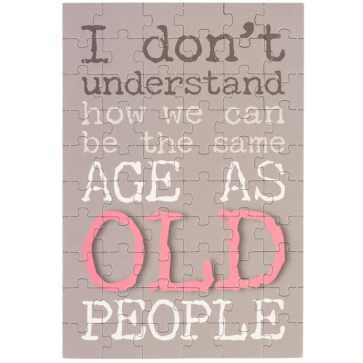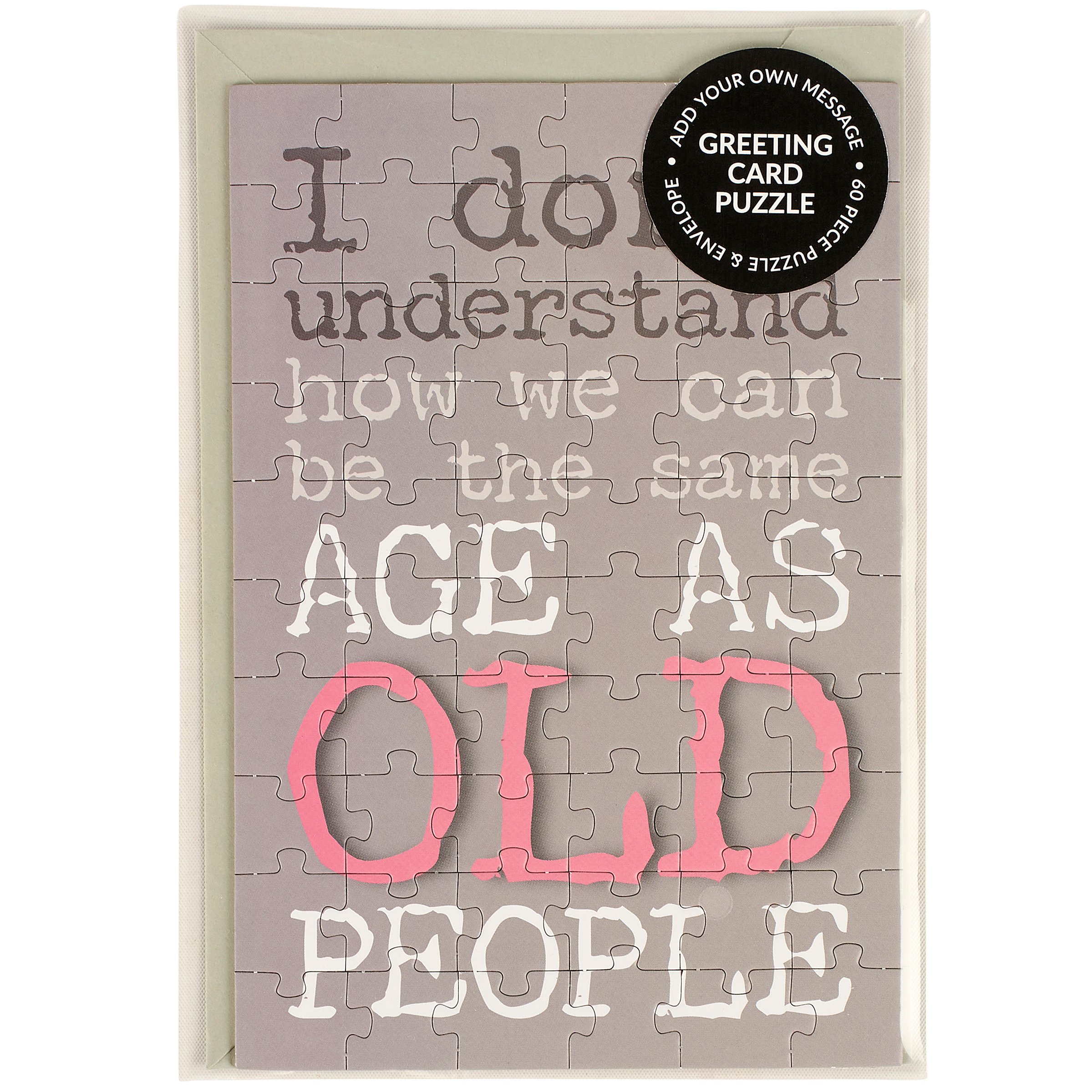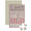 A greeting card puzzle from our Trash Talk By Annie Collection combining the excitement of receiving a greeting card with the joy of completing a puzzle. Our funny puzzle cards include a blank space on the back to write a personal message, or express creativity in any way, before breaking up the puzzle for someone special to piece together the fun inside! We get you started with a humorous age-themed sentiment on the front in a fun retro style that reads "I Don't Understand How We Can Be The Same Age As Old People." After personalizing the back, break up the 60 piece puzzle and place the pieces in the included gray envelope. Everything is packaged in a polybag with an insert displaying easy-to-follow instructions. Due to the shape and weight, extra postage is required when mailing puzzle cards. There's no need to wait for a special occasion or a specific holiday, our Old People puzzle card is perfect to reach out to friends and family for any moment.