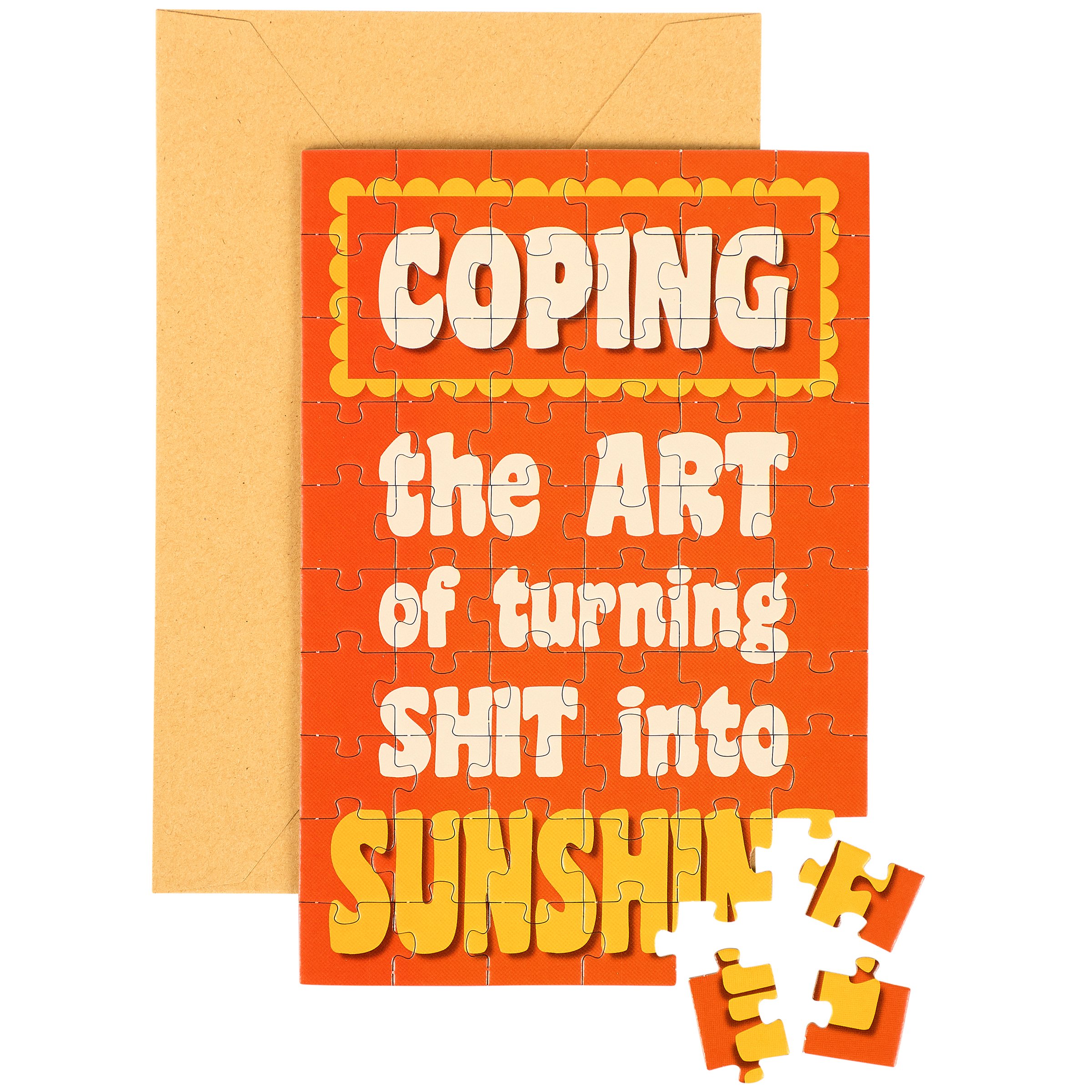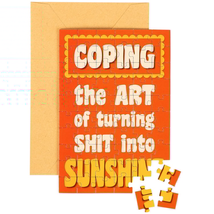 Don't just give your feelings away, make 'em work for it. This relatable greeting card puzzle combines the feels of receiving a card with the satisfaction of completing a puzzle! Questionables puzzle cards include a blank space on the back to write a personal message or express creativity in any way you want before breaking up the puzzle for someone special to piece together the fun inside! We get you started with a sassy inspirational sentiment in a retro style on the front that reads "Coping - The Art Of Turning Shit Into Sunshine." Do your thing on the back, punch out the 60 pieces, and place them in the included envelope. Everything is packaged in a polybag with an insert displaying easy-to-follow instructions. Due to the shape and weight, extra postage is required when mailing puzzle cards. There's no need to wait for a special occasion or a specific holiday, this everyday puzzle card is perfect for any moment you want to send a personal message. Our Sunshine puzzle card calls back to a retro style while also calling out a modern mentality and offers a more relatable way to reach out to friends and family.