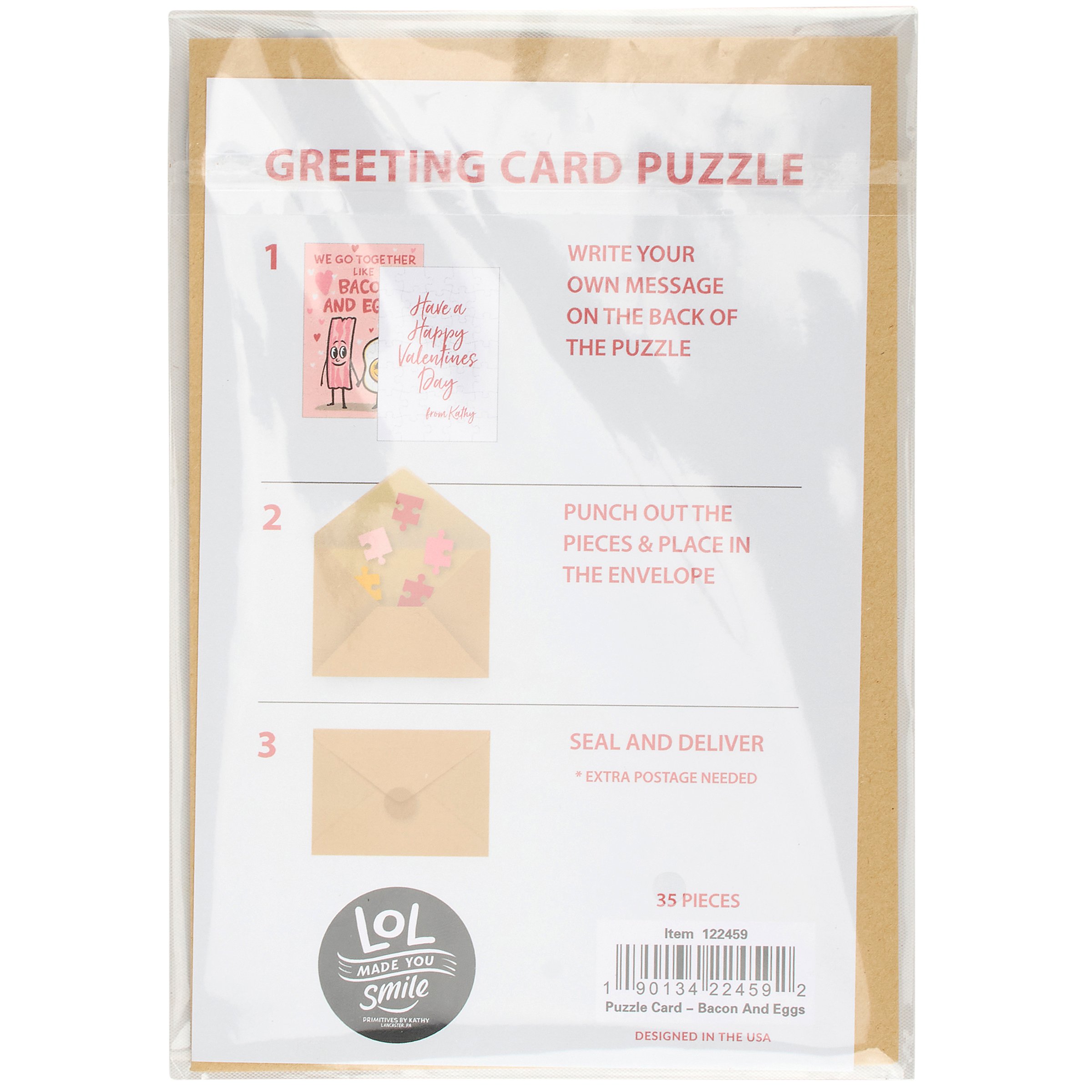 A greeting card puzzle from our Valentine's Day Collection combining the excitement of receiving a greeting card with the joy of completing a puzzle. This Valentine's Day puzzle card includes a blank space on the back to write a personal message, or express creativity in any way, before breaking up the puzzle for someone special to piece together the fun inside! We get them started with a fun love inspired design on the front featuring a hand illustrated bacon and egg character couple with a food-themed sentiment that reads "We Go Together Like Bacon And Eggs." After personalizing the back, break up the 35 piece puzzle and place the pieces in the included kraft envelope. Our We Go Together Like Bacon And Eggs puzzle card and envelope is packaged in a polybag with an insert displaying easy-to-follow instructions. Due to the shape and weight, extra postage is required when mailing puzzle cards. A food-themed greeting card that offers a fun alternative for Valentine's Day gifting to both friends and partners.