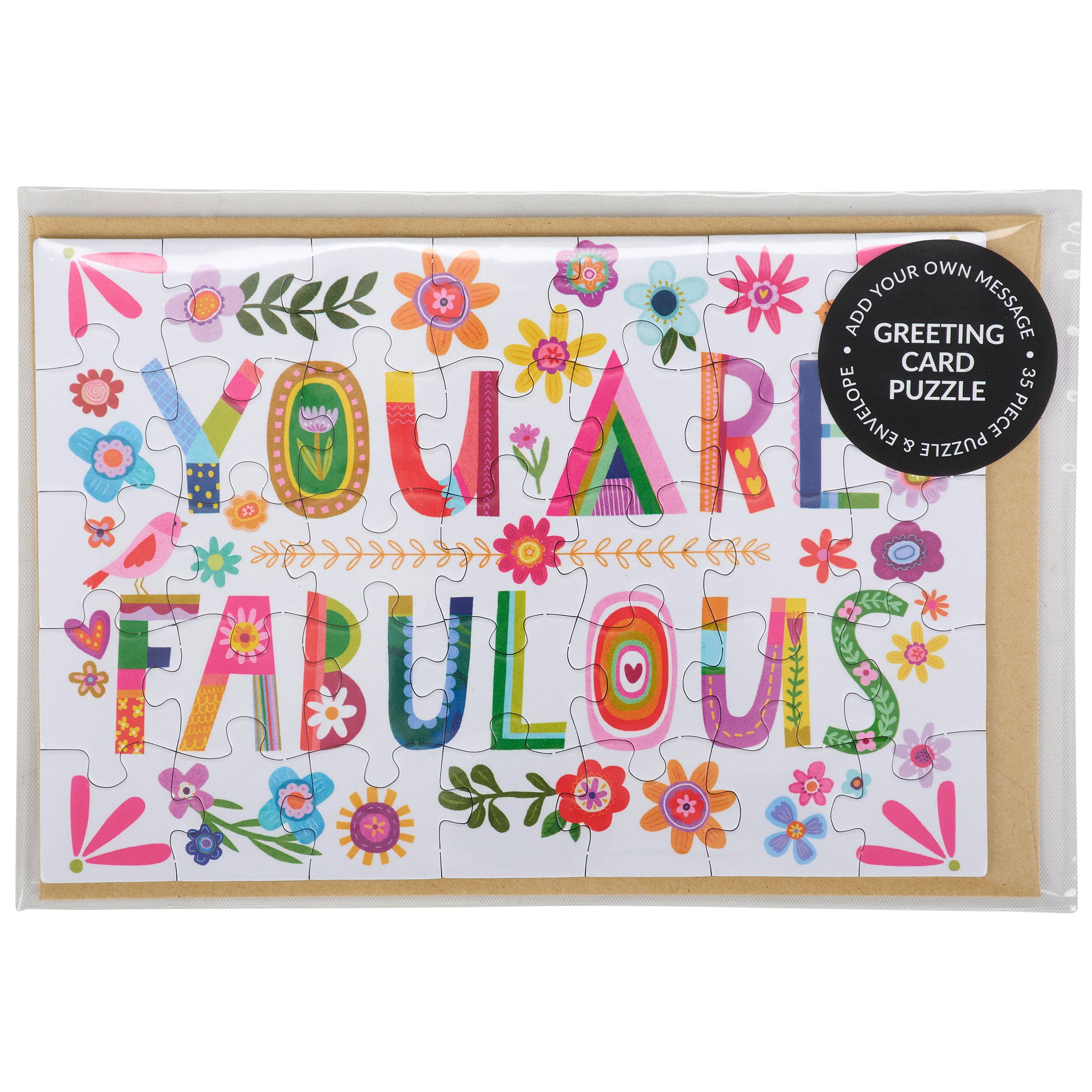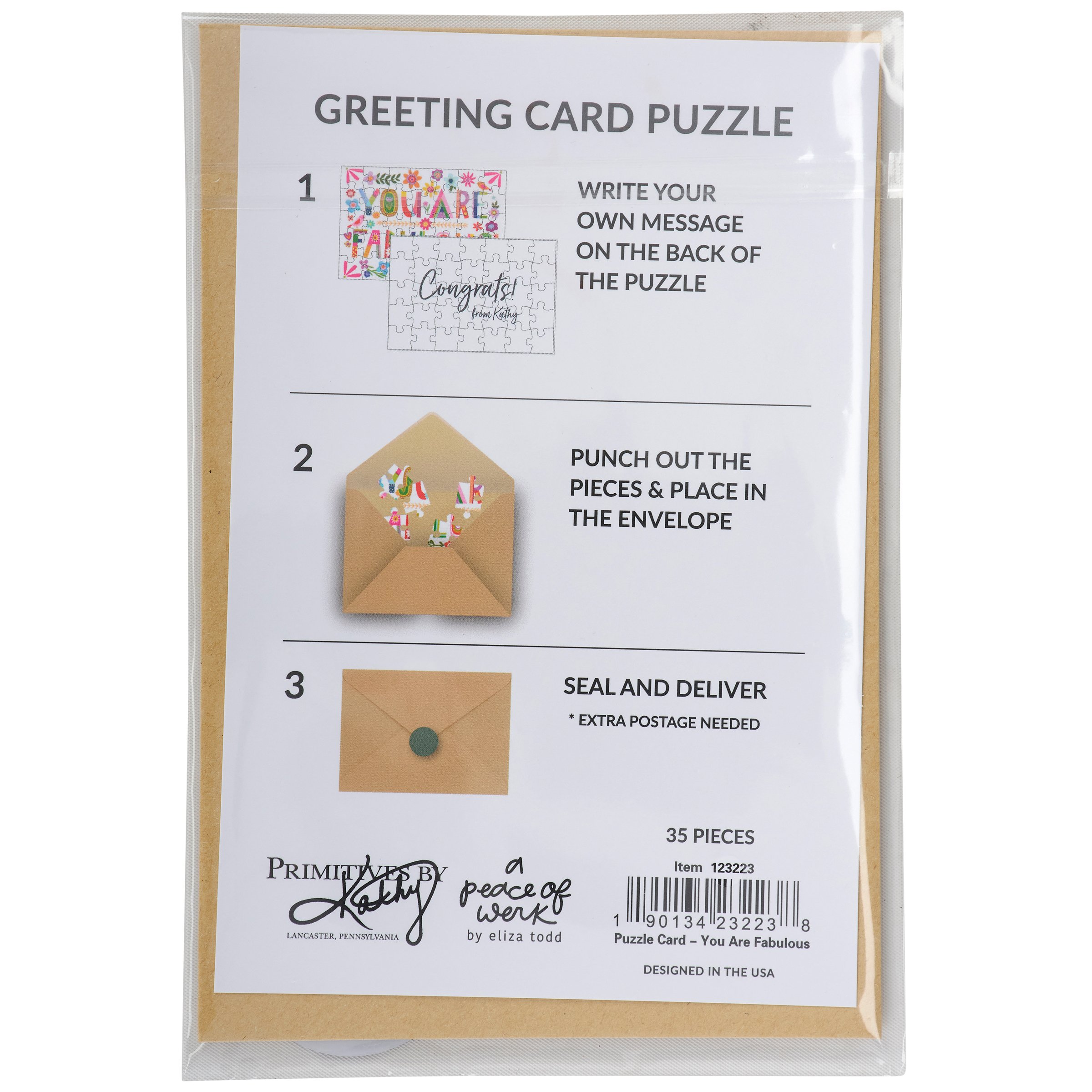 A greeting card puzzle from our Inspiration & Blooms Collection combining the excitement of receiving a greeting card with the joy of completing a puzzle. This everyday puzzle card includes a blank space on the back to write a personal message, or express creativity in any way, before breaking up the puzzle for someone special to piece together the fun inside! We get them started with a fun inspirational design on the front featuring colorful hand illustrated florals around a sentiment that reads "You Are Fabulous." After personalizing the back, they break up the 35 piece puzzle and place the pieces in the included kraft envelope. The puzzle card and envelope is packaged in a polybag with an insert displaying easy-to-follow instructions. Due to the shape and weight, extra postage is required when mailing puzzle cards. There's no need to wait for a special occasion or a specific holiday, our You Are Fabulous puzzle card is perfect for any moment to reach out to friends and family.
