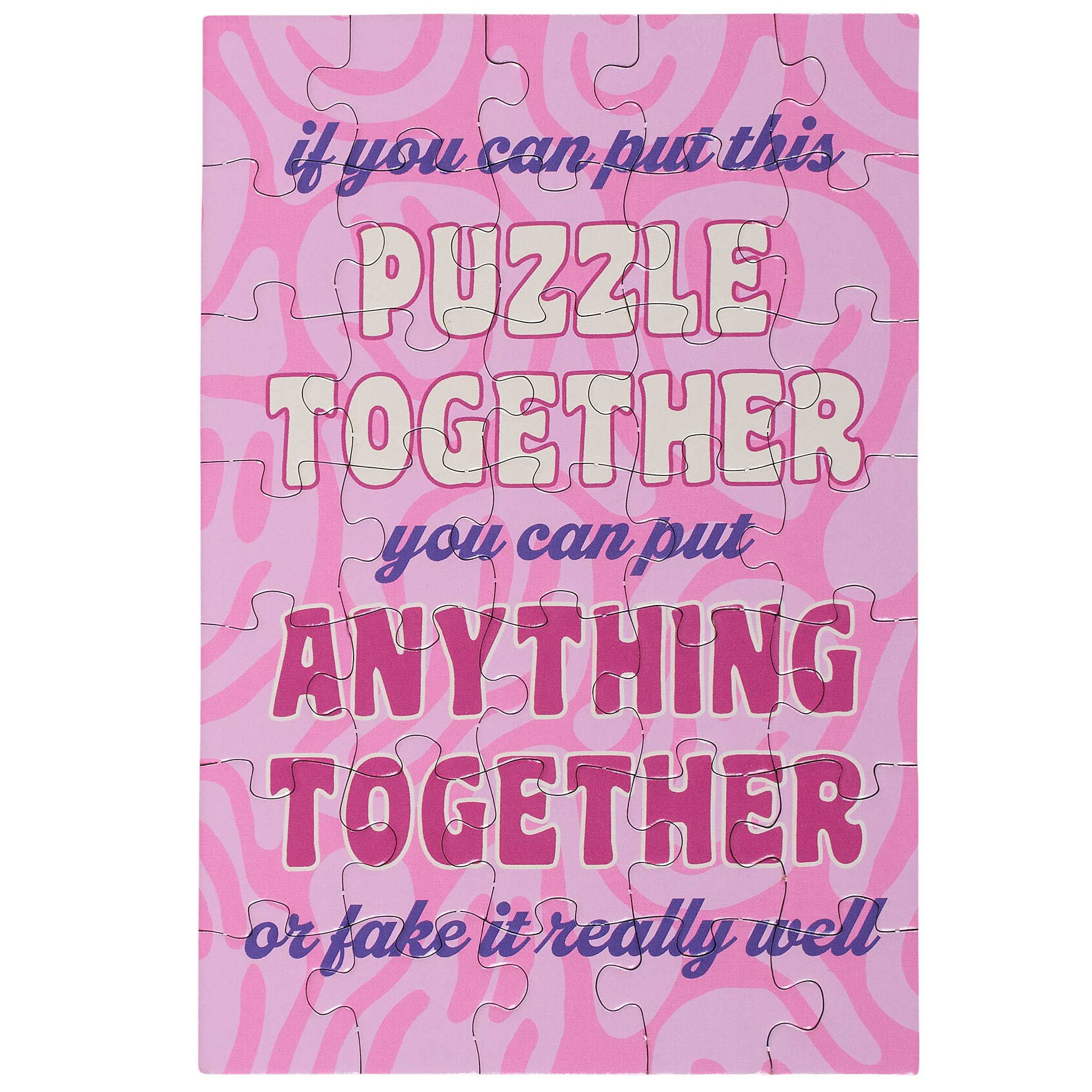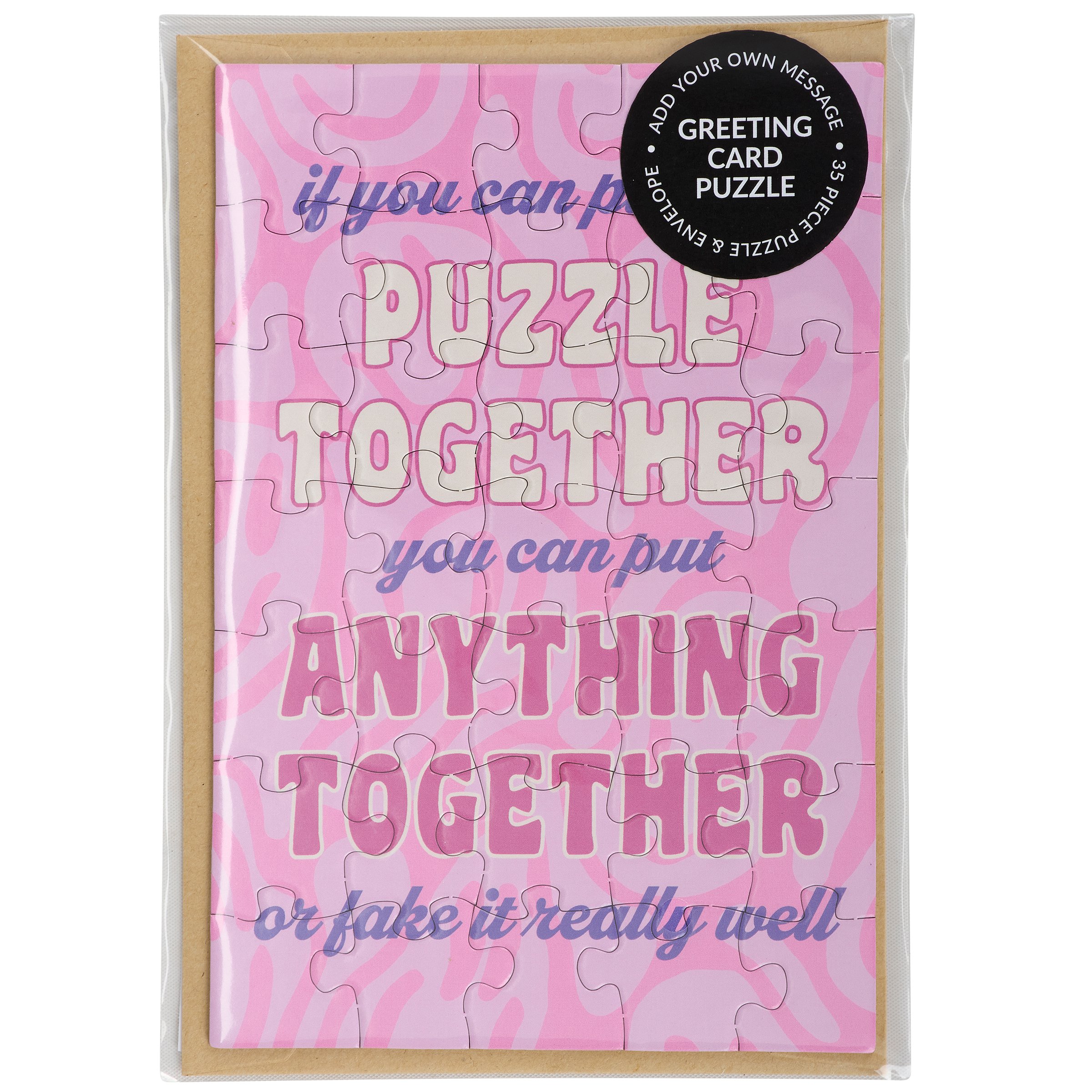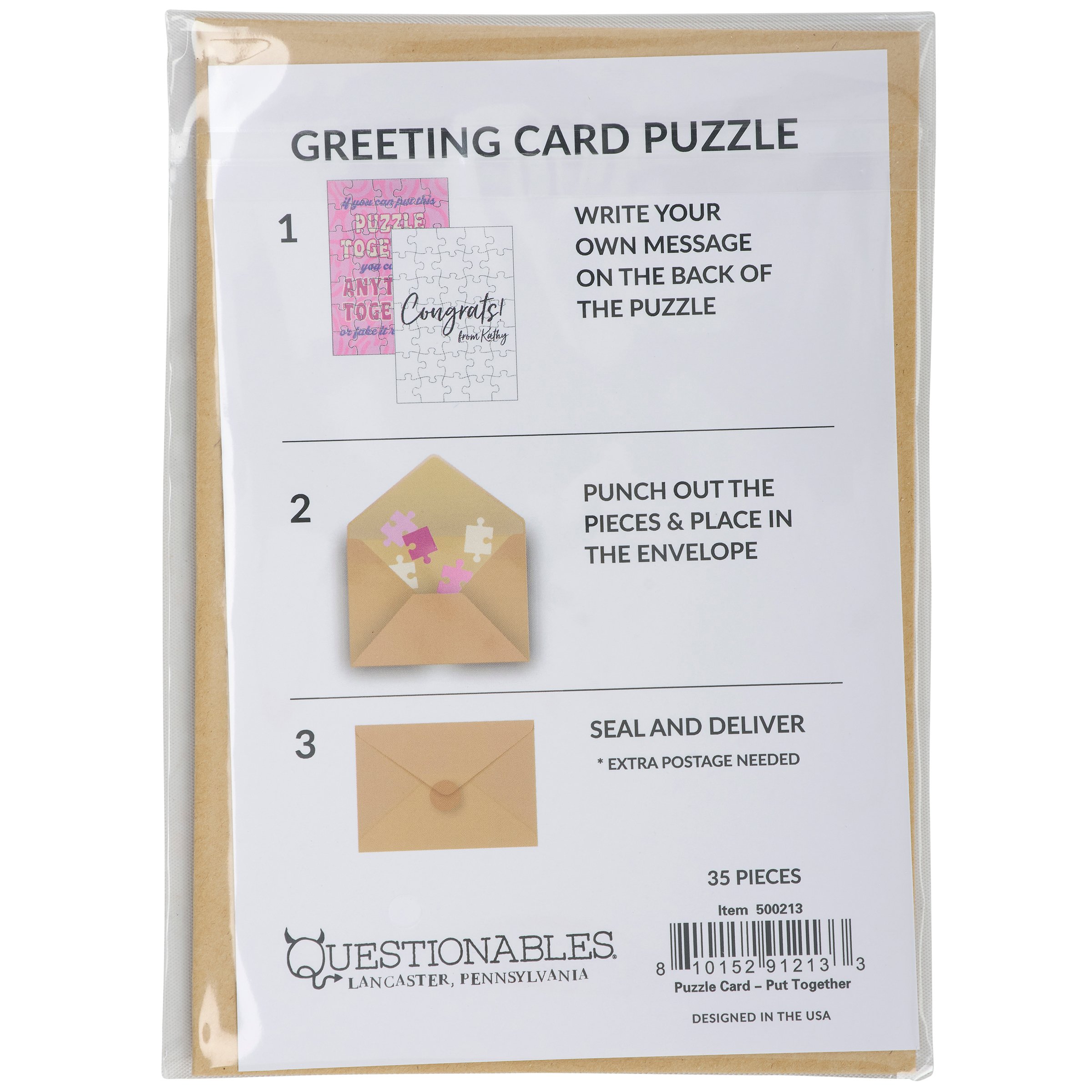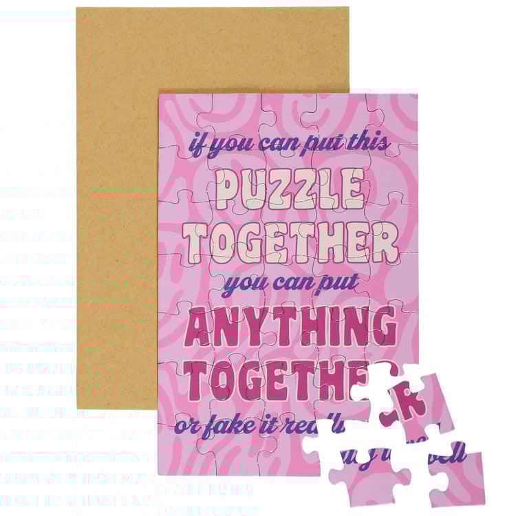 Don't just give your feelings away, make 'em work for it. Our greeting card puzzles combine the feels of receiving a greeting card with the satisfaction of completing a puzzle. This funny puzzle card includes a blank space on the back to write a personal message, or express creativity in any way, before breaking up the puzzle for someone special to piece together the fun inside! We get them started with a funny inspirational themed sentiment on the front in a fun retro style that reads "If You Can Put This Puzzle Together You Can Put Anything Together Or Fake It Really Well." After personalizing the back, they break up the 35 piece puzzle and place the pieces in the included kraft envelope. The puzzle card and envelope are packaged in a polybag with an insert displaying easy-to-follow instructions. Due to the shape and weight, extra postage is required when mailing puzzle cards. There's no need to wait for a special occasion or a specific holiday, our Puzzle Together puzzle card is perfect for any moment they want to reach out to friends and family.