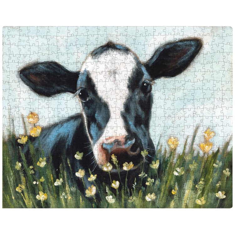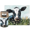 A 1,000 piece puzzle from our Farmhouse Collection features a cow design. Design is replicated from original artwork painted onto burlap canvas, giving the art a unique depth and texture. Puzzle pieces are packaged in a resealable plastic bag and enclosed in a cylindrical box with the design wrapped around and a descriptive "Farm Friends Puzzle" sentiment on lid. This Cow puzzle includes 10" x 8" printout of full puzzle image for reference.