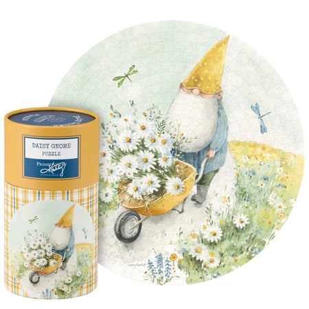 A 500 piece puzzle from our Garden Collection displaying a design of a cheerful gnome gathering daisies and looking at blue dragonflies. Design is replicated from original art hand painted in a delicate watercolor style. Puzzle pieces are packaged in a resealable plastic bag and enclosed in a cylindrical box with the design displayed around outside and a descriptive "Daisy Gnome Puzzle" sentiment on lid. Our Daisy Gnome puzzle includes a printout of full puzzle image for reference. Contains small parts; this is not a toy. A fun daisy-themed accessory great for everyday gifting.