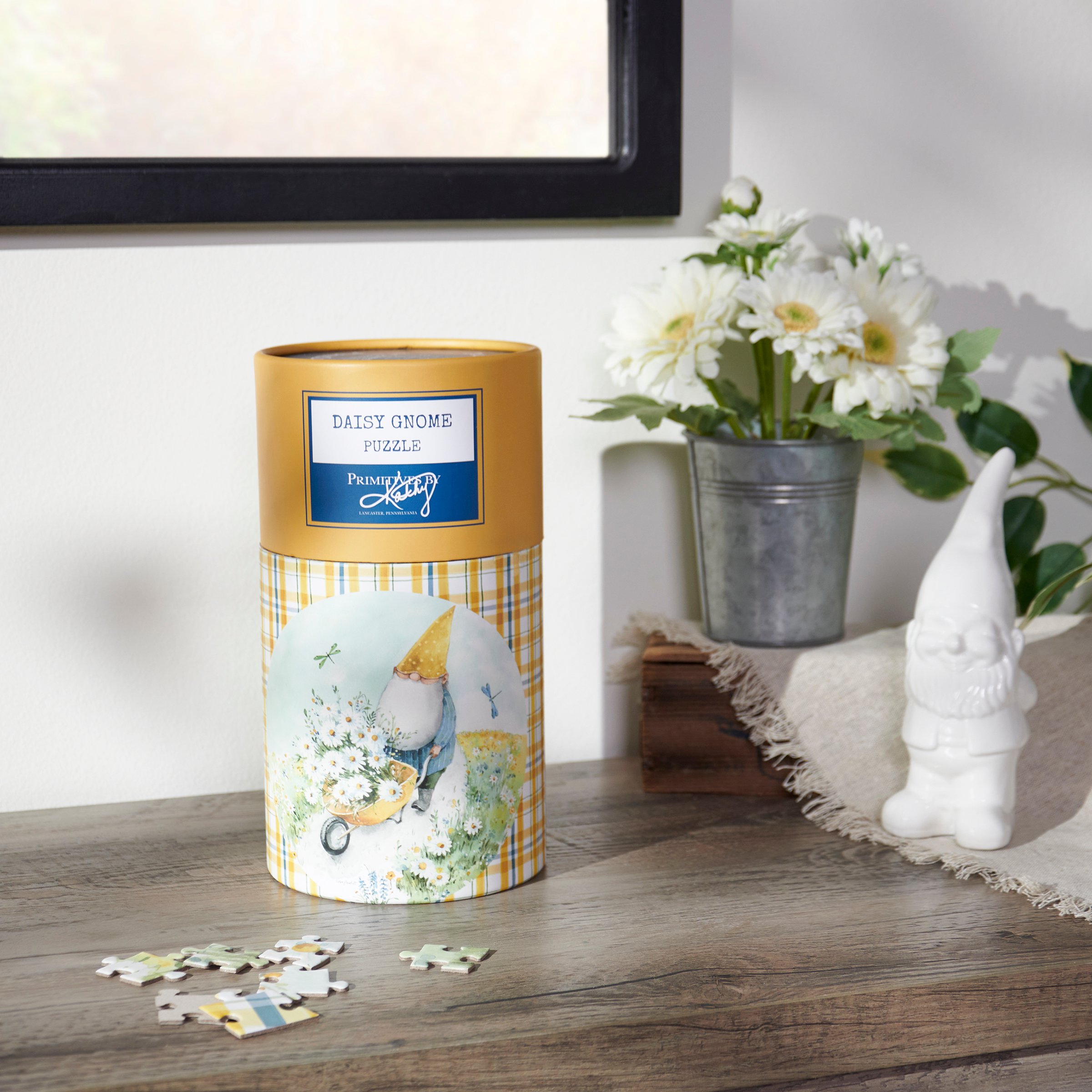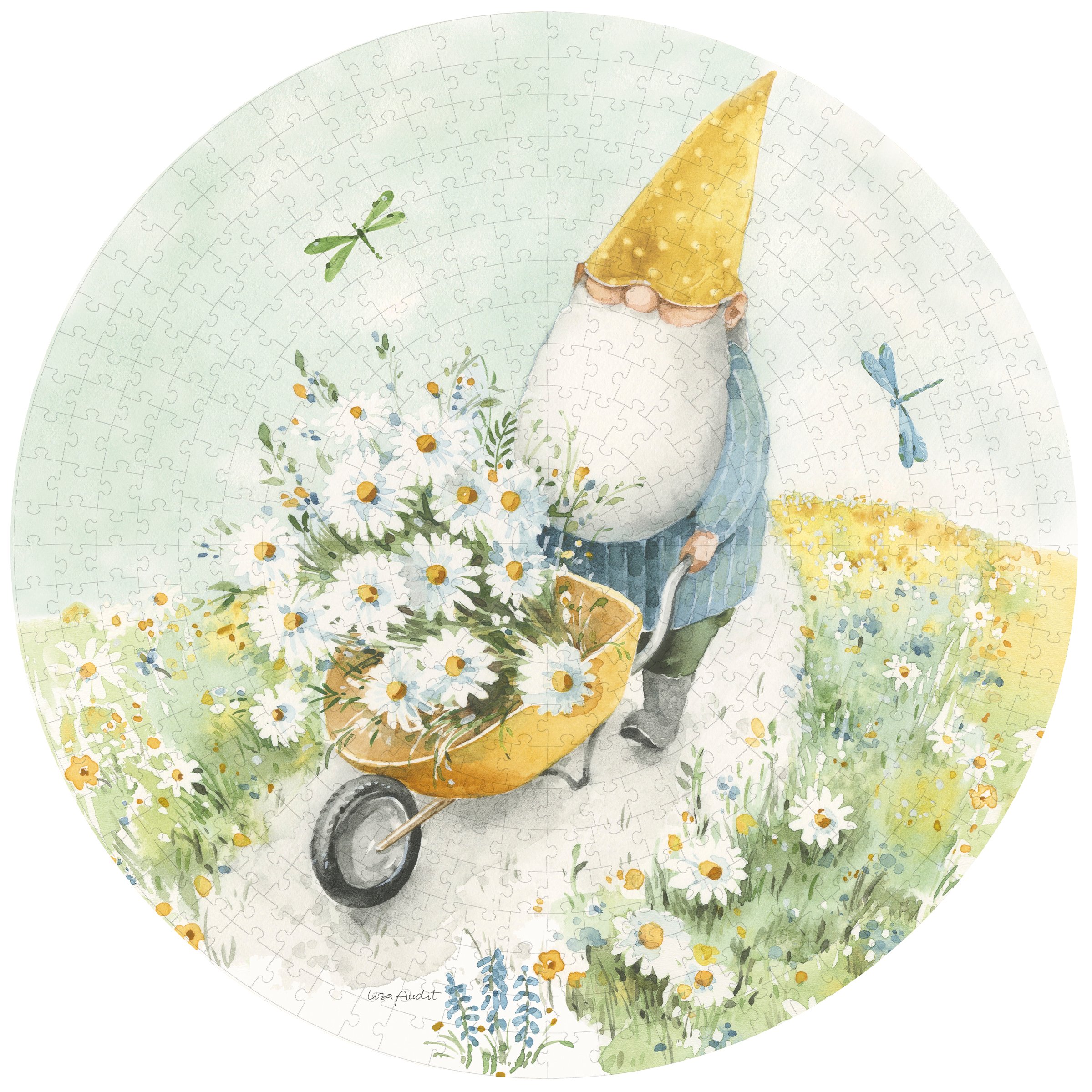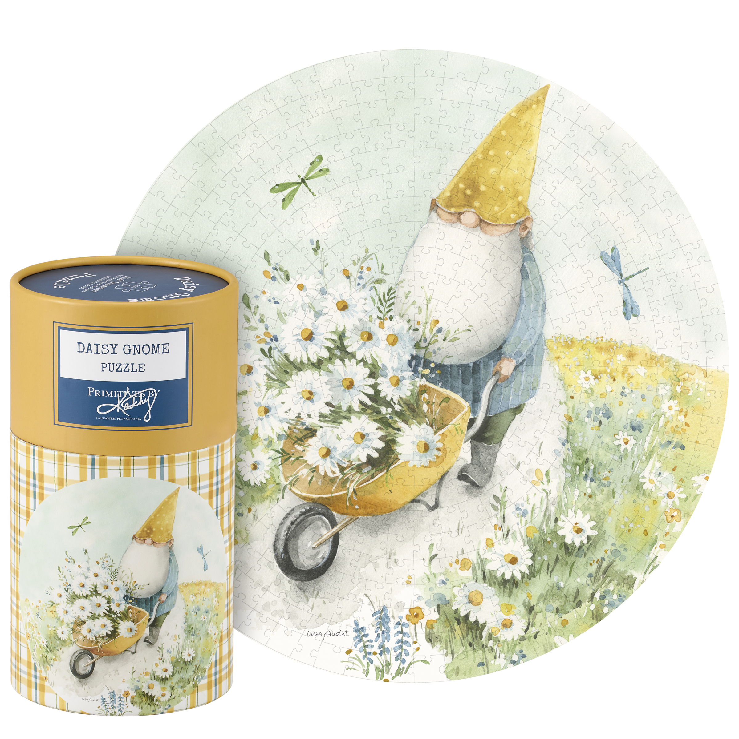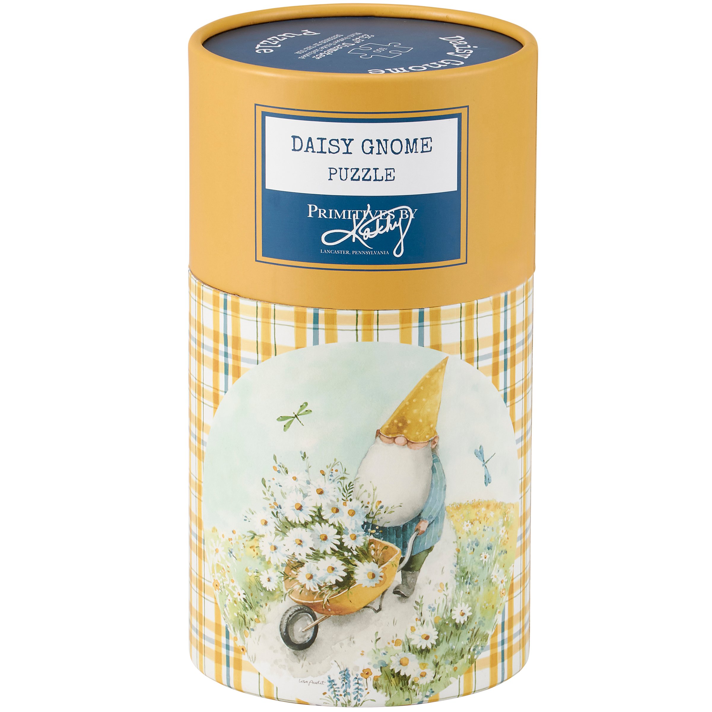 A 500 piece puzzle from our Garden Collection displaying a design of a cheerful gnome gathering daisies and looking at blue dragonflies. Design is replicated from original art hand painted in a delicate watercolor style. Puzzle pieces are packaged in a resealable plastic bag and enclosed in a cylindrical box with the design displayed around outside and a descriptive "Daisy Gnome Puzzle" sentiment on lid. Our Daisy Gnome puzzle includes a printout of full puzzle image for reference. Contains small parts; this is not a toy. A fun daisy-themed accessory great for everyday gifting.