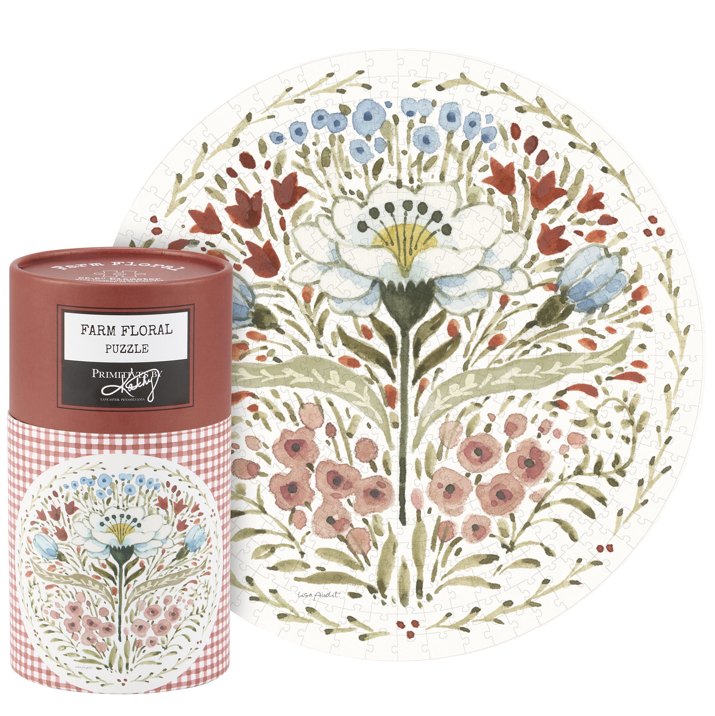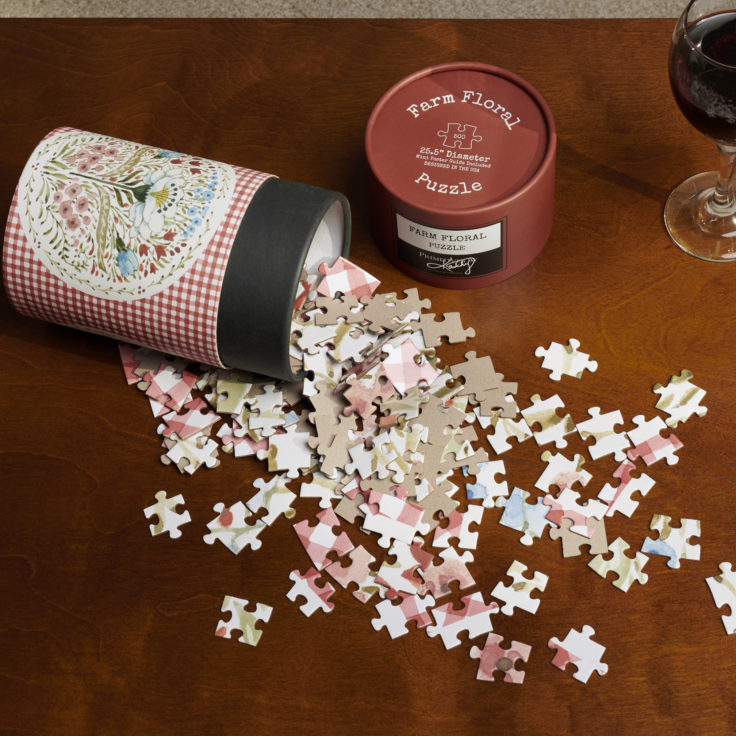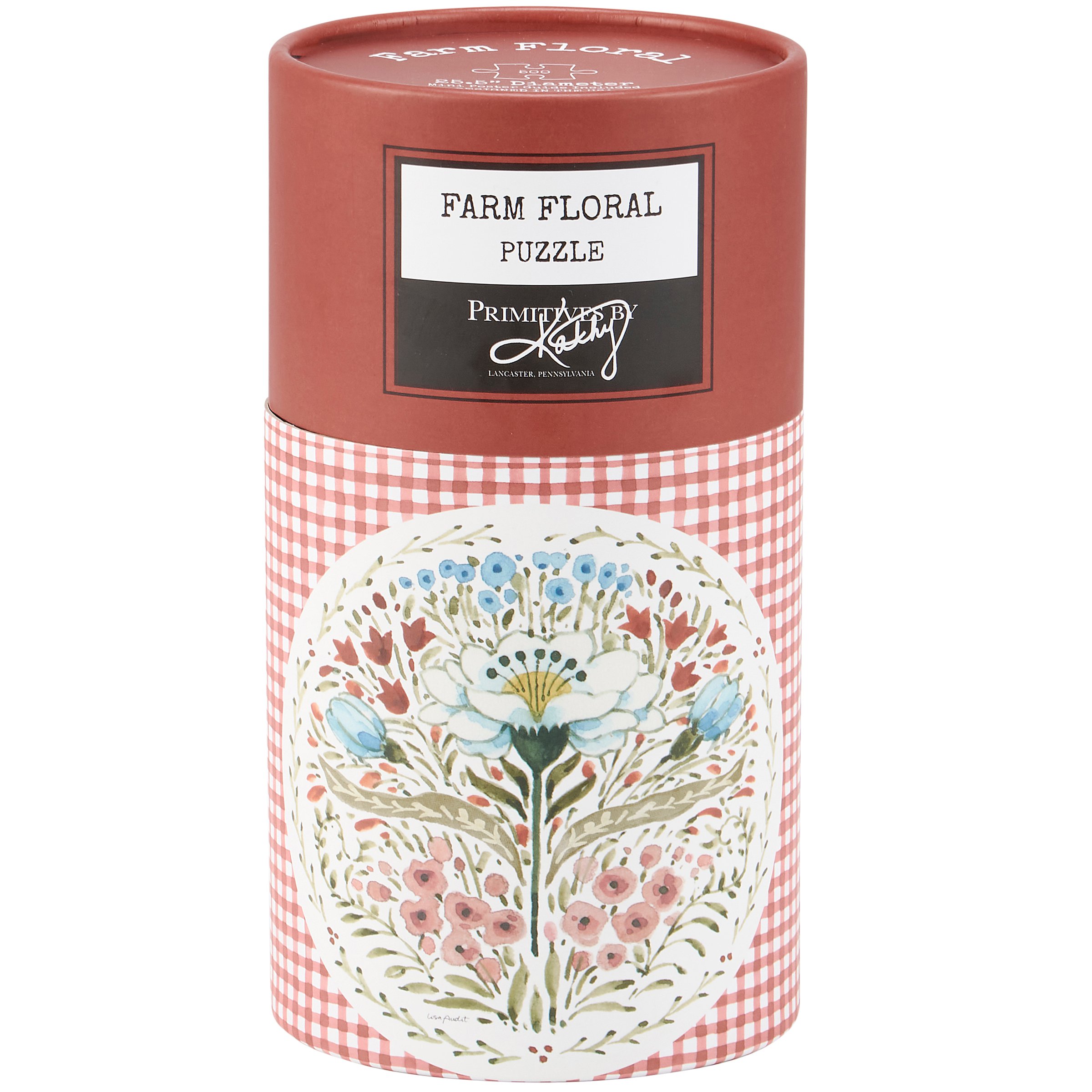 A 500 piece puzzle from our Farmhouse Collection displaying a rustic inspired floral design on a coordinating gingham pattern. Designs are replicated from original art hand painted in a delicate watercolor style. Puzzle pieces are packaged in a resealable plastic bag and enclosed in a cylindrical box with the design displayed around outside and a descriptive "Farm Floral Puzzle" sentiment on lid. Our Floral Farmhouse puzzle includes a printout of full puzzle image for reference. Contains small parts; this is not a toy. A rustic inspired accessory great for everyday gifting.