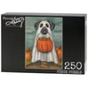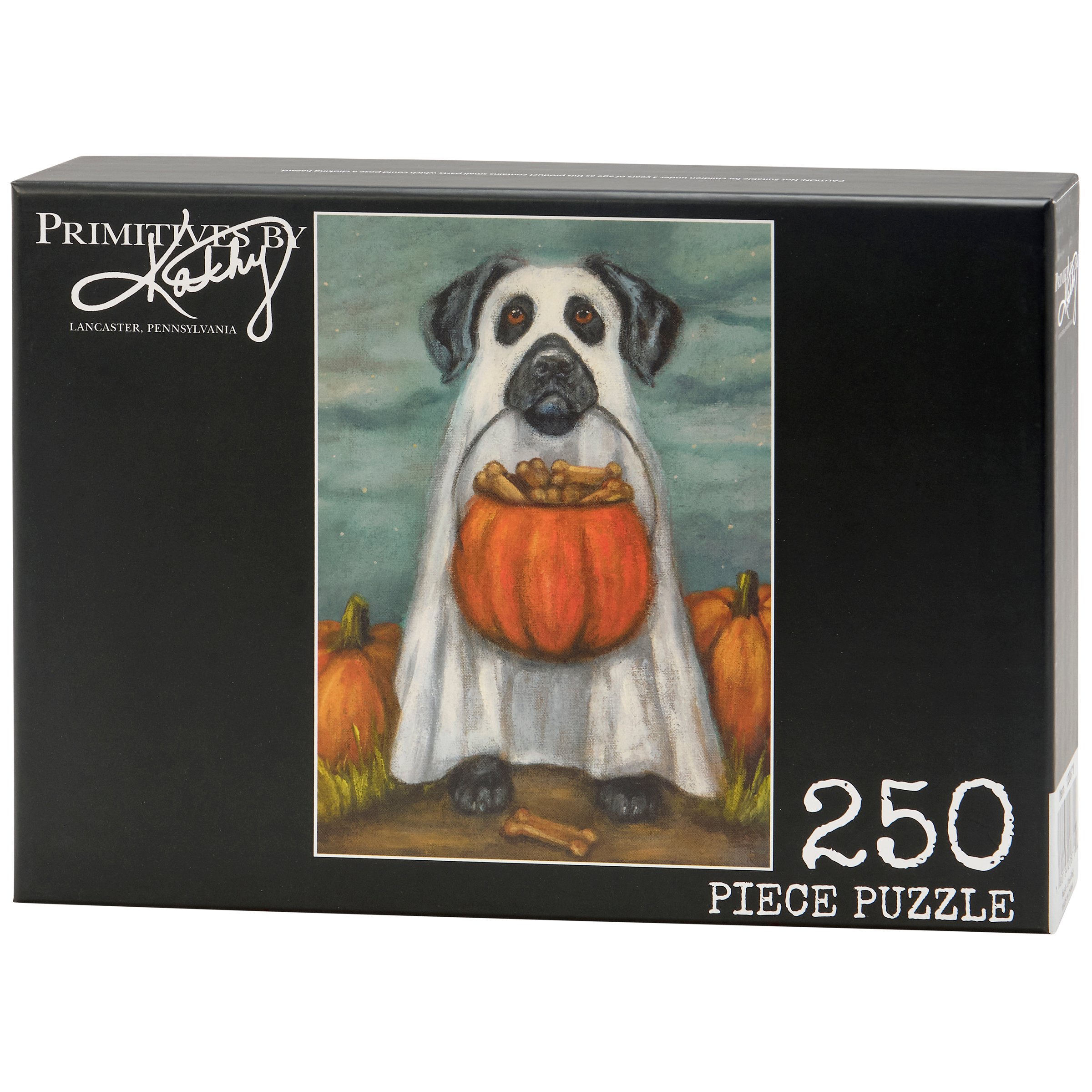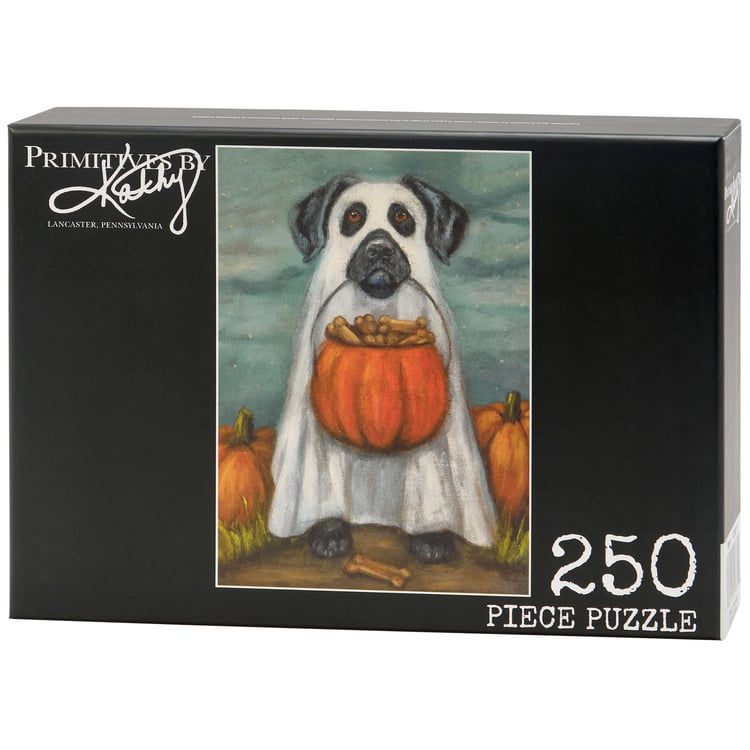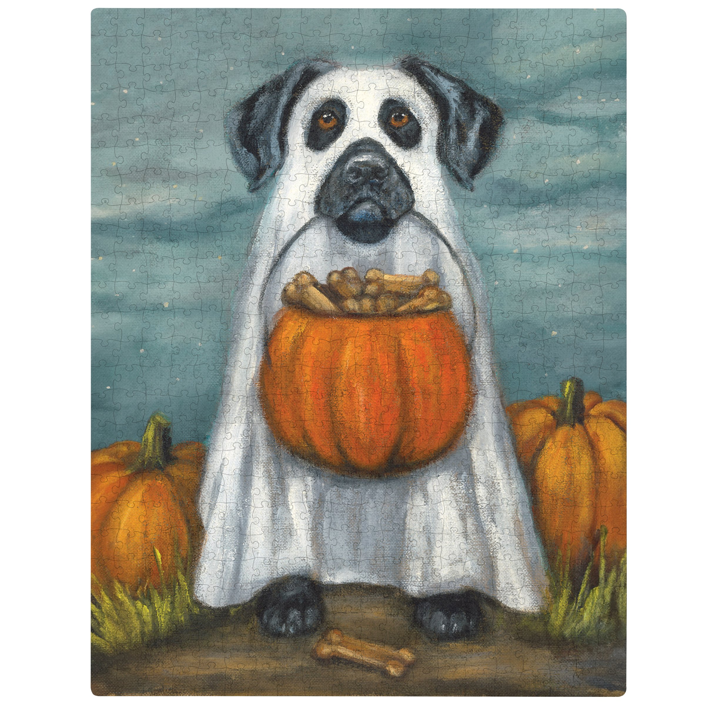 A 250 piece puzzle from our Halloween Collection displaying a charming scene of a dog wearing a ghost costume holding a treat bucket full of dog treats in its mouth. Halloween dog design is replicated from original artwork painted onto burlap canvas, giving the art a unique depth and texture. Puzzle pieces are packaged in a polybag and enclosed in a sturdy box with the full puzzle design displayed. Our Ghost Dog 250 piece puzzle includes a print of full puzzle image for reference. Contains small parts; this is not a toy. A fun pet-themed Halloween puzzle great for gifting.