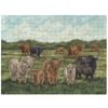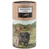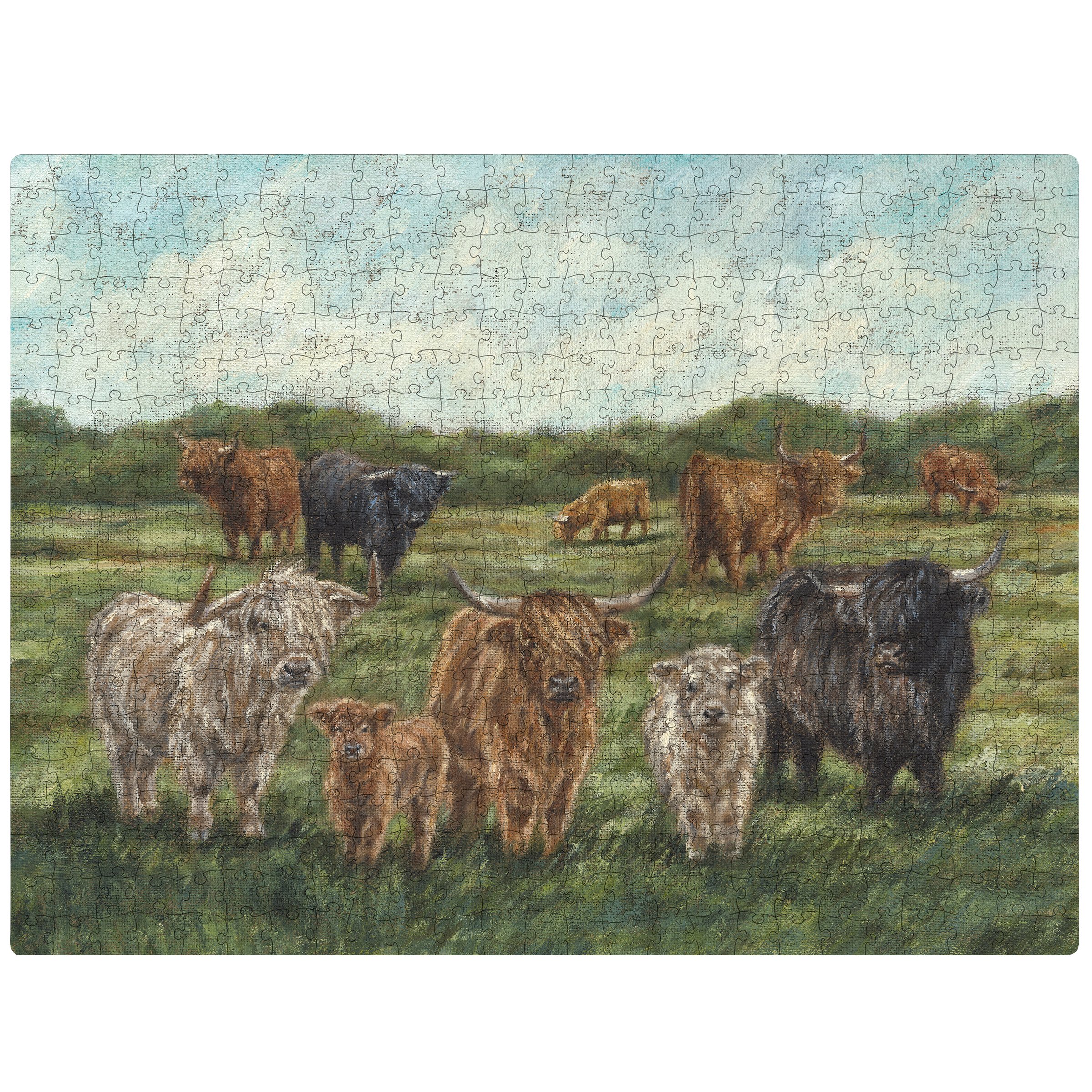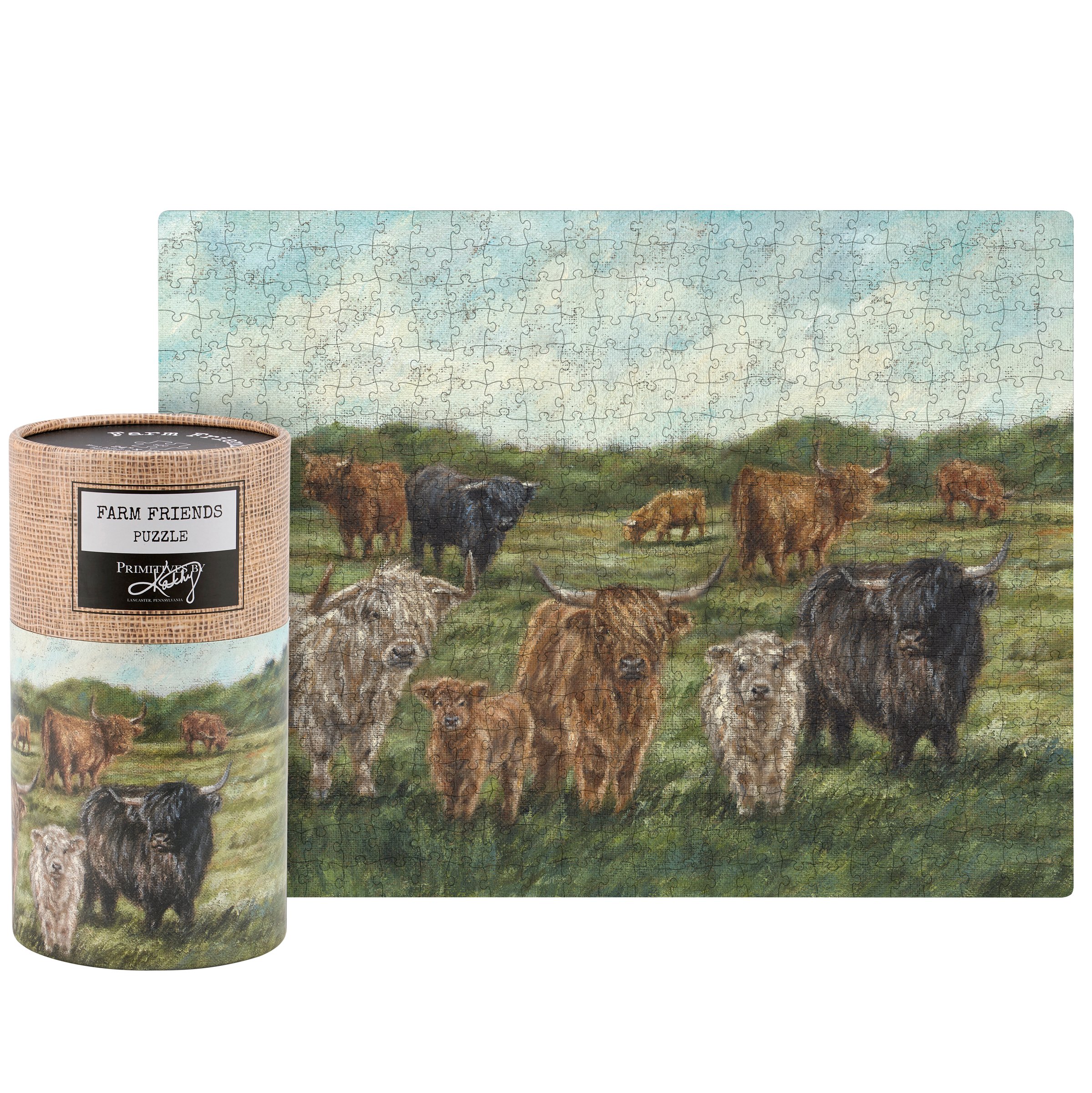 A 500 piece puzzle from our Farmhouse Collection displaying a charming scene of highland cows in a field. Highland cows design is replicated from original artwork painted onto burlap canvas, giving the art a unique depth and texture. Puzzle pieces are packaged in a resealable plastic bag and enclosed in a cylindrical box with the design displayed around outside and a descriptive "Farm Friends Puzzle" sentiment on lid. Our Highland Cows 500 piece puzzle includes a printout of full puzzle image for reference. Contains small parts; this is not a toy. A farm-themed puzzle great for gifting.