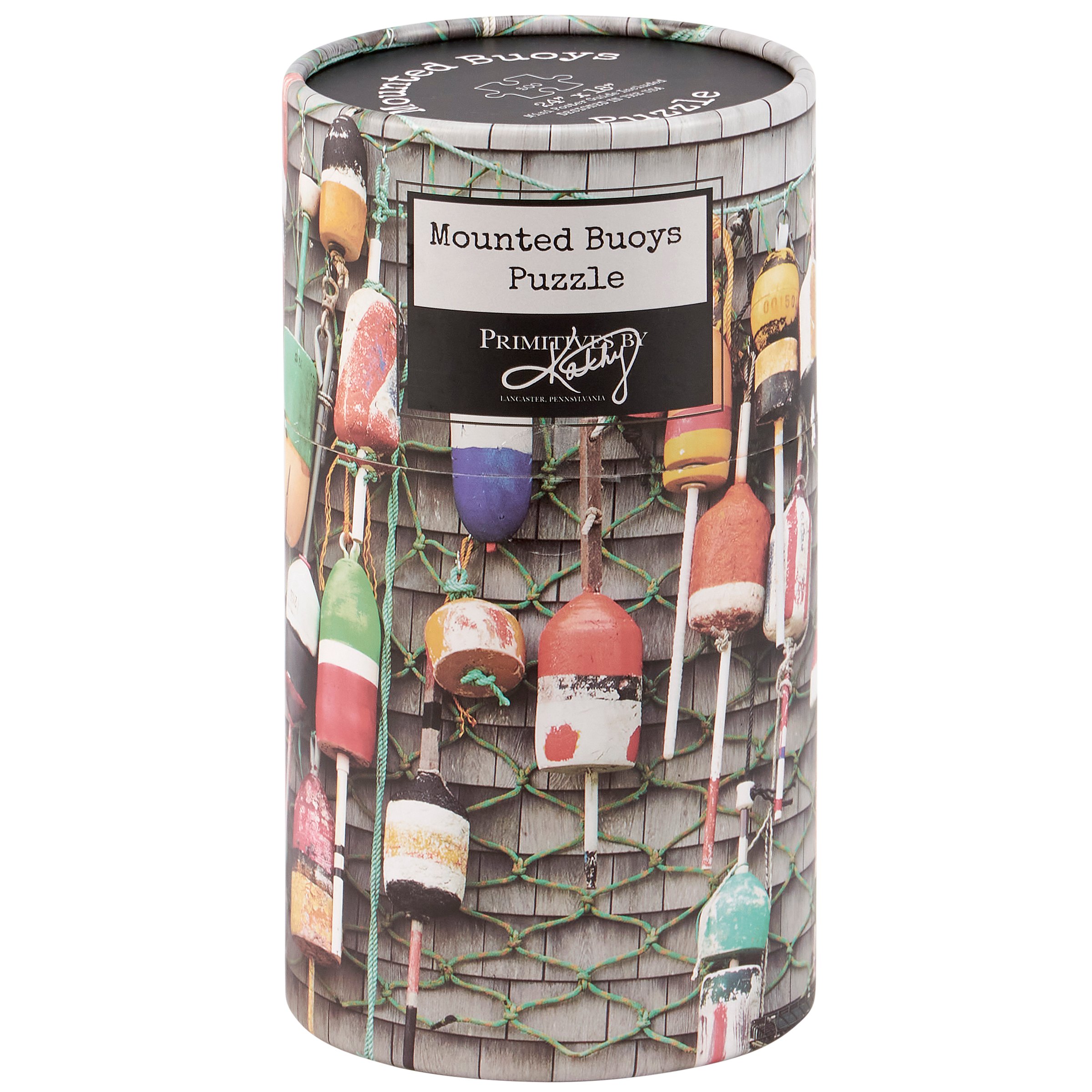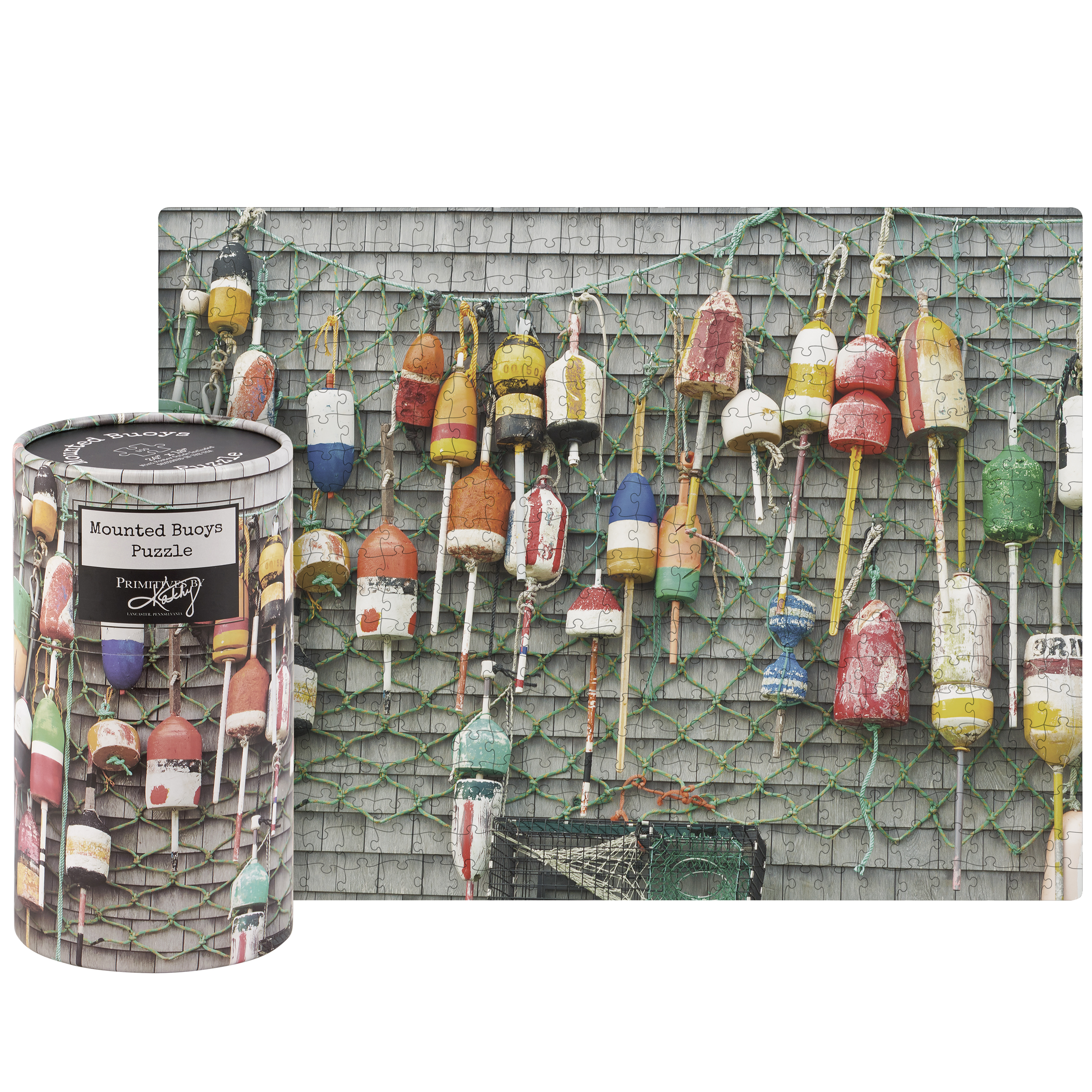 A 500 piece puzzle from our Beach Collection displaying a vintage photograph of various buoys mounted on a wall. Puzzle pieces are packaged in a resealable plastic bag and enclosed in a cylindrical box with the design displayed around outside and a descriptive "Mounted Buoys Puzzle" sentiment on lid. Our Lobster Buoys 500 piece puzzle includes a printout of full puzzle image for reference. Contains small parts; this is not a toy. A vintage beach-themed puzzle great for gifting.