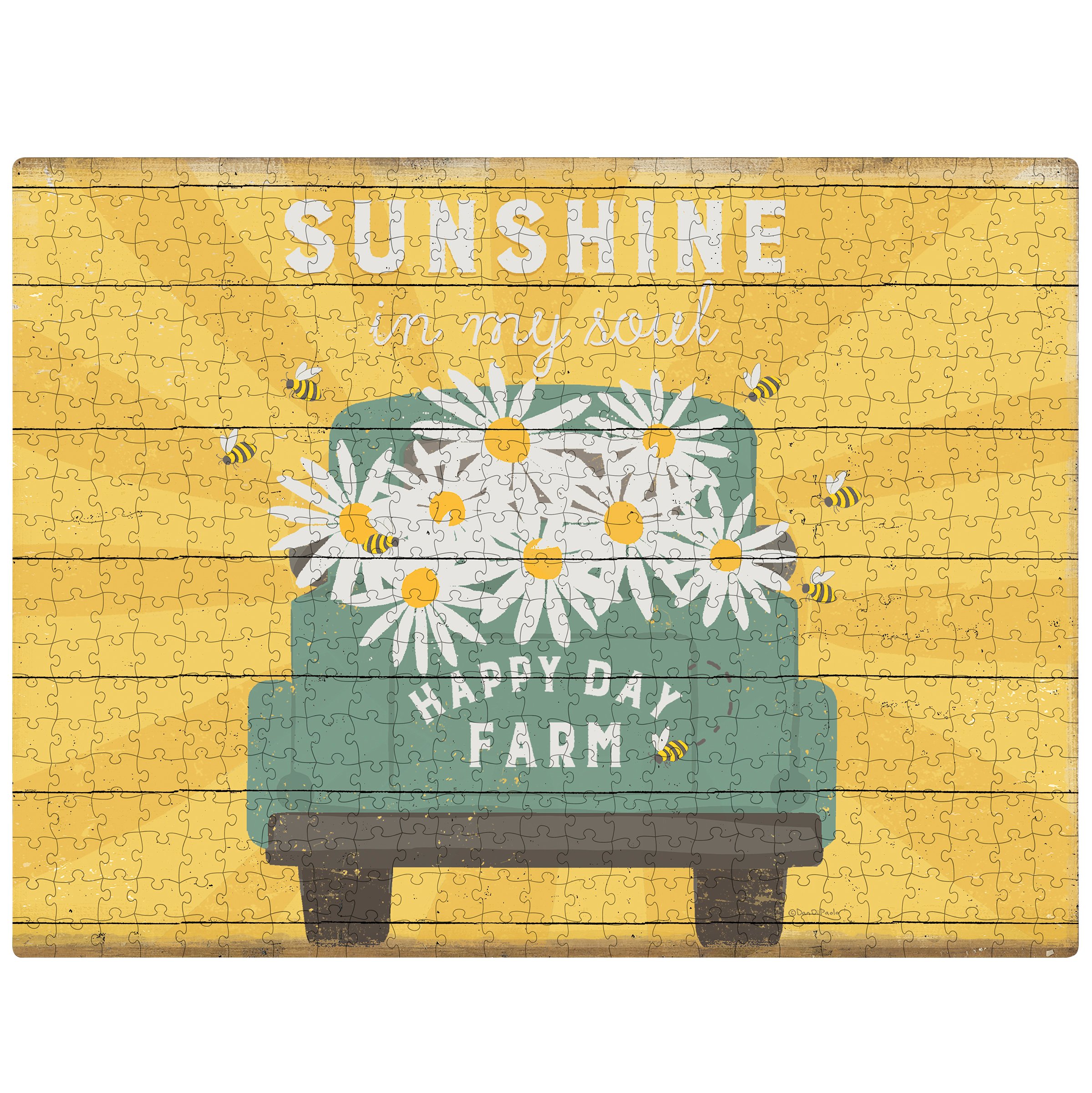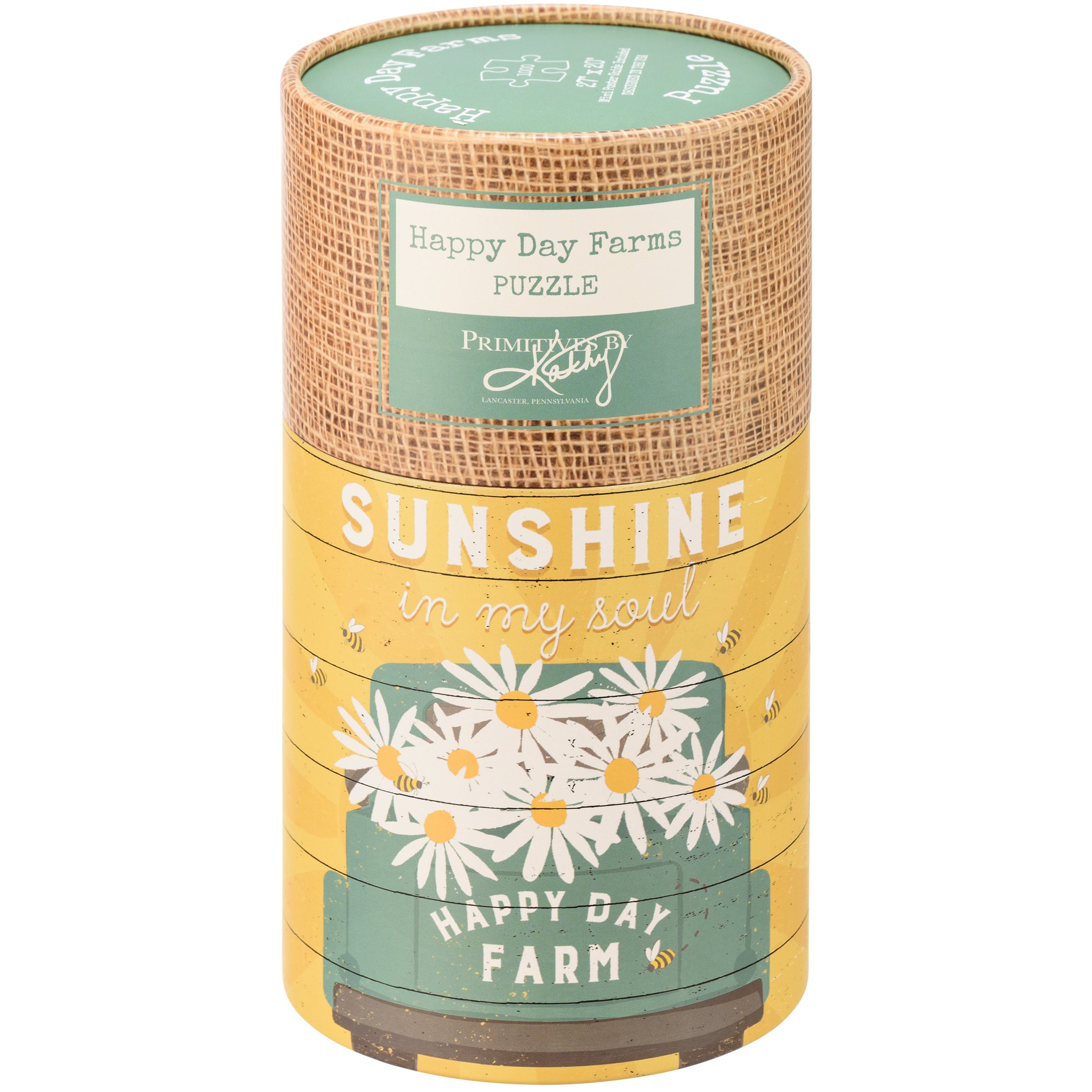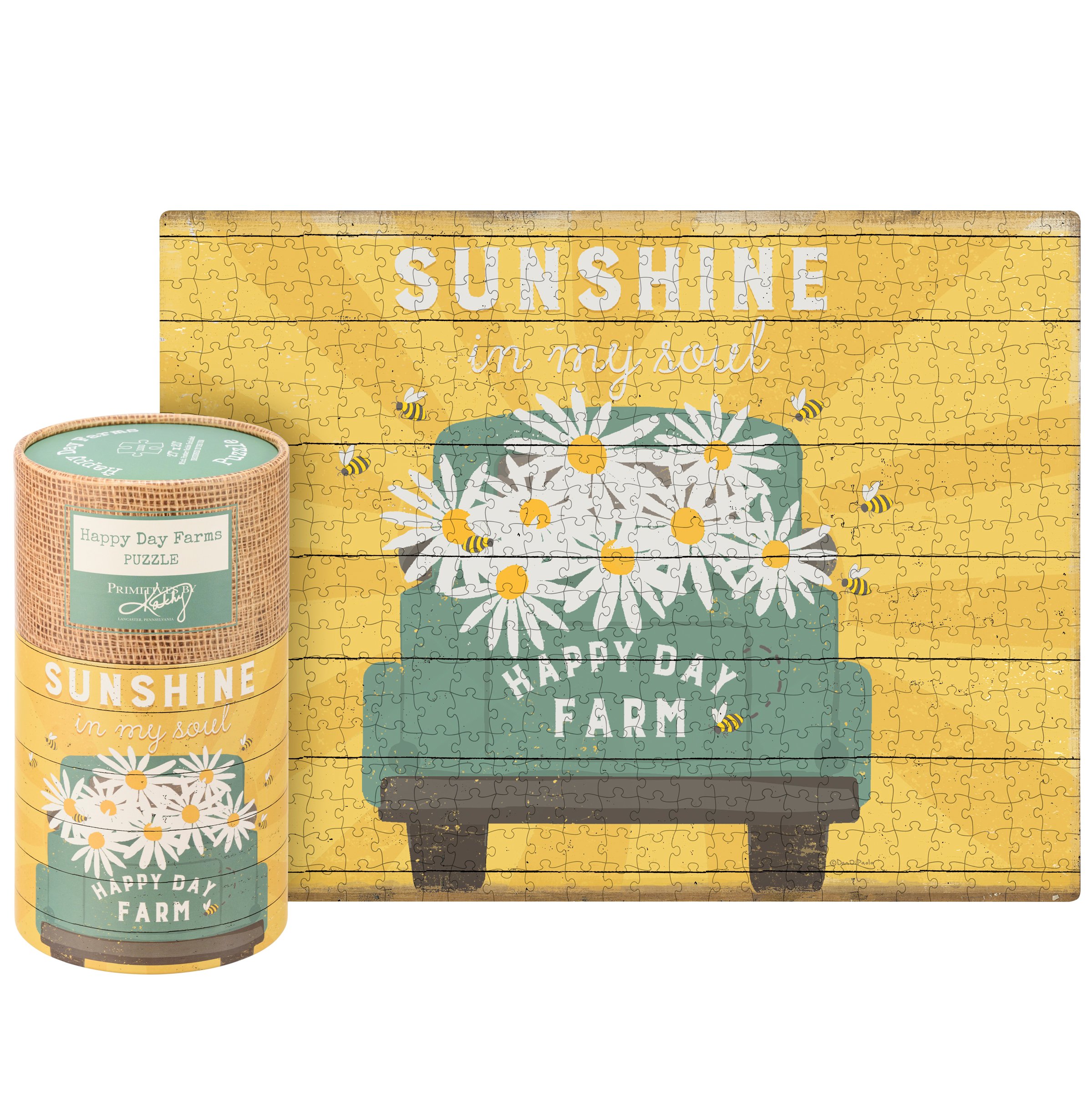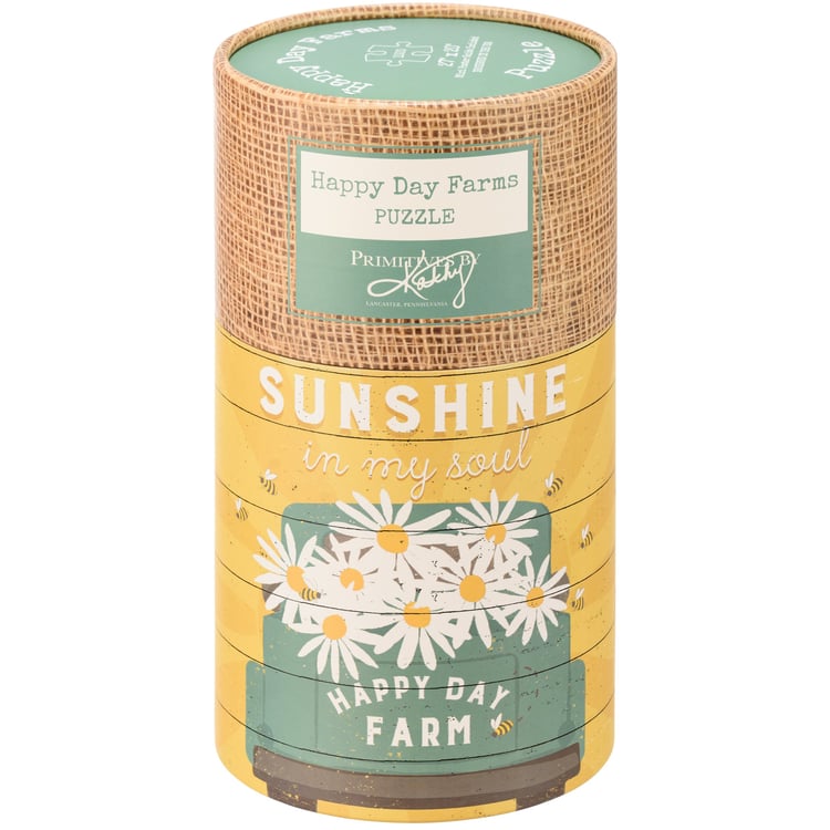 A 1,000 piece puzzle featuring a rustic truck design with "Happy Day Farm" logo and oversized daisies and "Sunshine In My Soul" sentiment. Puzzle pieces are packaged in a resealable plastic bag and enclosed in a cylindrical box with the design wrapped around and a descriptive "Happy Day Farm" sentiment on lid. Includes 10" x 8" printout of full puzzle image for reference.