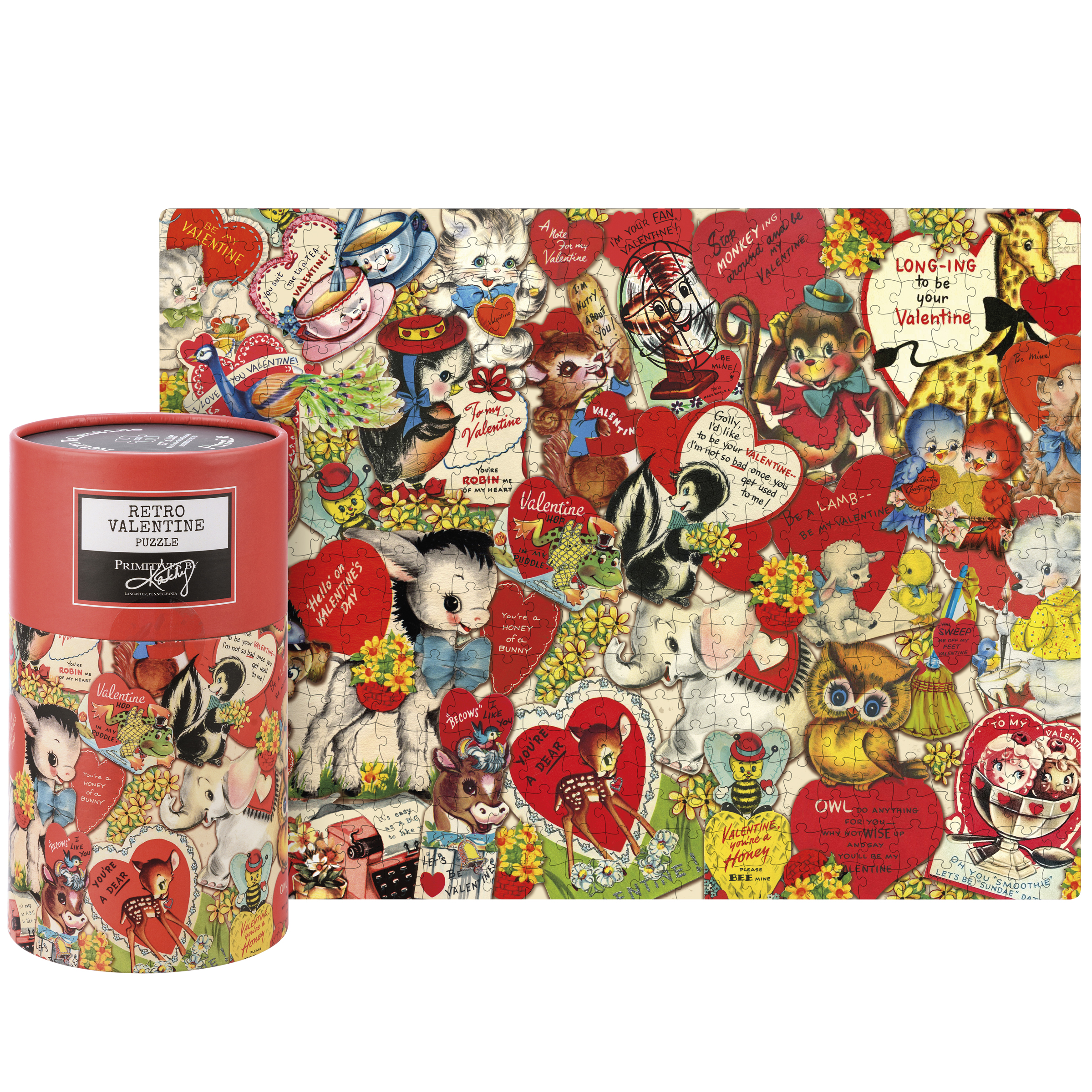 A 1,000 piece puzzle featuring a vintage Valentine design. Puzzle pieces are packaged in a resealable plastic bag and enclosed in a cylindrical box with the design wrapped around lid. Includes 10" x 8" printout of full puzzle image for reference.