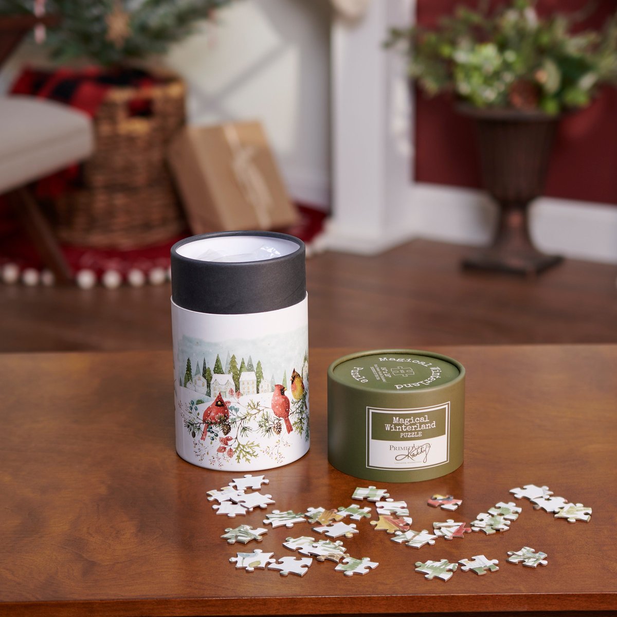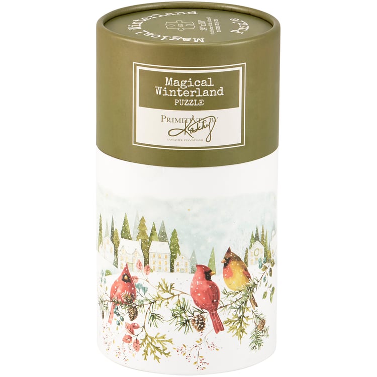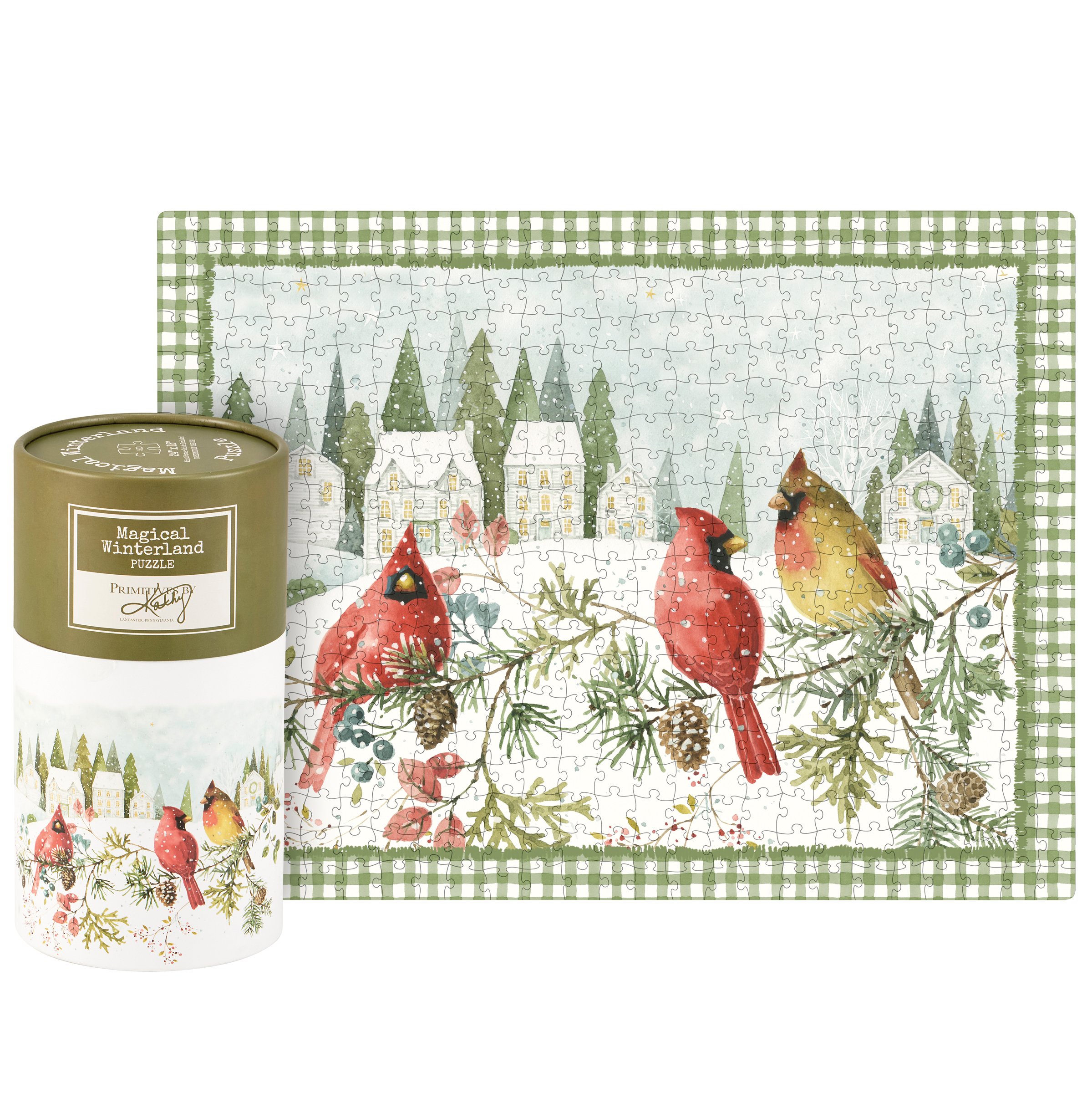 A 500 piece puzzle from our Christmas Collection displaying a charming winter scene of male and female cardinals. Design is replicated from original art hand painted in a delicate watercolor style. Puzzle pieces are packaged in a resealable plastic bag and enclosed in a cylindrical box with the design displayed around outside and a descriptive "Magical Winterland Puzzle" sentiment on lid. Our Winter Cardinals puzzle includes a printout of full puzzle image for reference. Contains small parts; this is not a toy. A winter-themed accessory great for seasonal gifting.