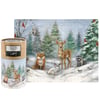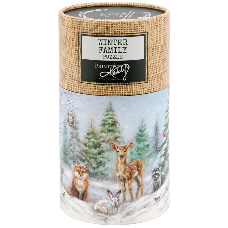 A 500 piece puzzle from our Christmas Collection displaying a charming winter scene of woodland animals in a snowy forest. Winter puzzle design is replicated from original artwork painted onto burlap canvas, giving the art a unique depth and texture. Puzzle pieces are packaged in a resealable plastic bag and enclosed in a cylindrical box with the design displayed around the outside and a descriptive "Winter Family Puzzle" sentiment on lid. Our Winter Family 500 piece puzzle includes a print of full puzzle image for reference. Contains small parts; this is not a toy. A nature-themed Christmas puzzle great for gifting.
