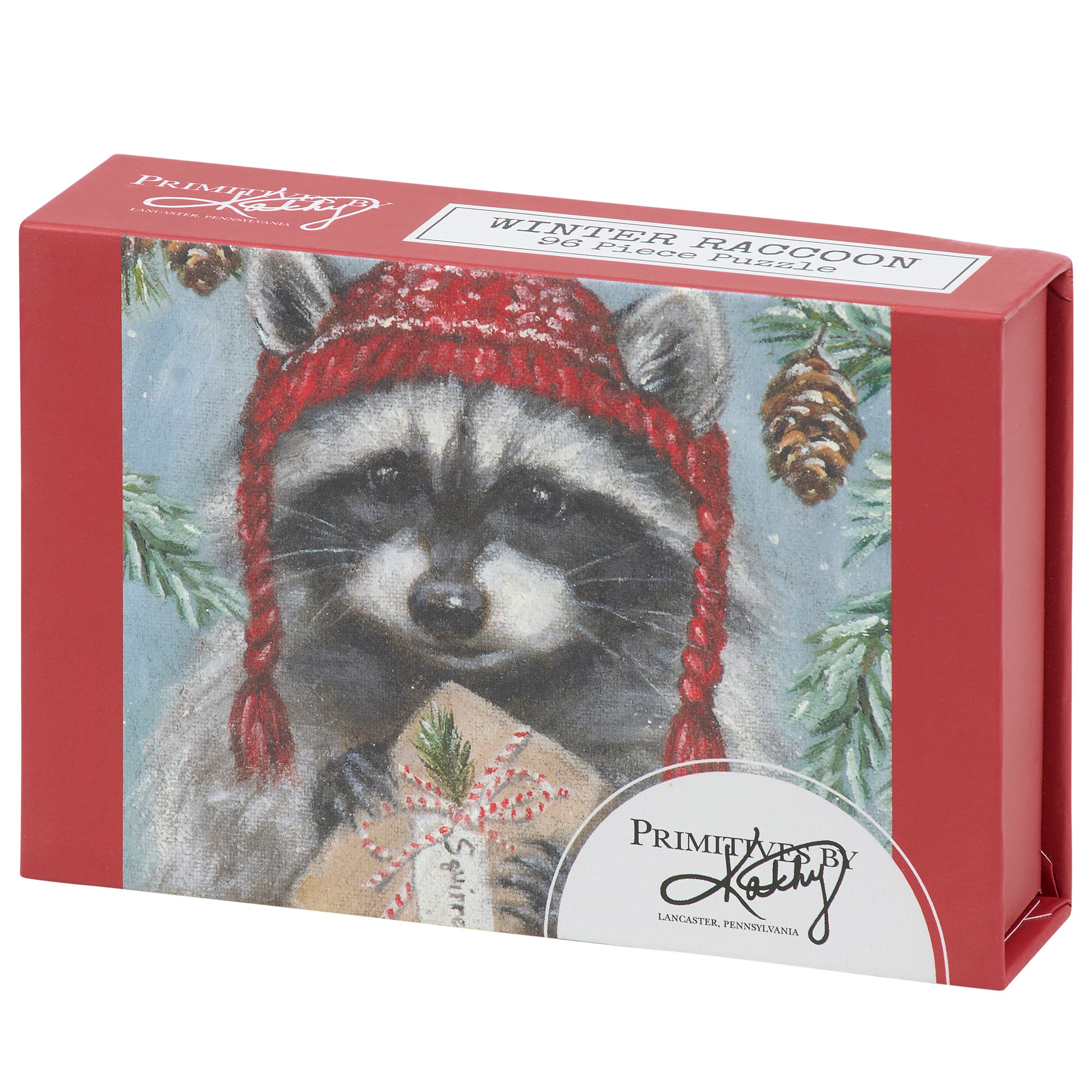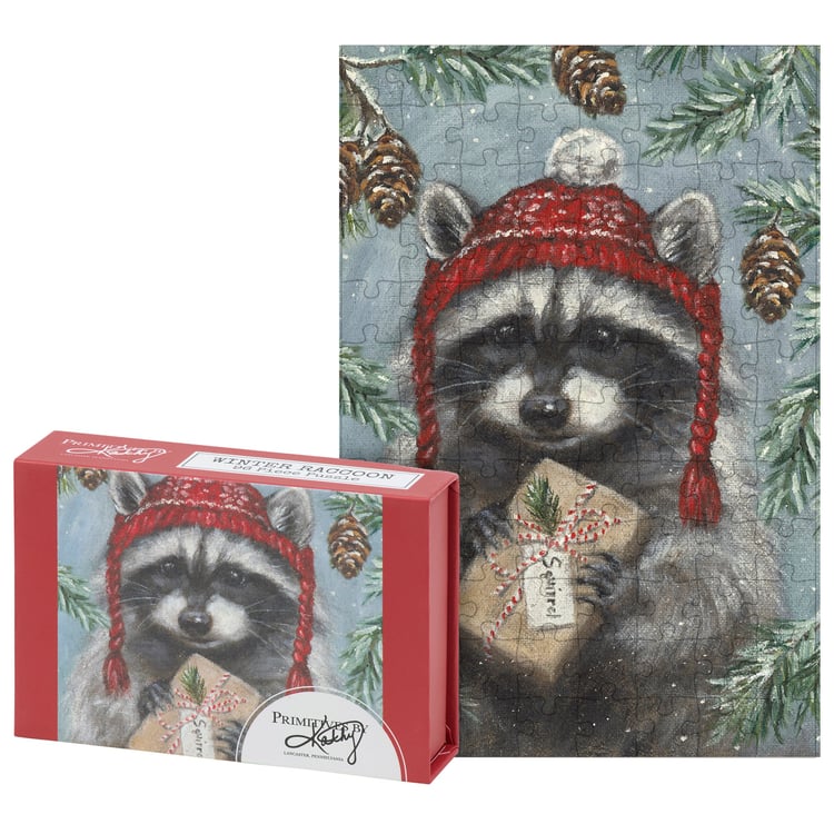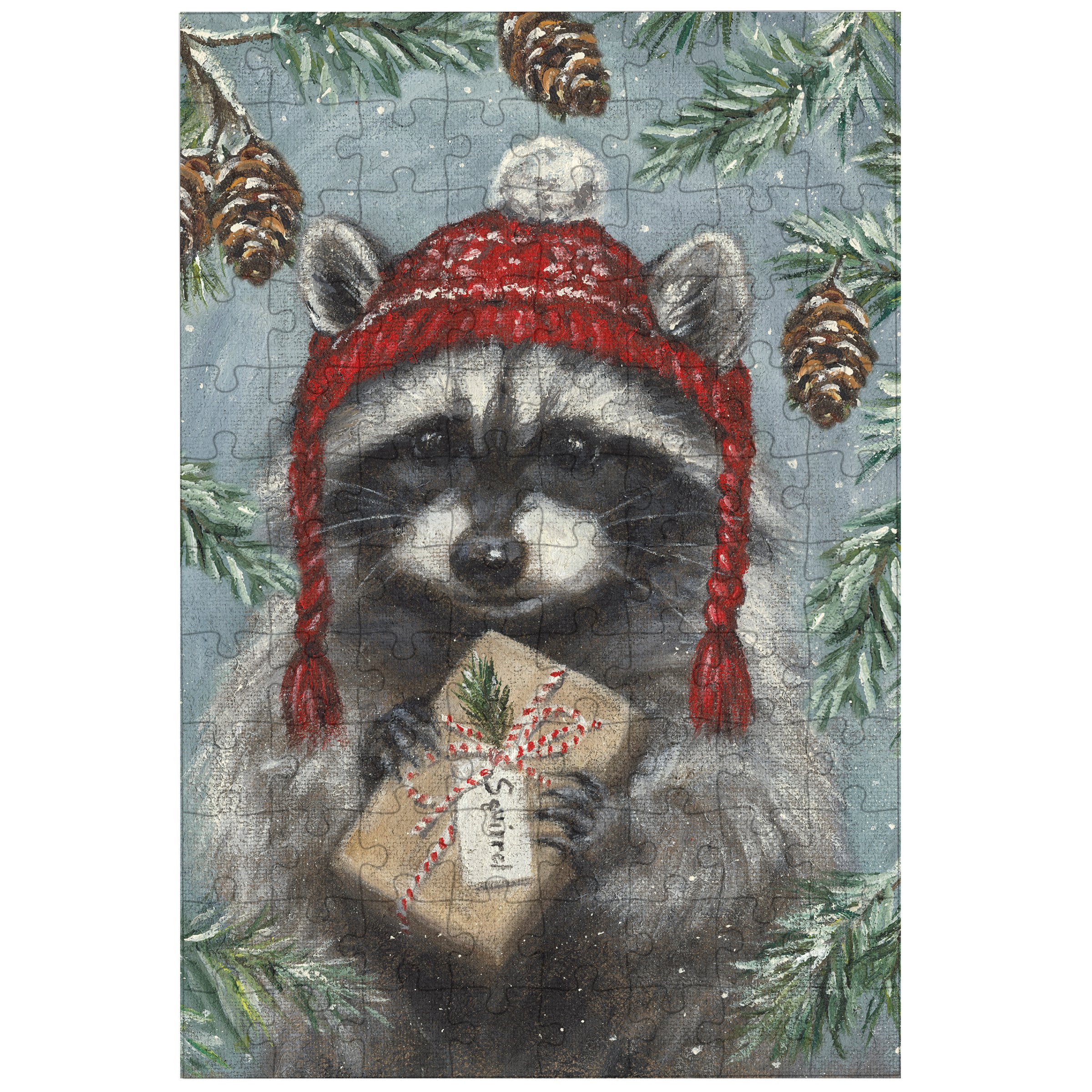A 96 piece puzzle from our Christmas Collection displaying a charming winter scene of a raccoon wearing a winter hat and holding a present that is replicated from original artwork painted onto burlap canvas, giving the art a unique depth and texture. Puzzle pieces are packaged in a reusable bag and enclosed in a sturdy box that is small enough to easily store in an everyday bag or luggage and puzzle whenever the moment arrives. Our Winter Raccoon puzzle includes a print displaying the full puzzle image for reference. Contains small parts; this is not a toy. A nature themed Christmas gift perfect for on the go puzzle fun.