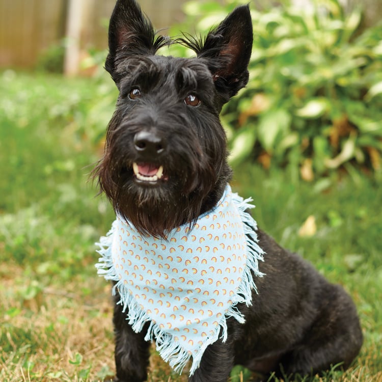 A set of three small pet bandanas from our Pet Collection displaying individual pride-themed designs and fashionable fringed trim. Designs include rainbow paw print pattern, rainbows pattern, and woven rainbow plaid. Pet bandanas coordinate well with complementing scarves and pet bow ties so pet parents and their furry family member can have a sweet matching moment. Each measures 20 inches x 10 inches and fit necks up to 14.5 inches. Machine-washable for convenient cleaning. Our Rainbow Plaid pet bandana set is folded on a kraft paper card with hole to easily hang on rack. A portion of the proceeds from the sale of this Benefit Item will be donated to Lancaster LGBTQ+ Coalition to support their commitment to building a more inclusive Lancaster County abundant in opportunities for LGBTQQIA+ individuals.