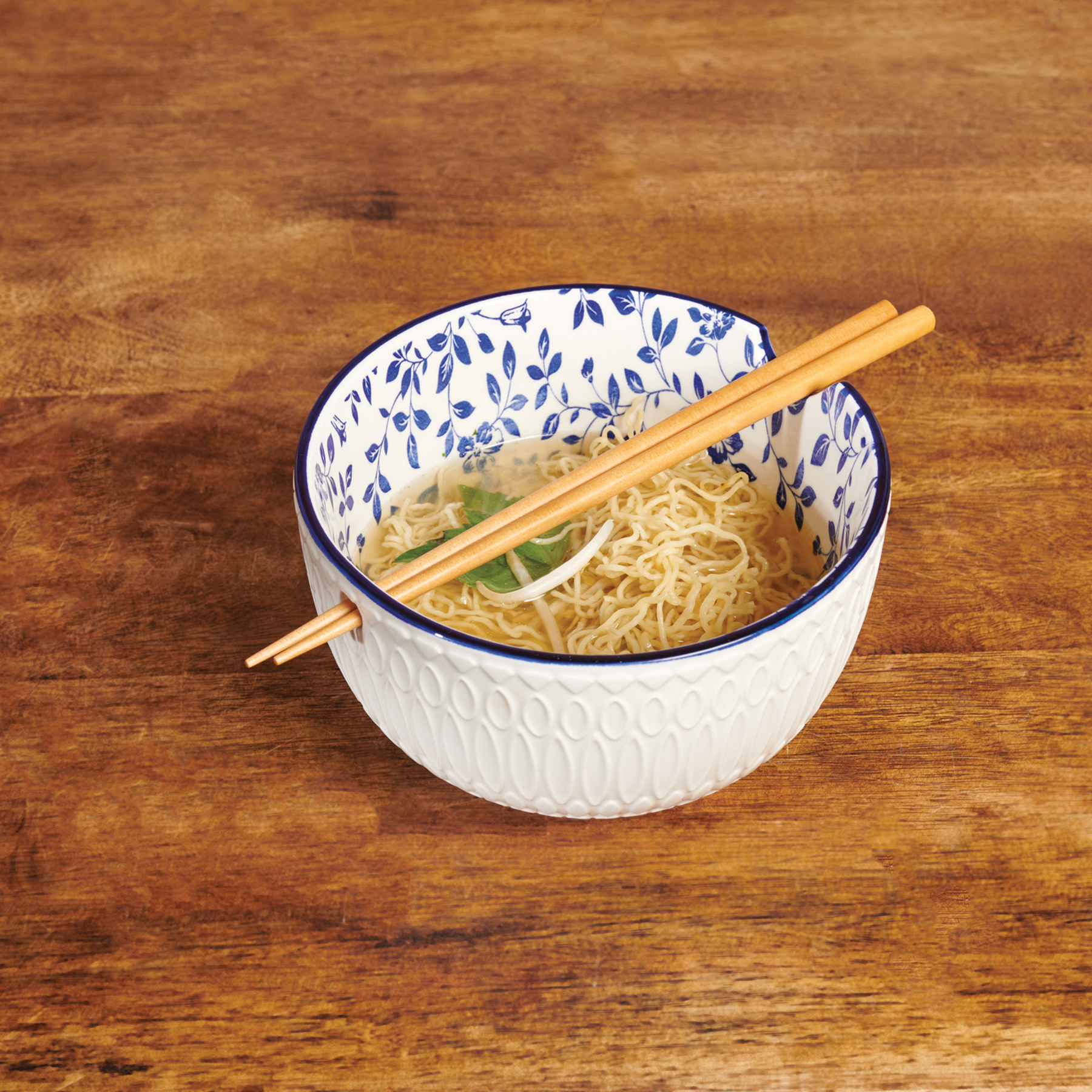 A ceramic ramen bowl set from our Indigo Collection displaying a deep blue floral pattern on the inside of the bowl with ornate white-on-white patterns embossed on the outside. Bowl features hole and cutout to hold the included set of chopsticks making this perfect for enjoying ramen and other noodle dishes. Our Indigo Floral ramen bowl set is microwave, oven, dishwasher, and food safe for convenient use. A lovely and functional everyday kitchen accessory.