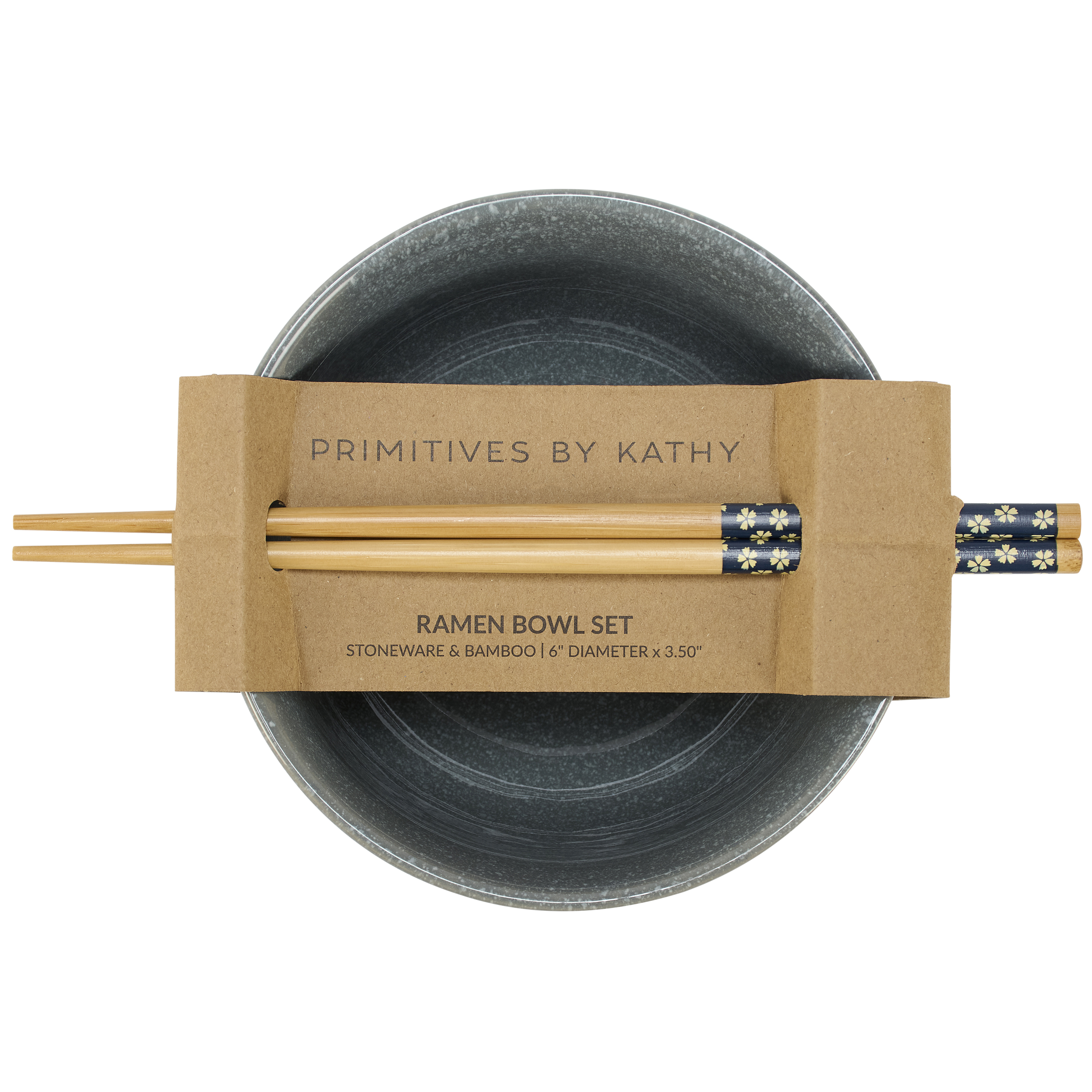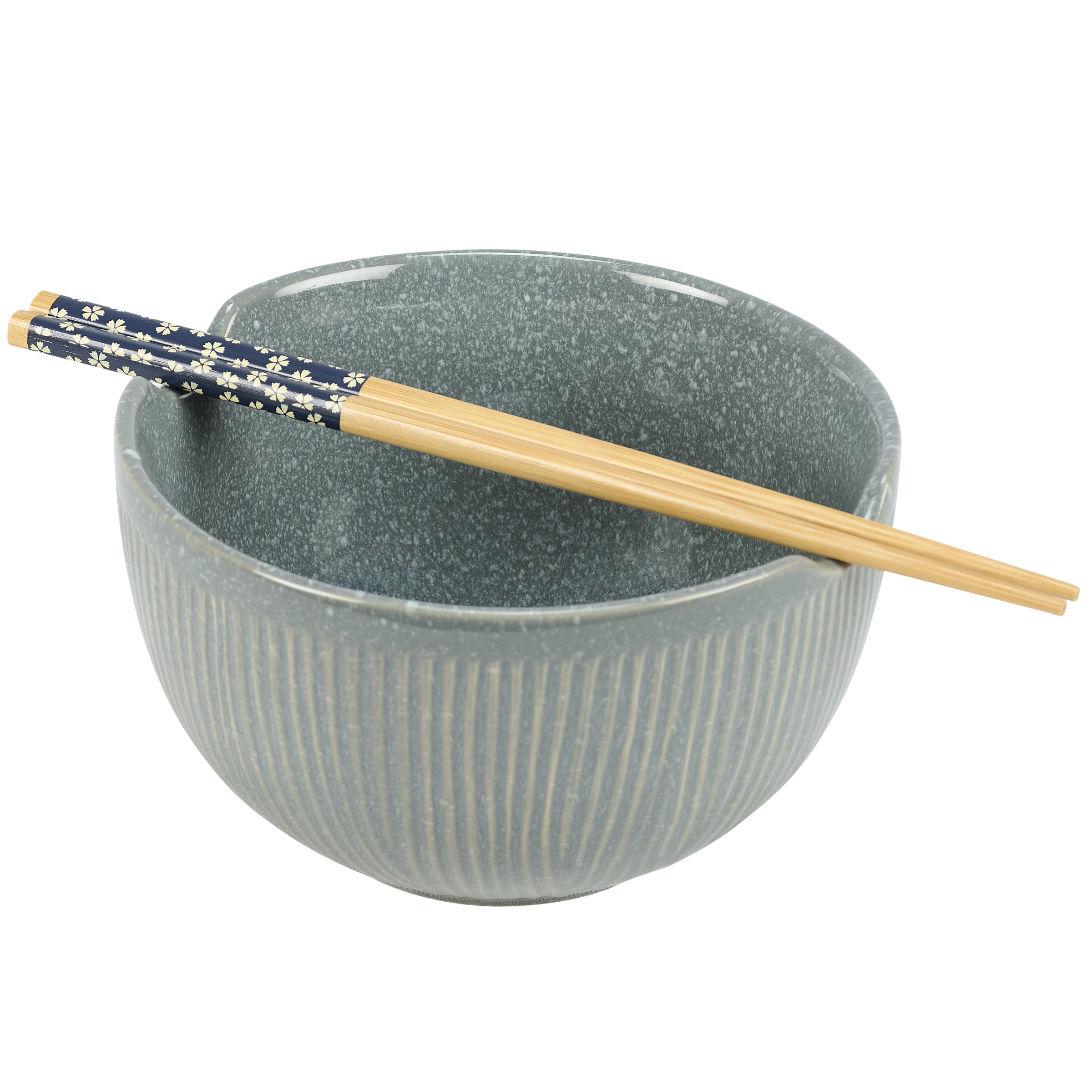 A stoneware ramen bowl set from our Indigo Collection Collection displaying an indigo blue glaze finish with ribbed design on the outside of the bowl. Ribbed bowl features grooves on the rim to hold the included set of floral bamboo chopsticks making this perfect for enjoying ramen and other noodle dishes. Our Ribbed Blue ramen bowl set is microwave, oven, dishwasher, and food safe for easy use. A stylish and functional everyday kitchen accessory.