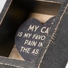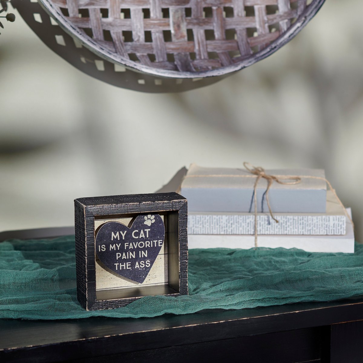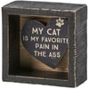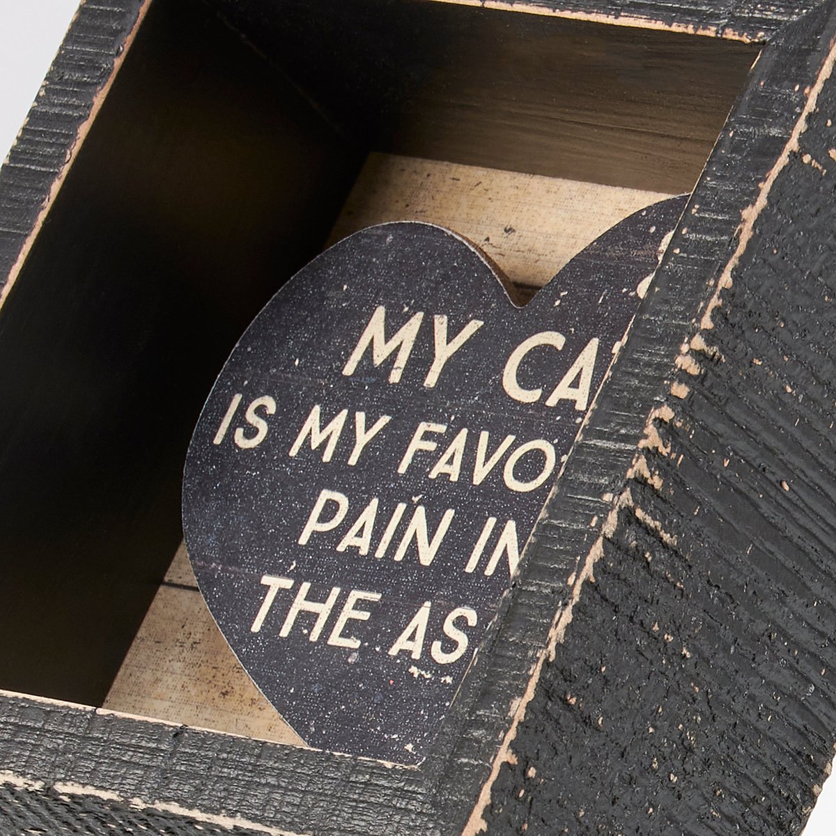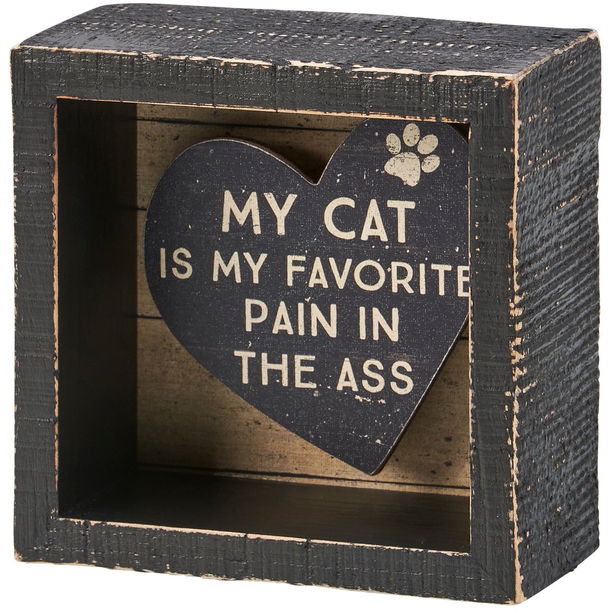 An inset wooden box sign from our Pet Collection displaying a distressed "My Cat Is My Favorite Pain In The Ass" sentiment with dimensional heart accent, paw print design, and slatted wood background print. Our My Cat sign is easy to hang or can free-stand alone. A fun pet-themed home accent that can be easily displayed in any home or work space.