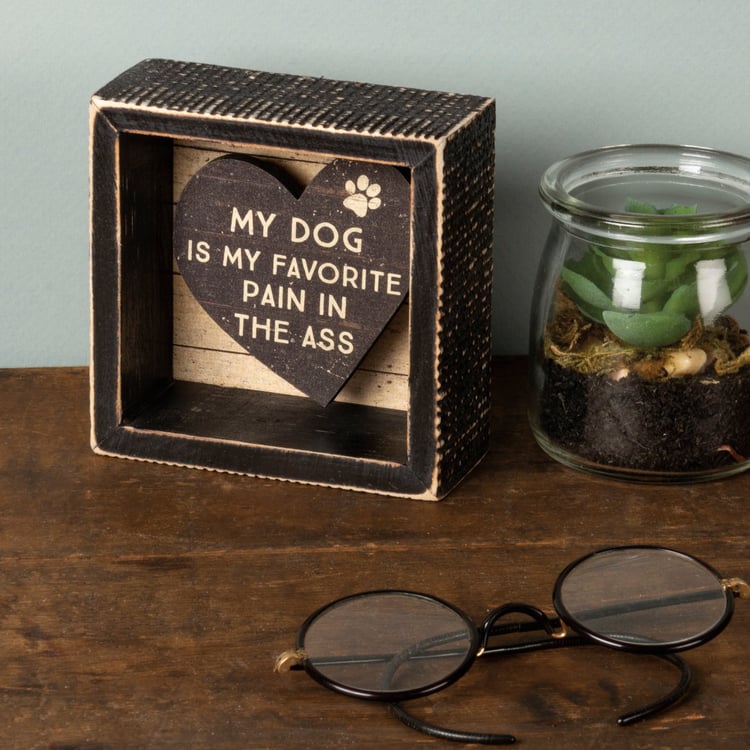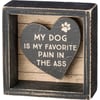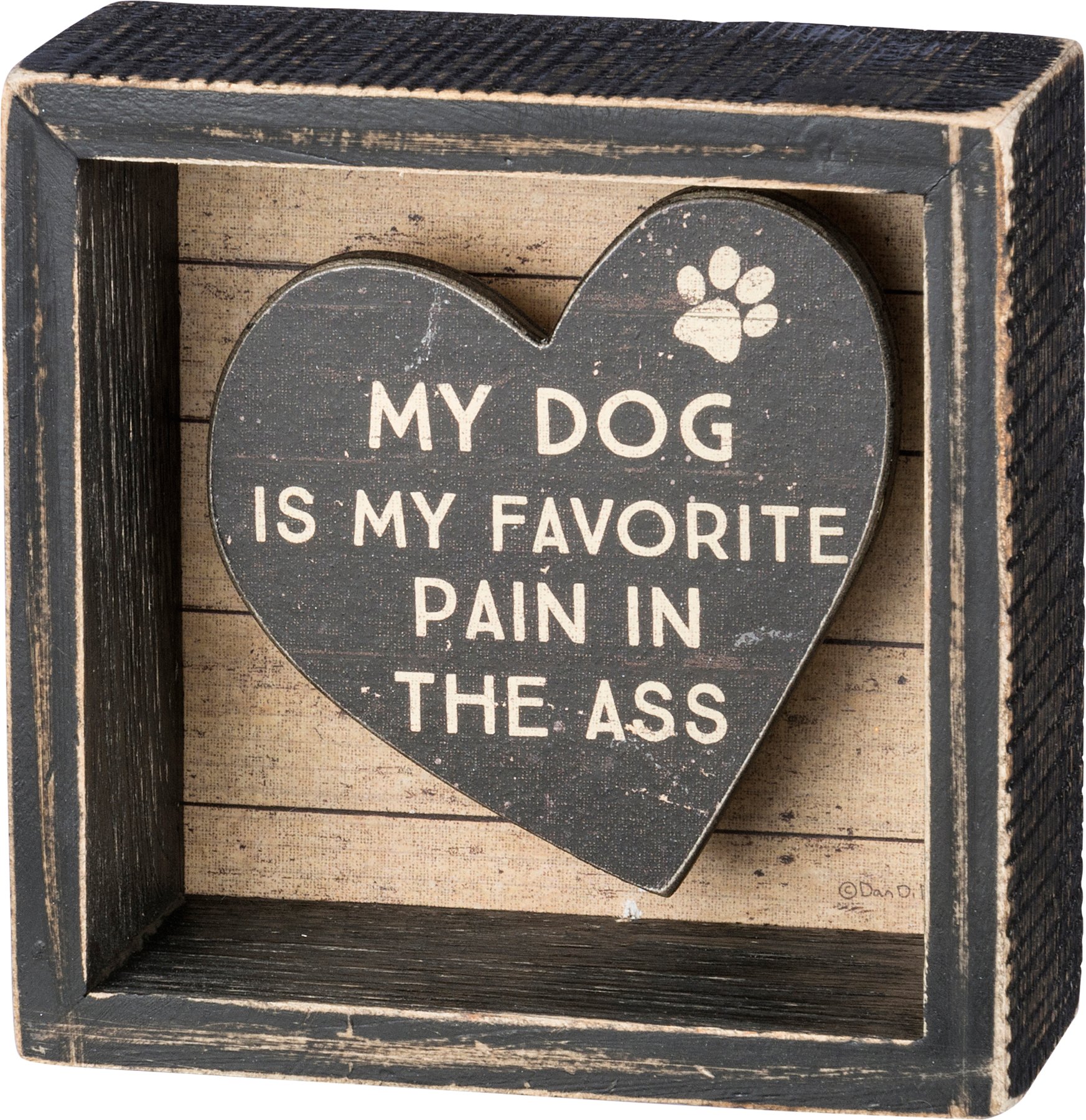 An inset wooden box sign displaying a distressed "My Dog Is My Favorite Pain In The Ass" sentiment with dimensional heart accent, paw print design, and slatted wood background print. Our My Dog sign is easy to hang or can free-stand alone. A fun pet-themed home accent that can be easily displayed in any home or work space.