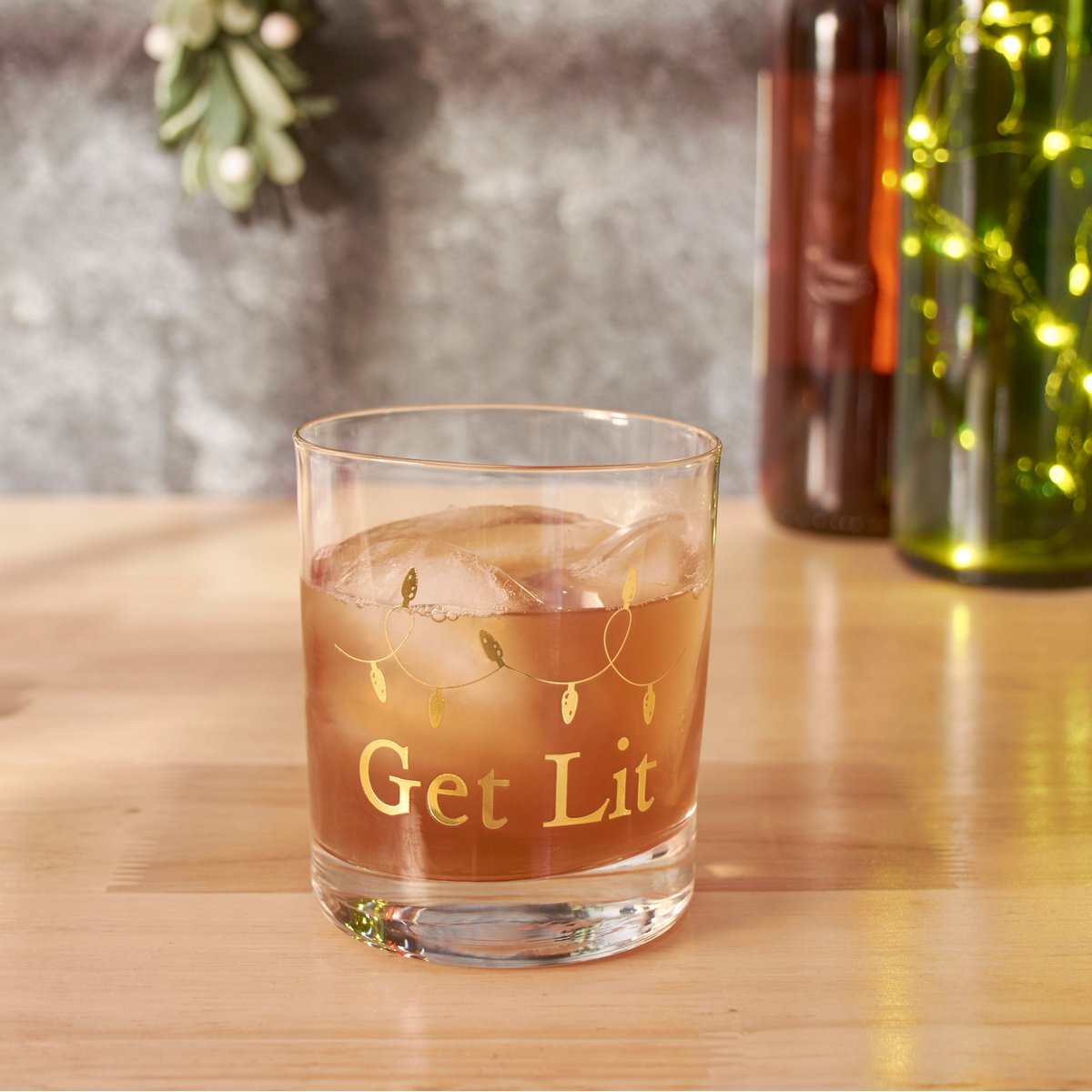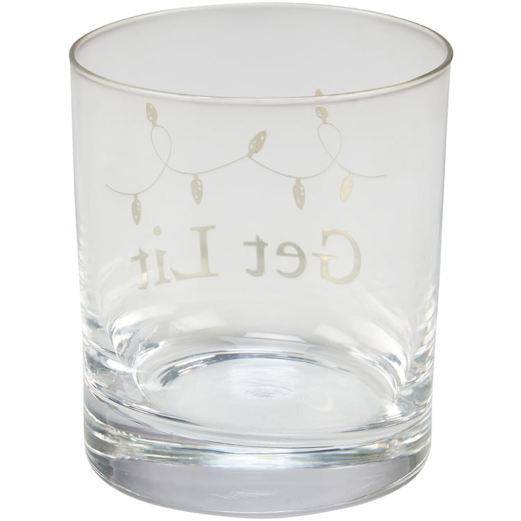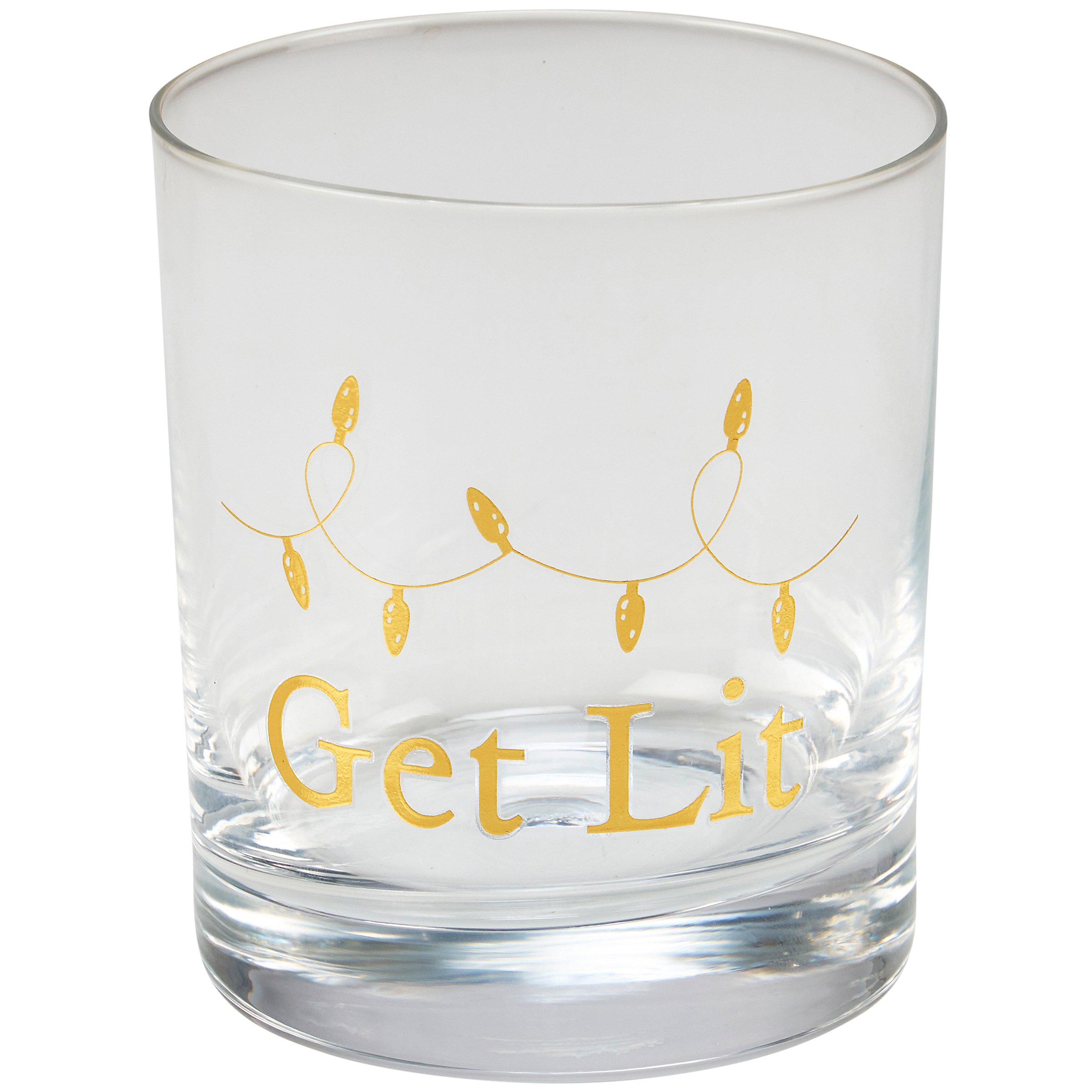 A 9 oz rocks glass displaying a metallic gold design of Christmas lights with humorous sentiment that reads "Get Lit." Our Get Lit rocks glass coordinates well with drinkware from ourĀ Christmas Collection. Hand-wash only. Fun seasonal drinkware that is also great for gifting.