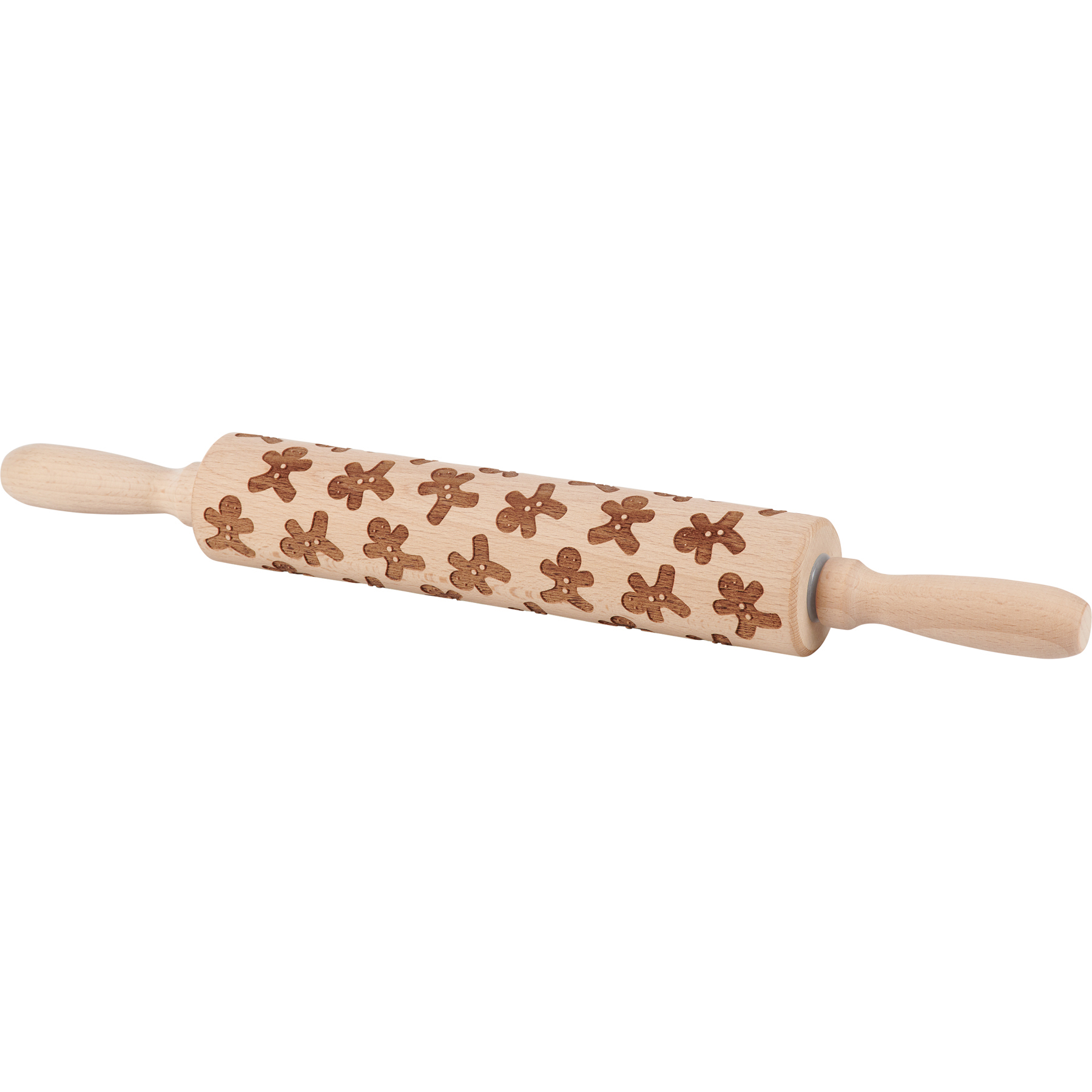 A large wooden rolling pin from our Christmas Collection featuring debossed gingerbread men designs along the roller that create fun embossed patterns in pre-rolled dough. Our Gingerbread Men large wooden rolling pin features natural beech wood and is hand-wash recommended. Hangtag is tied to pin with jute. A fun seasonal kitchen accessory that is also great for gifting.