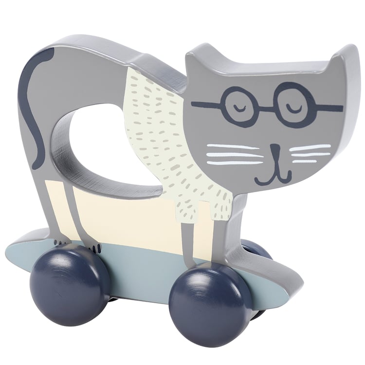 A fun wooden rolling toy from our Baby & Kids Collection displaying a cute pet inspired double-sided design replicated from original block print style art. Pet rolling toy features wooden cat on wheels wearing clothes. Our Cat rolling toy is perfect for play with children 12 months or older and looks great on the shelf as child's room décor when not in use. A fun pet-themed gift for baby showers or everyday moments.