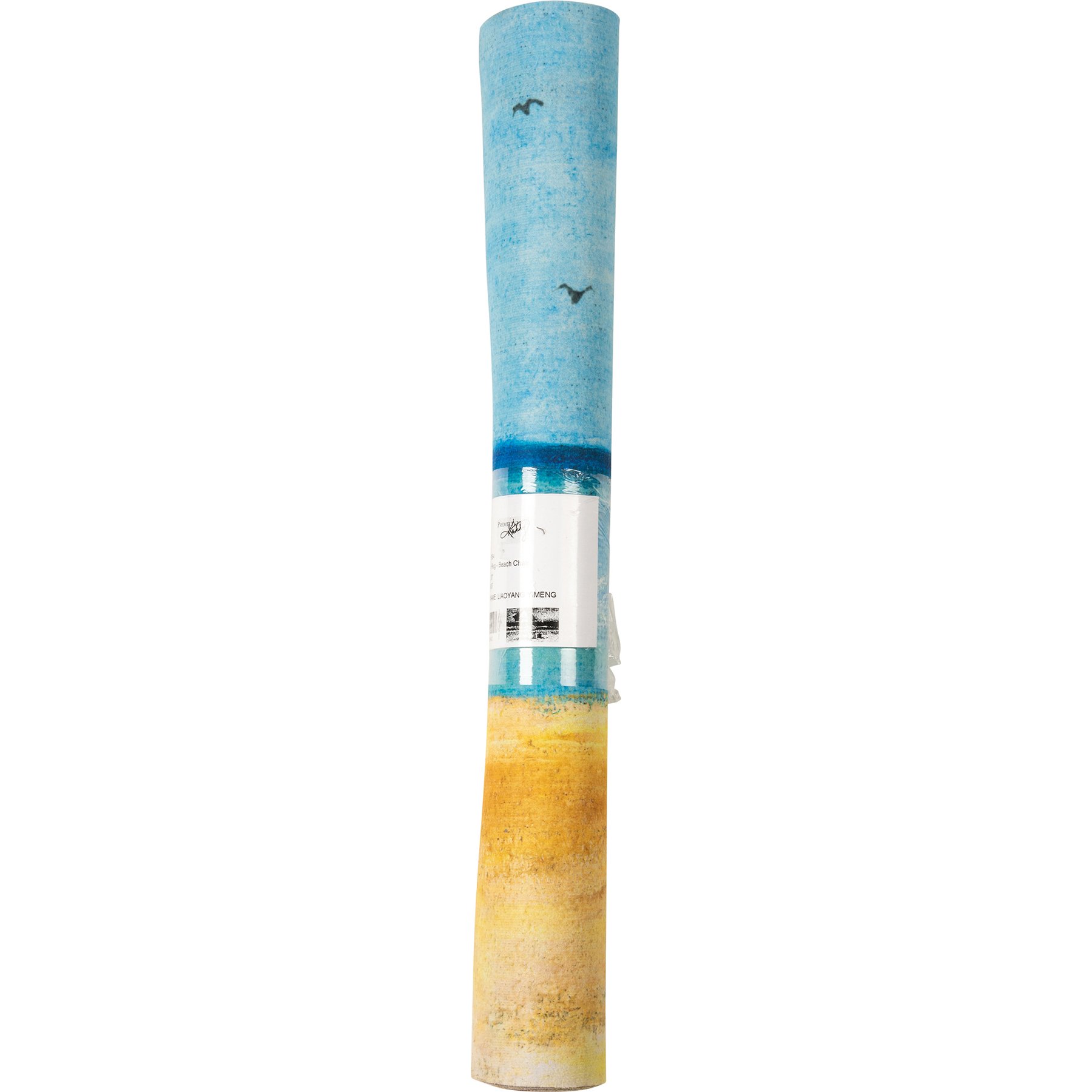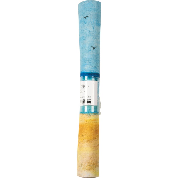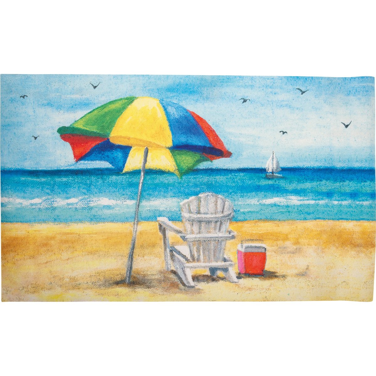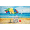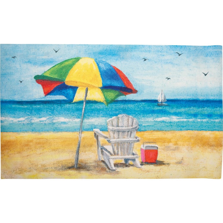 A polyester rug from our Beach Collection depicting a beach chair, umbrella, cooler, and sailboat. Design is replicated from original artwork painted onto burlap canvas, giving the art a unique depth and texture. Rug includes skid-resistant PVC backing and is neatly rolled with a tag featuring full design. Our Beach Chair rug is intended for indoor or sheltered outdoor use. Spot cleaning recommended.