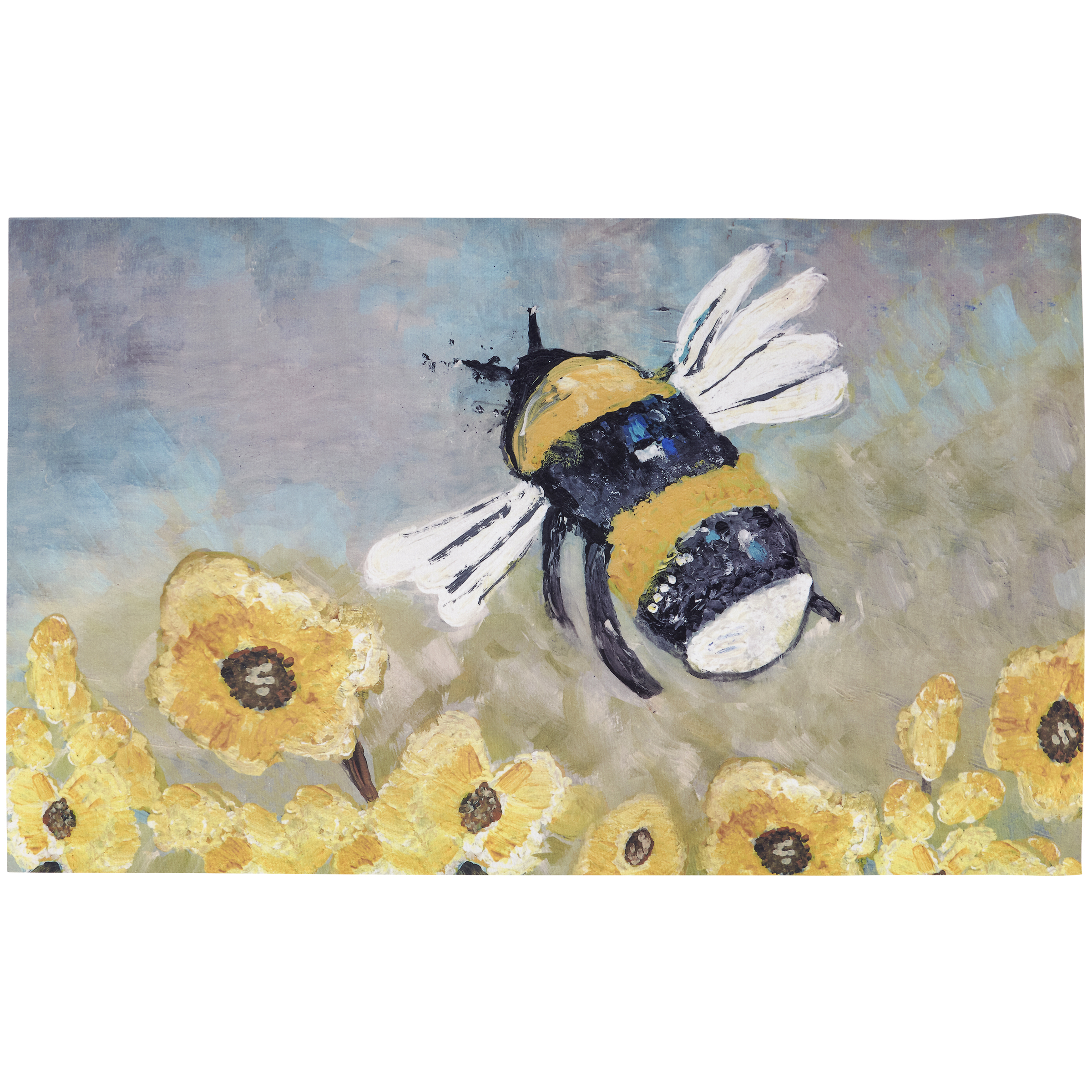 A polyester rug from our Friendship Heart Gallery Collection displaying hand painted art of a bumblebee buzzing around yellow flowers. Design is replicated from original art created at the Friendship Heart Gallery in downtown Lancaster, PA that supports artists with intellectual disabilities and autism. Bumblebee rug can be used indoor or outdoor and features skid-resistant backing to help stay in place. Spot cleaning recommended. Our Bumblebee rug comes packaged neatly rolled with tag displaying full rug design. A bee-themed home accent that adds functional style.