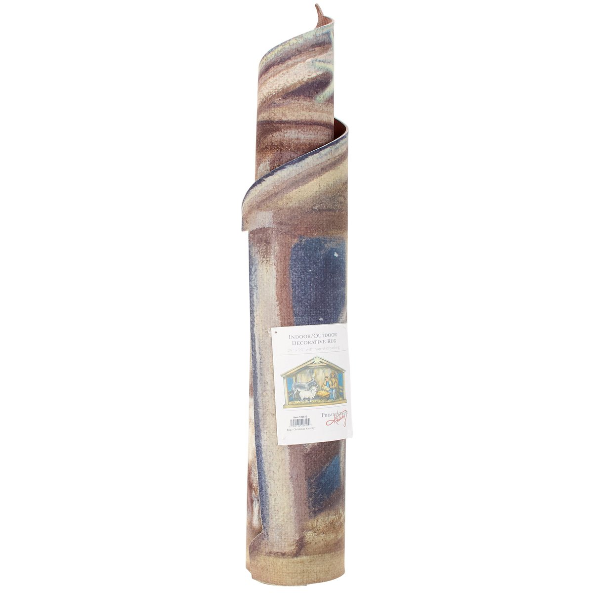 A polyester rug from our Christmas Collection cut in the shape of the displayed nativity scene. Nativity design is replicated from original artwork painted onto burlap canvas, giving the art a unique depth and texture. Seasonal rug can be used indoor or outdoor and features skid-resistant backing to help stay in place. Spot cleaning recommended. Our Christmas Nativity rug comes packaged neatly rolled with tag displaying full rug design. A nativity-themed Christmas home accent that adds functional style.