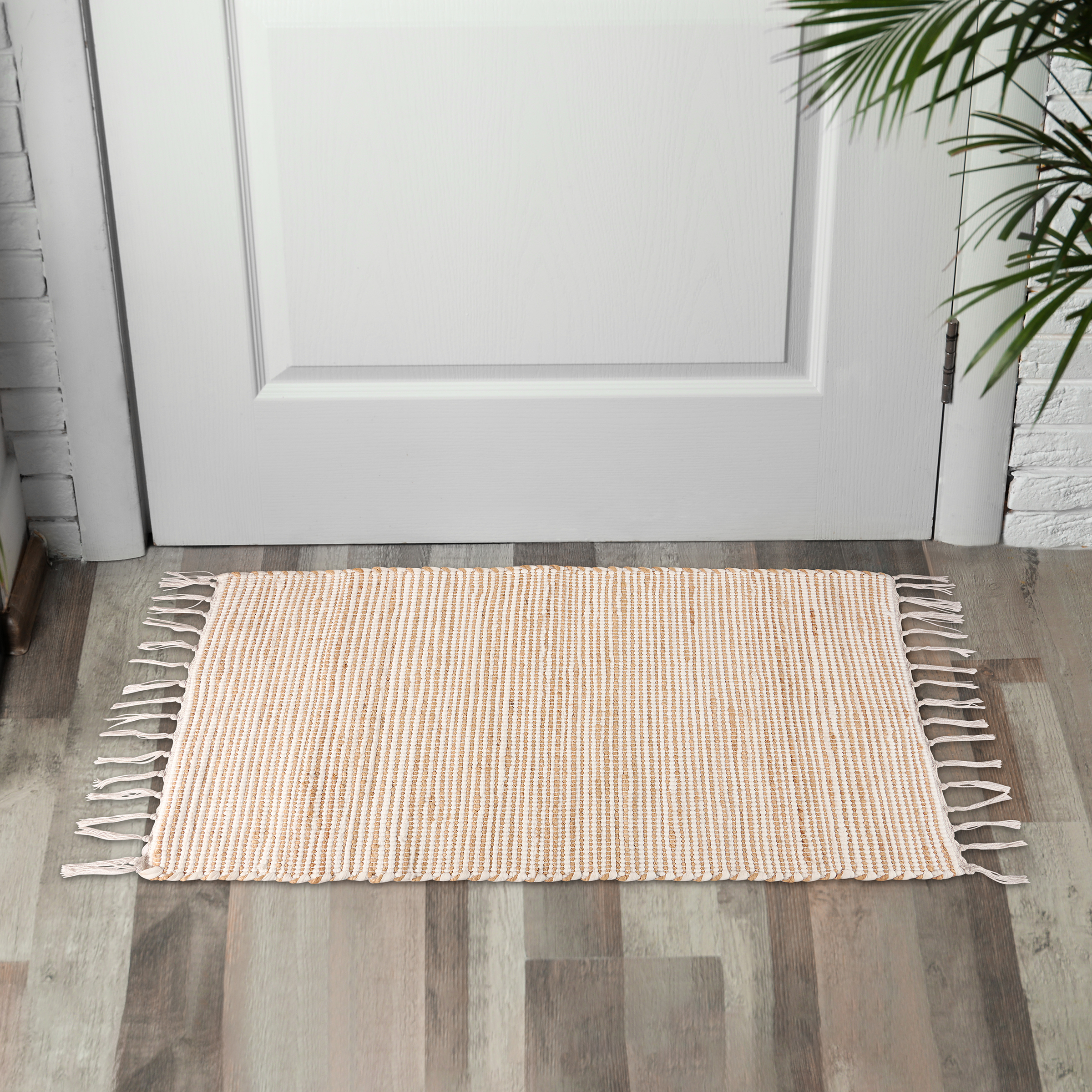 A cotton rug from our Home Collection displaying a neutral cream and brown woven design with tassels on the sides. Woven rug can be used indoor or covered outdoor and features skid-resistant backing to help stay in place. Spot cleaning recommended. Our Cream Woven rug comes packaged neatly rolled with hangtag. A neutral home accent that coordinates with a variety of home decor.