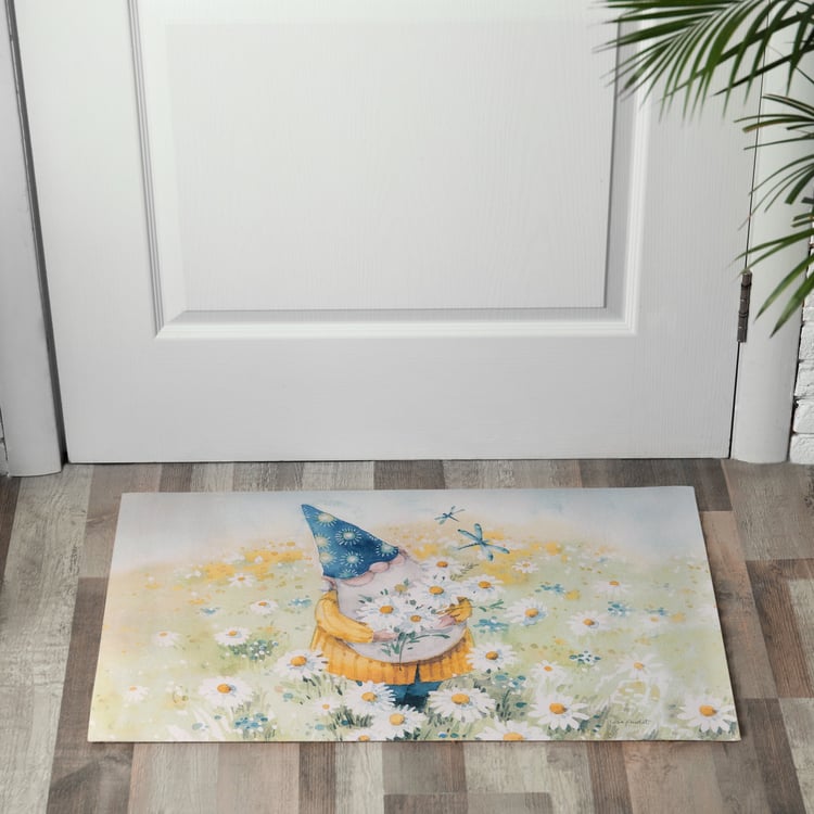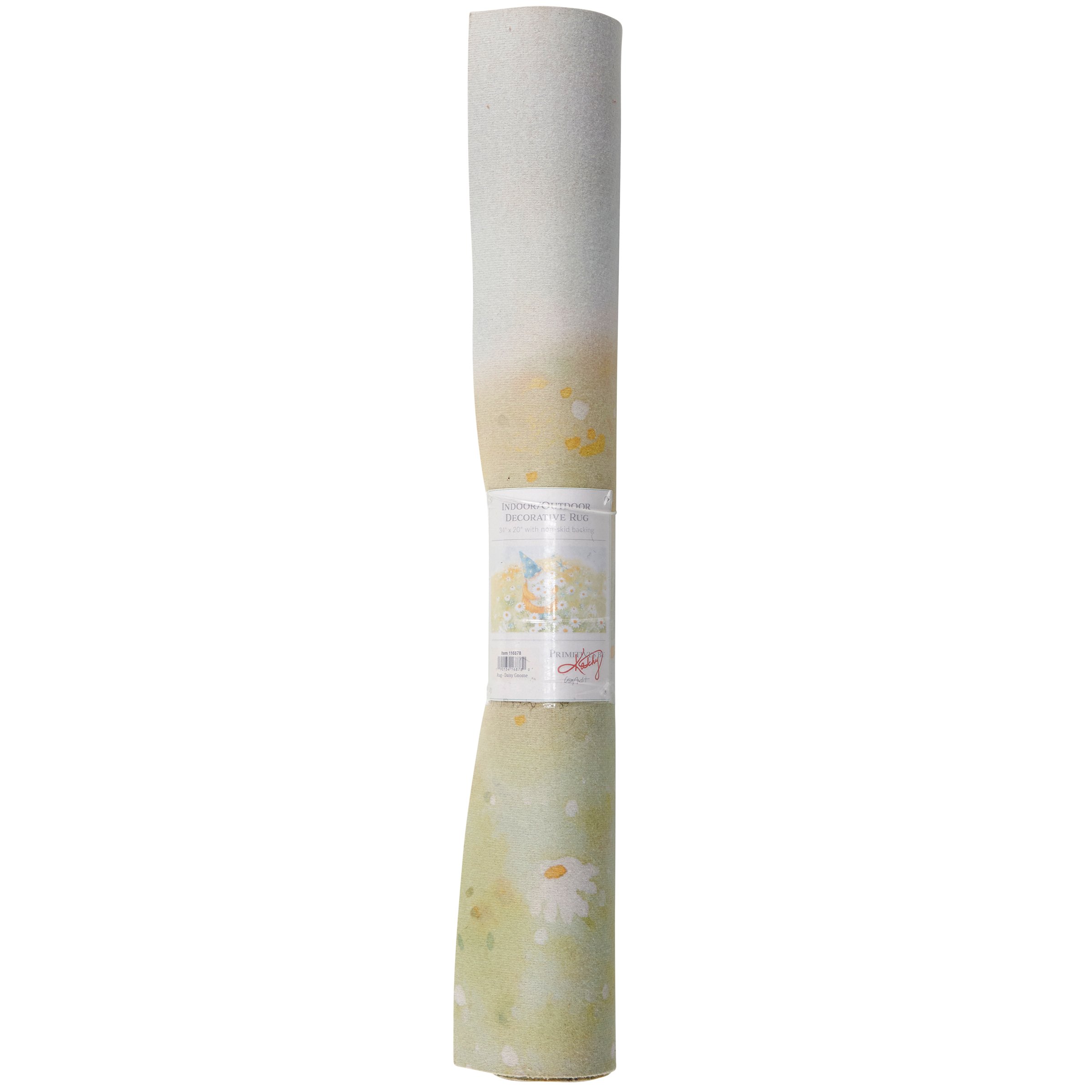 A polyester rug from our Garden Collection displaying of a scene of a cheerful gnome gathering daisies and looking at blue dragonflies. Design is replicated from original art hand painted in a delicate watercolor style. Rug can be used indoor or outdoor and features skid-resistant backing to help stay in place. Spot cleaning recommended. Our Daisy Gnome rug comes packaged neatly rolled with tag displaying full rug design. A charming daisy-themed home accent that adds functional style.