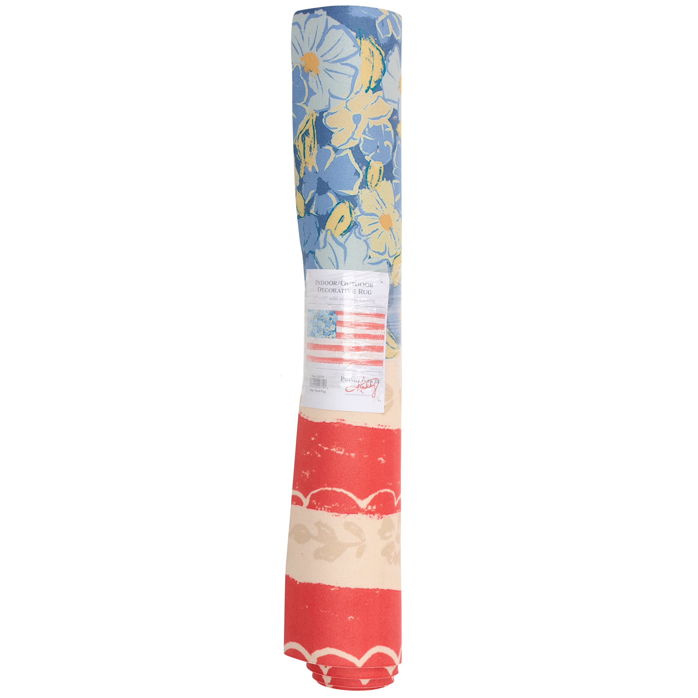 A polyester rug from our Patriotic Collection displaying a folk art inspired design of an American flag featuring floral details. Floral flag design is replicated from original art hand painted in a unique watercolor style. Patriotic rug can be used indoor or outdoor and features skid-resistant backing to help stay in place. Spot cleaning recommended. Our Floral Flag rug comes packaged neatly rolled with tag displaying full rug design. A patriotic home accent perfect for 4th of July and Memorial Day decorating or celebrating stars and stripes all year round.