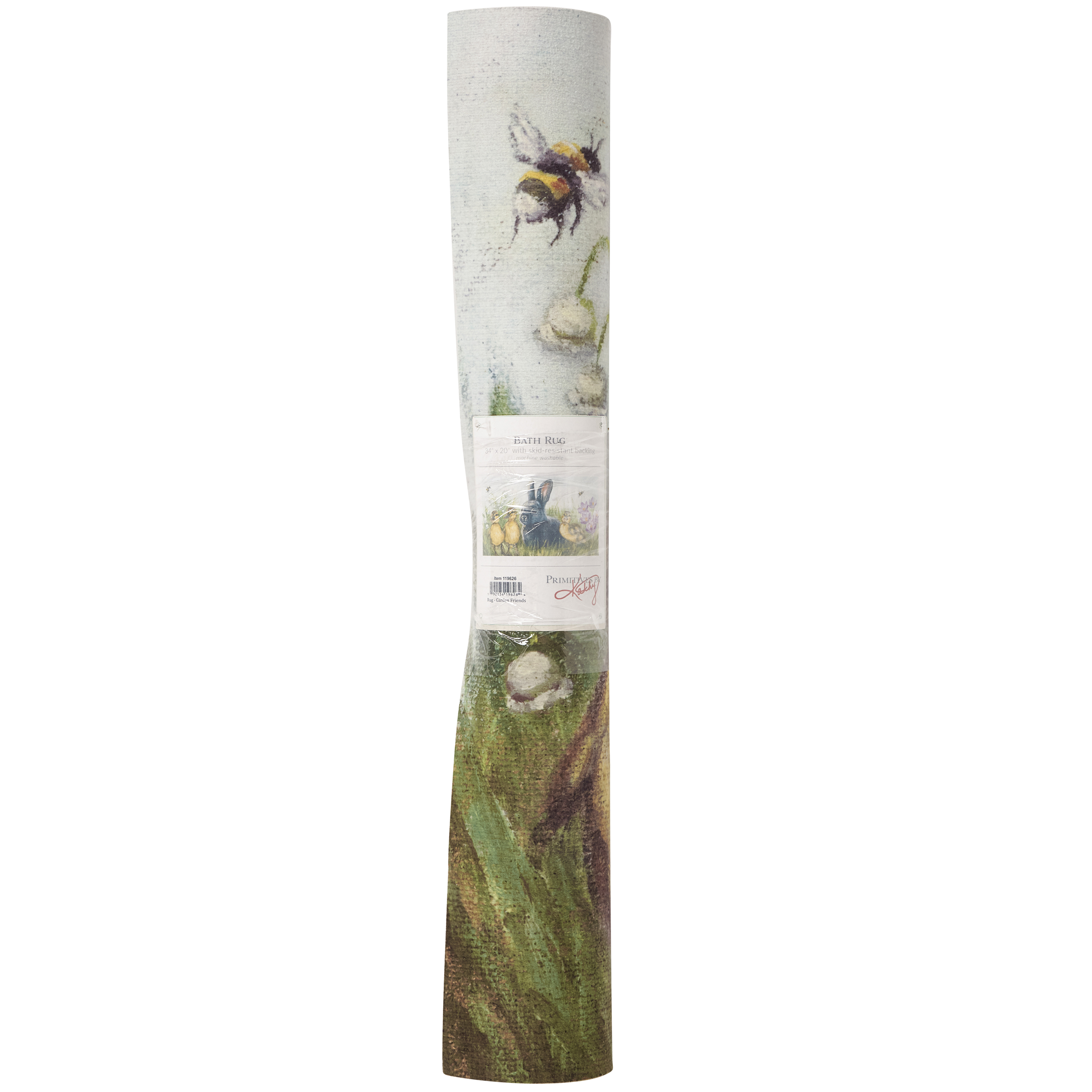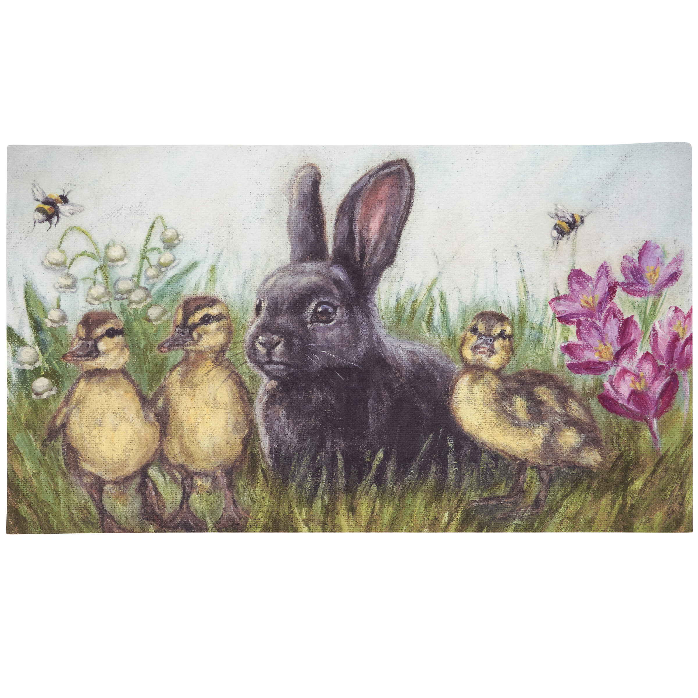 A polyester rug from our Easter & Spring Collection displaying a comforting scene of a bunny with ducklings in a garden of spring flowers and bees. Design is replicated from original artwork painted onto burlap canvas, giving the art a unique depth and texture. Rug can be used indoor or outdoor and features skid-resistant backing to help stay in place. Spot cleaning recommended. Our Garden Friends rug comes packaged neatly rolled with tag displaying full rug design. A charming seasonal home accent that adds functional style.
