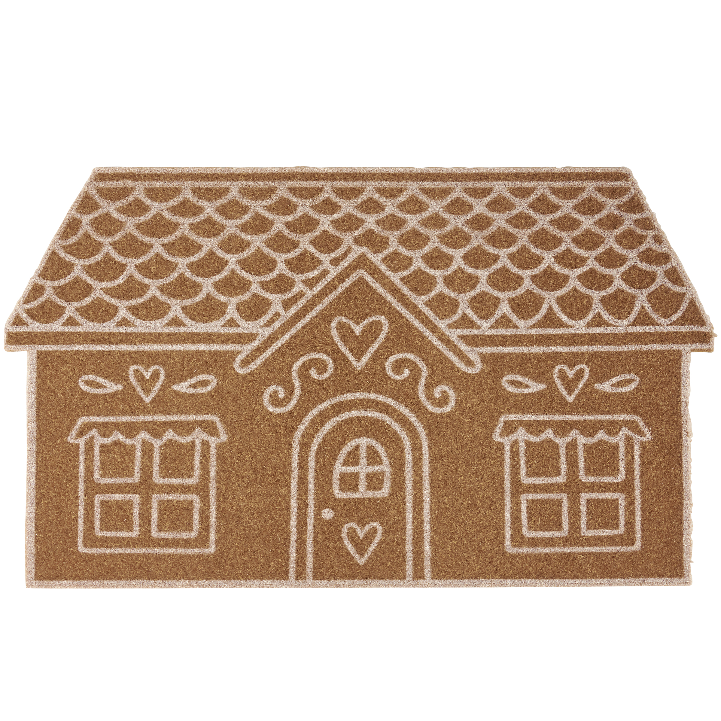 A durable faux coir rug from our Christmas Collection in the shape of the displayed gingerbread house design. Faux coir offers the benefit of not shedding over time, unlike natural coir rugs, so the integrity of the design and colors will last longer. Rug can be used indoor or outdoor and features skid-resistant backing to help stay in place. Spot cleaning recommended. Our Gingerbread House rug comes packaged neatly rolled with tag displaying full rug design. A gingerbread-themed home accent that adds functional seasonal style.