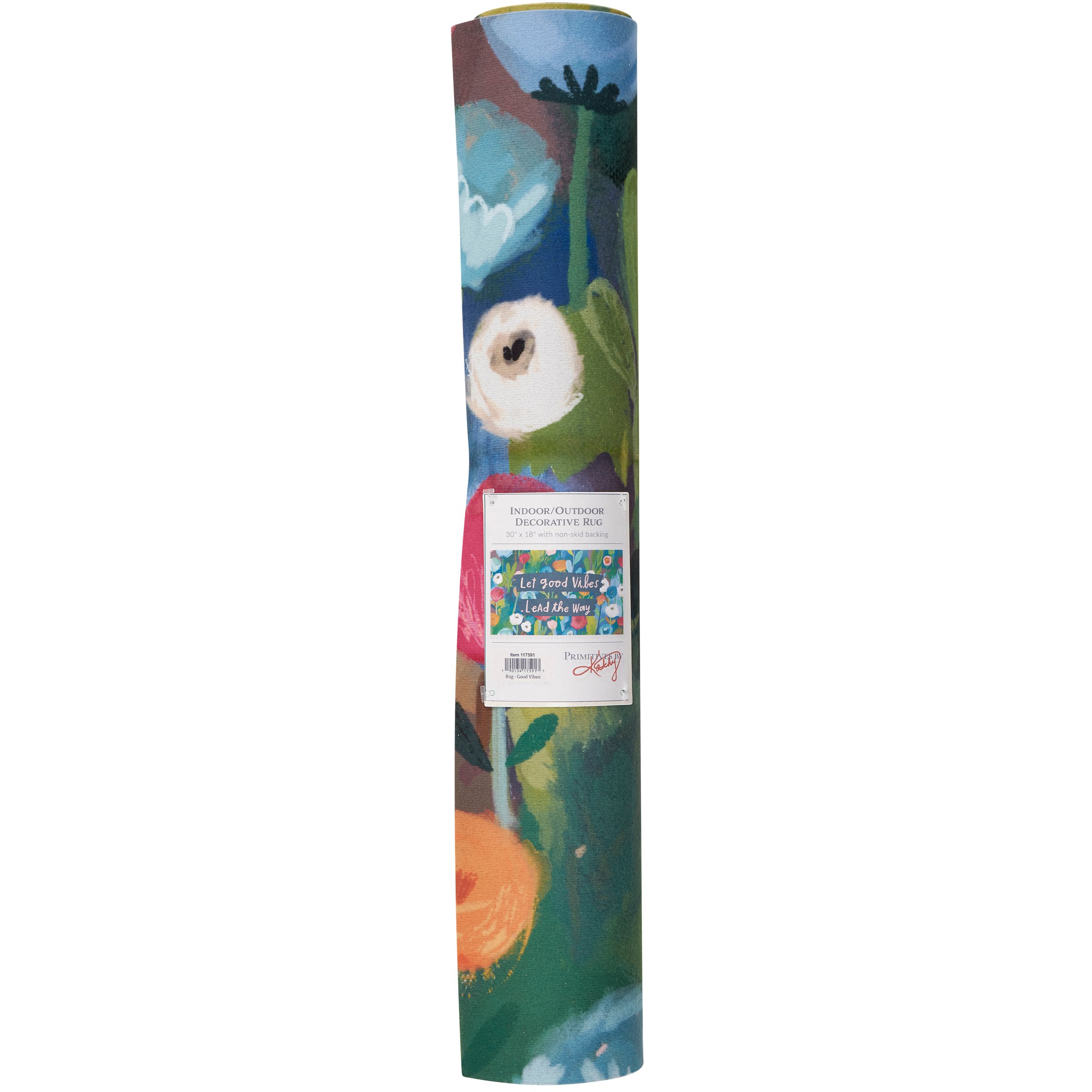 A polyester rug from our Inspiration & Blooms Collection displaying a vibrant hand illustrated design of abstract florals behind and inspirational sentiment that reads "Let Good Vibes Lead The Way." Rug can be used indoor or outdoor and features skid-resistant backing to help stay in place. Spot cleaning recommended. Our Good Vibes rug comes packaged neatly rolled with tag displaying full rug design. A fun pet-themed home accent that adds functional style.